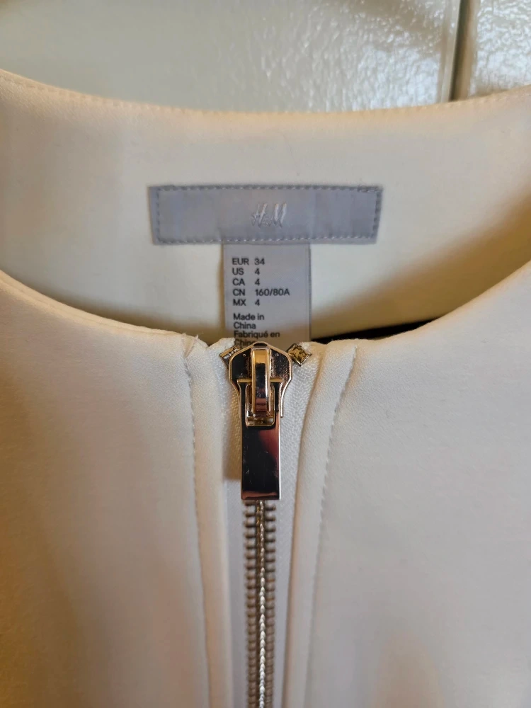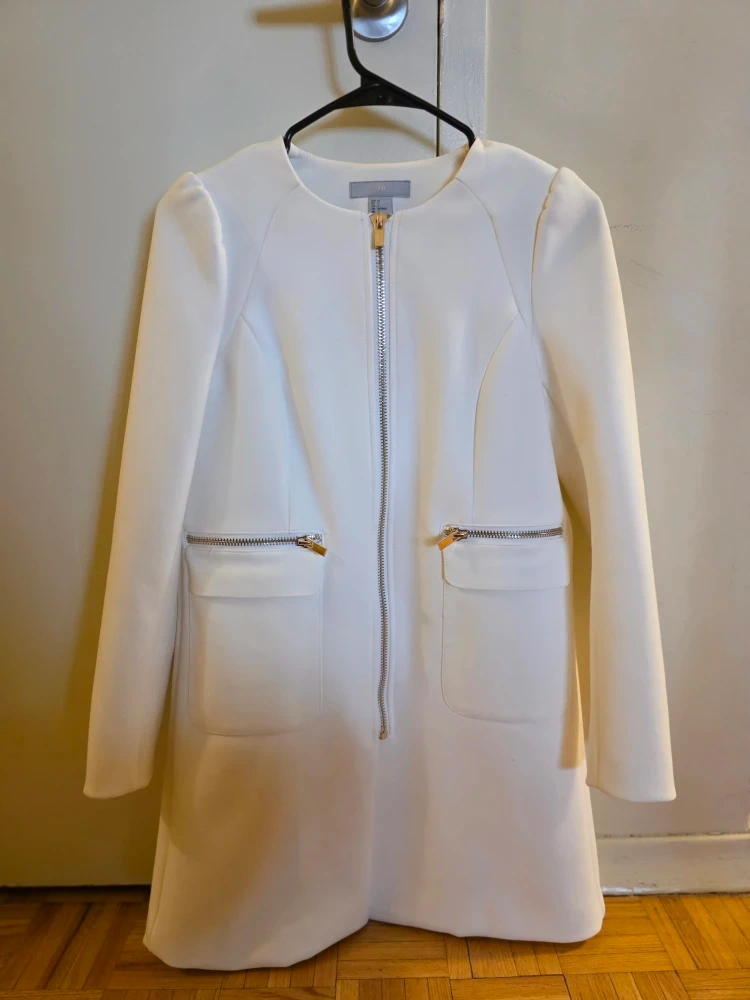 Selling a lovely white coat from H&M! It's a size 4 and features a stylish zipper down the front. Perfect for layering or wearing on its own during milder weather.