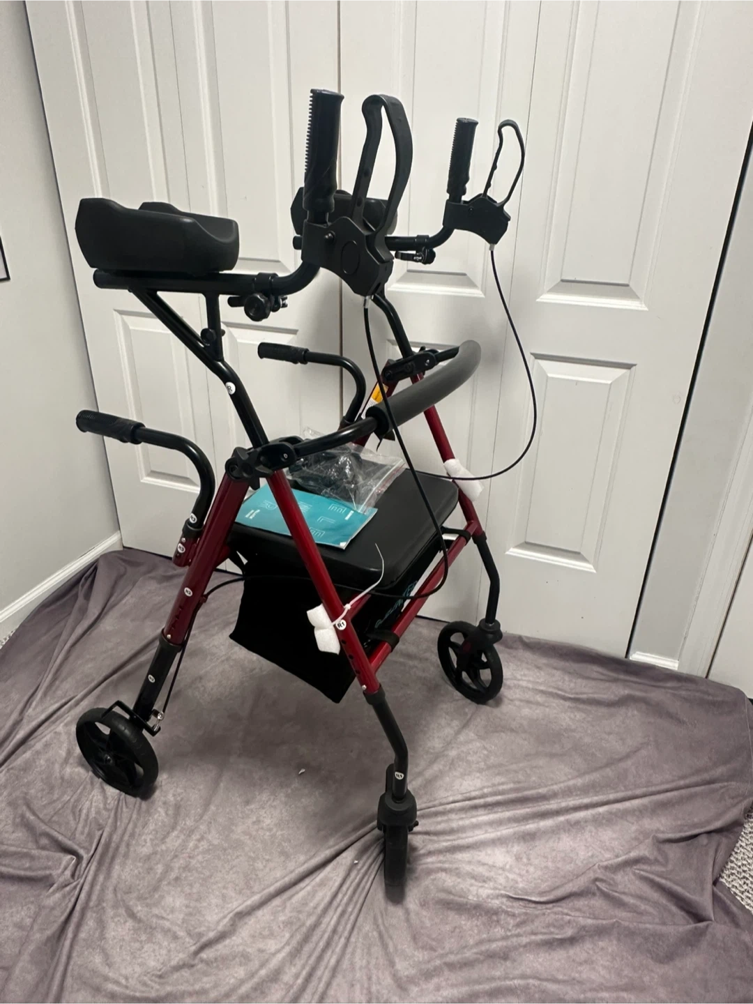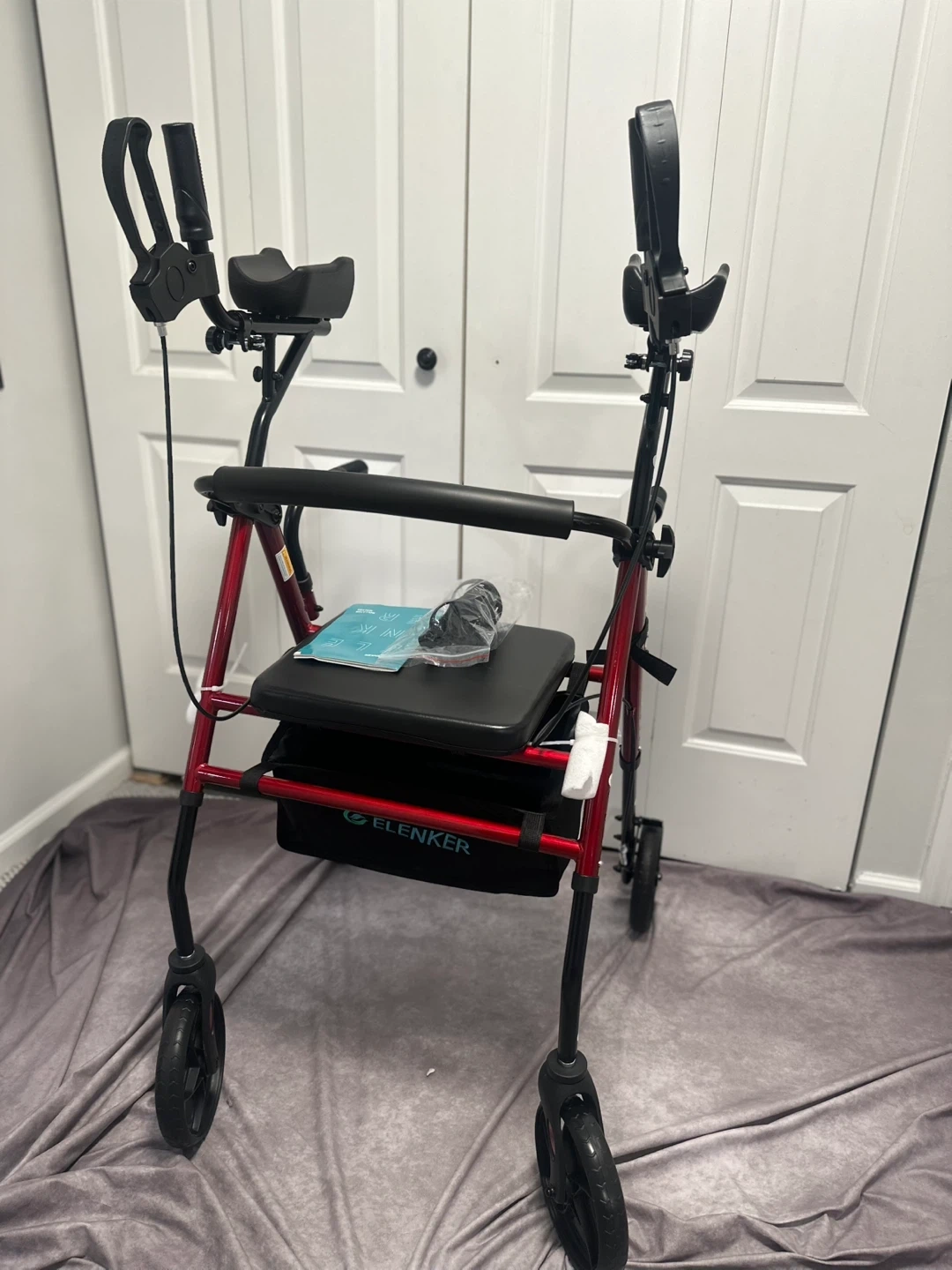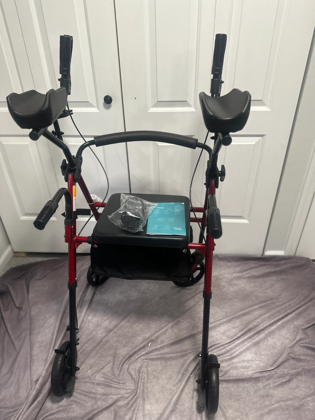 New. Ideal Cushion for Sitting: Adjustable height padded seat with backrest, provides customized comfort, more comfortable than other mesh material seats. Convenient for Going Outside: Equipped with under-seat pouch, big enough for personal items. Cane/Umbrella Holder, leaves your hands free. Rolling Stable & Dual Brake System: Anti-tip over Frame and 8” Solid PVC Wheels, easy to maneuver on most surfaces. Squeeze hand brake to slow, push to lock rear wheels ensure safe in rolling and sitting. Fully Adjustable Frame & Folds Flat: Forearm tube, handle bar and leg tube are adjustable, provide more comfortable and natural posture. One-Hand Folding, easy to transport or store.
