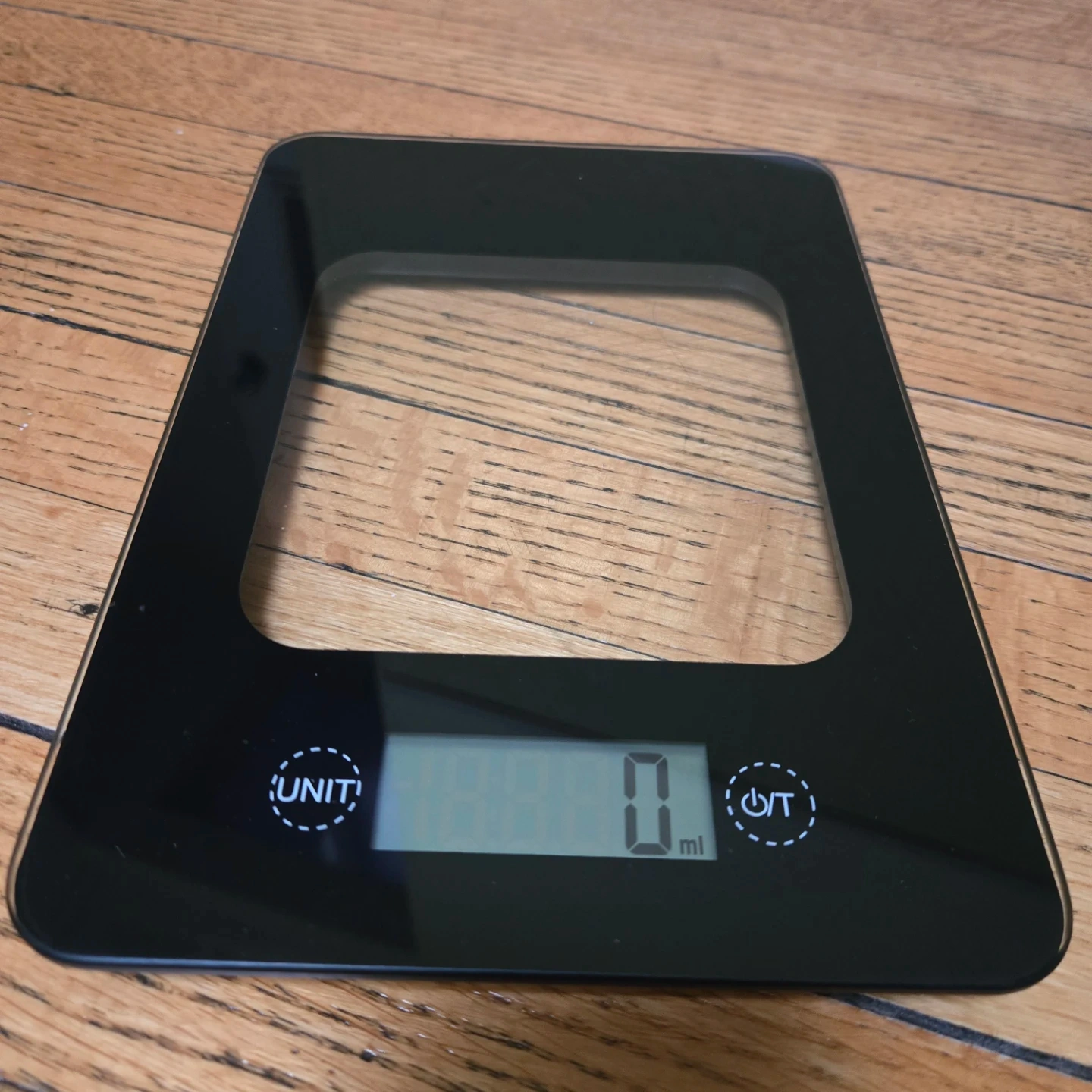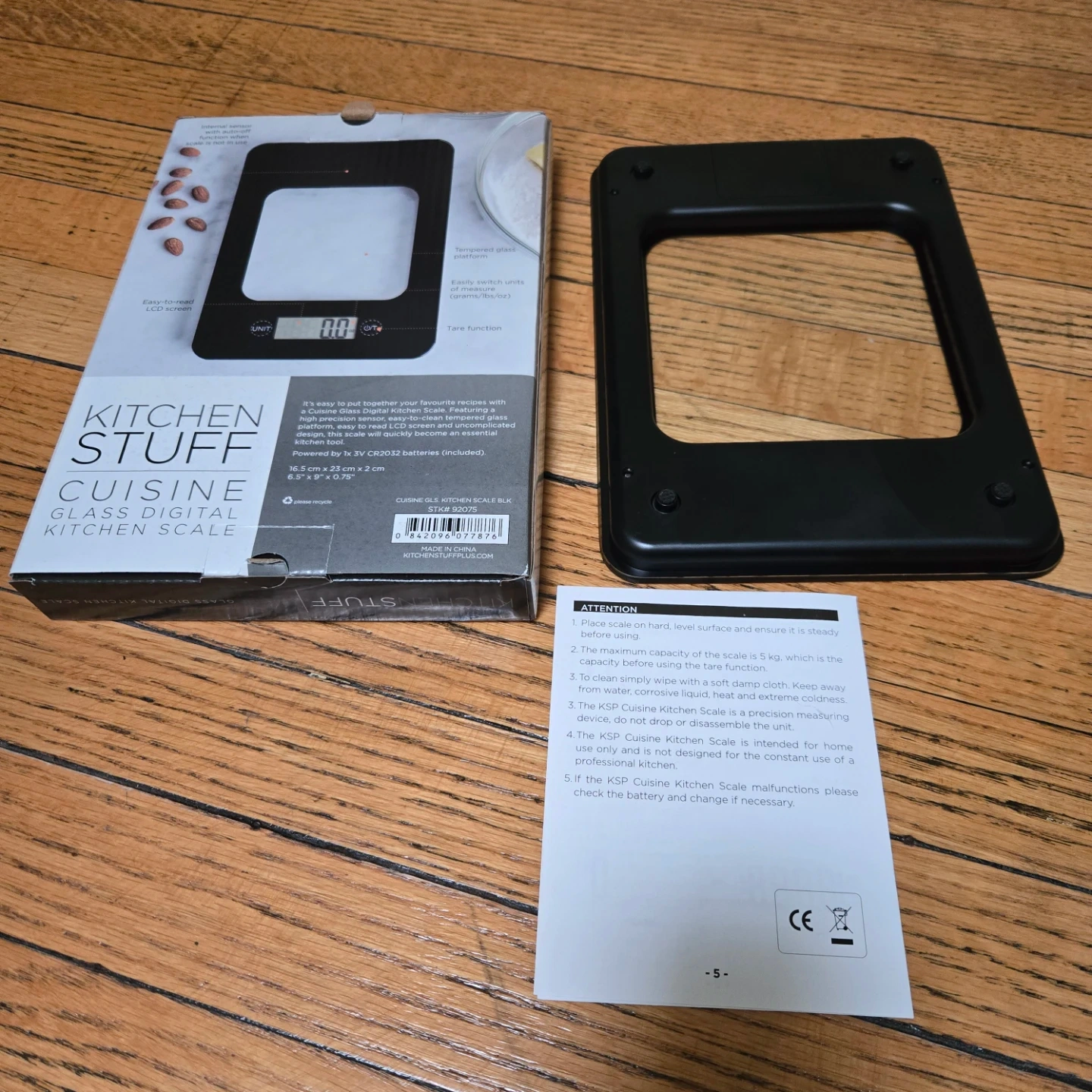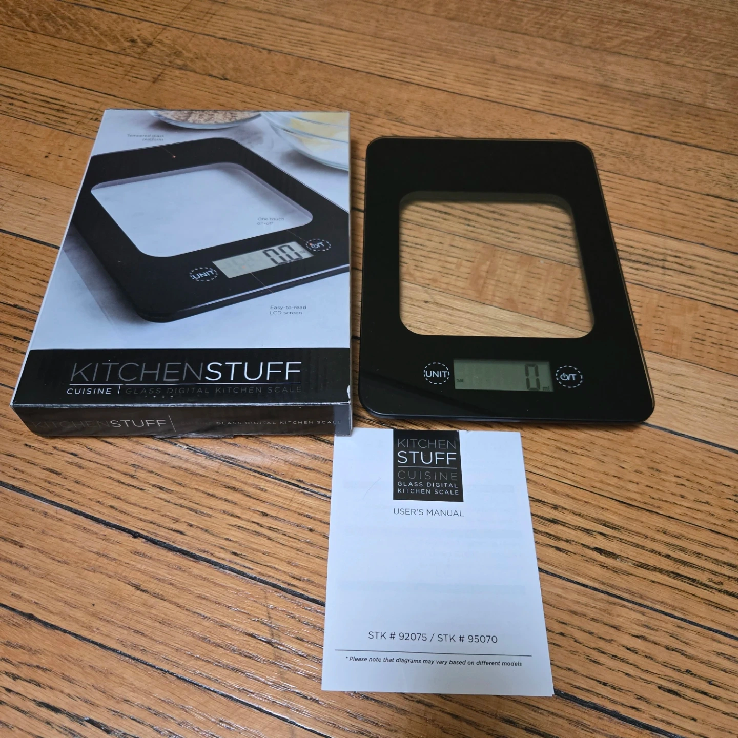This Kitchen Stuff glass digital kitchen scale has an easy-to-read LCD screen. It measures 16.5 cm x 20 cm x 2 cm. It's designed for precise home cooking.