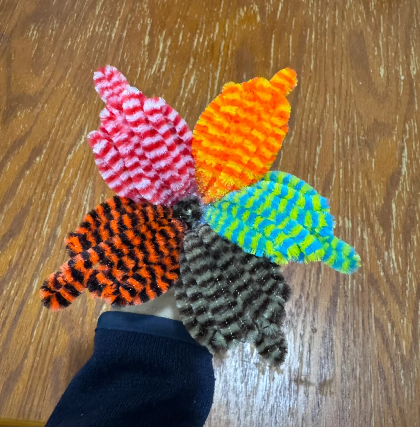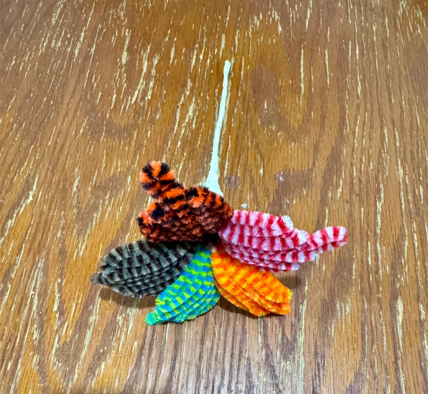 A set of five decorative flowers made from colourful fassy wires. Each flower features vibrant colours like red, orange, blue, green, brown and black. These are great for crafting or adding a pop of colour to a space!