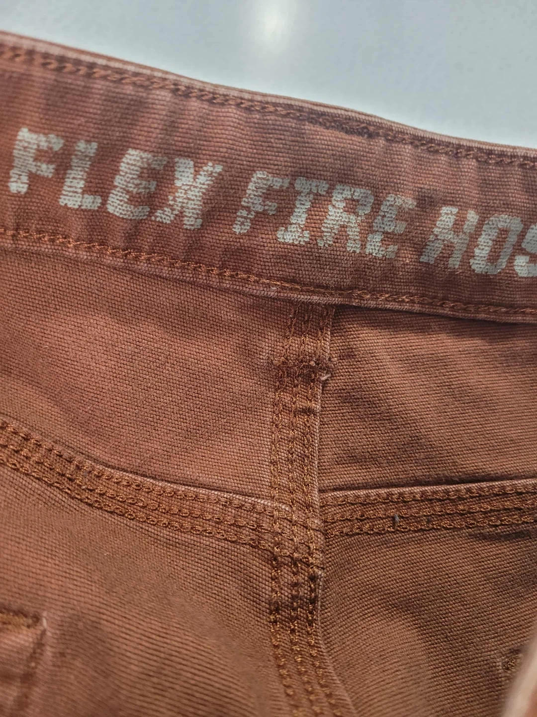 81Selling a pair of Duluth Trading Co. Flex Fire Hose pants. These are size 36x30 and made of 97% cotton. They are a standard fit and a nice brown color!