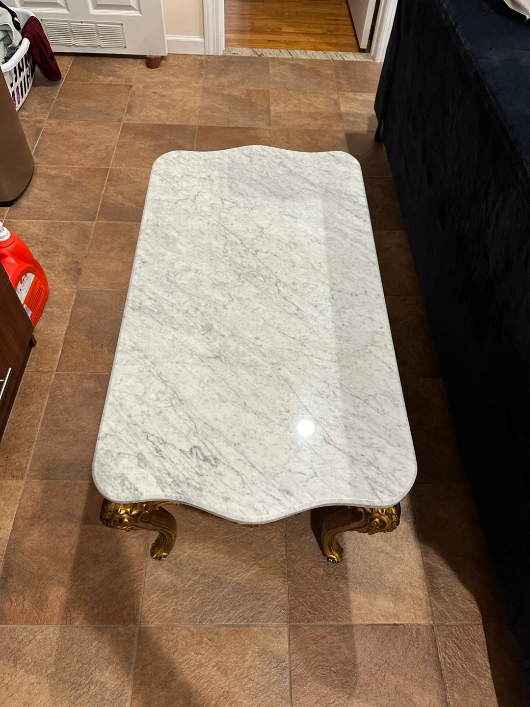 Elegant coffee table. Marble top. Gold ornate legs and frame. Beautiful addition to any home. Measures approximately 48"L x 24"W x 18"H. Some minor wear.