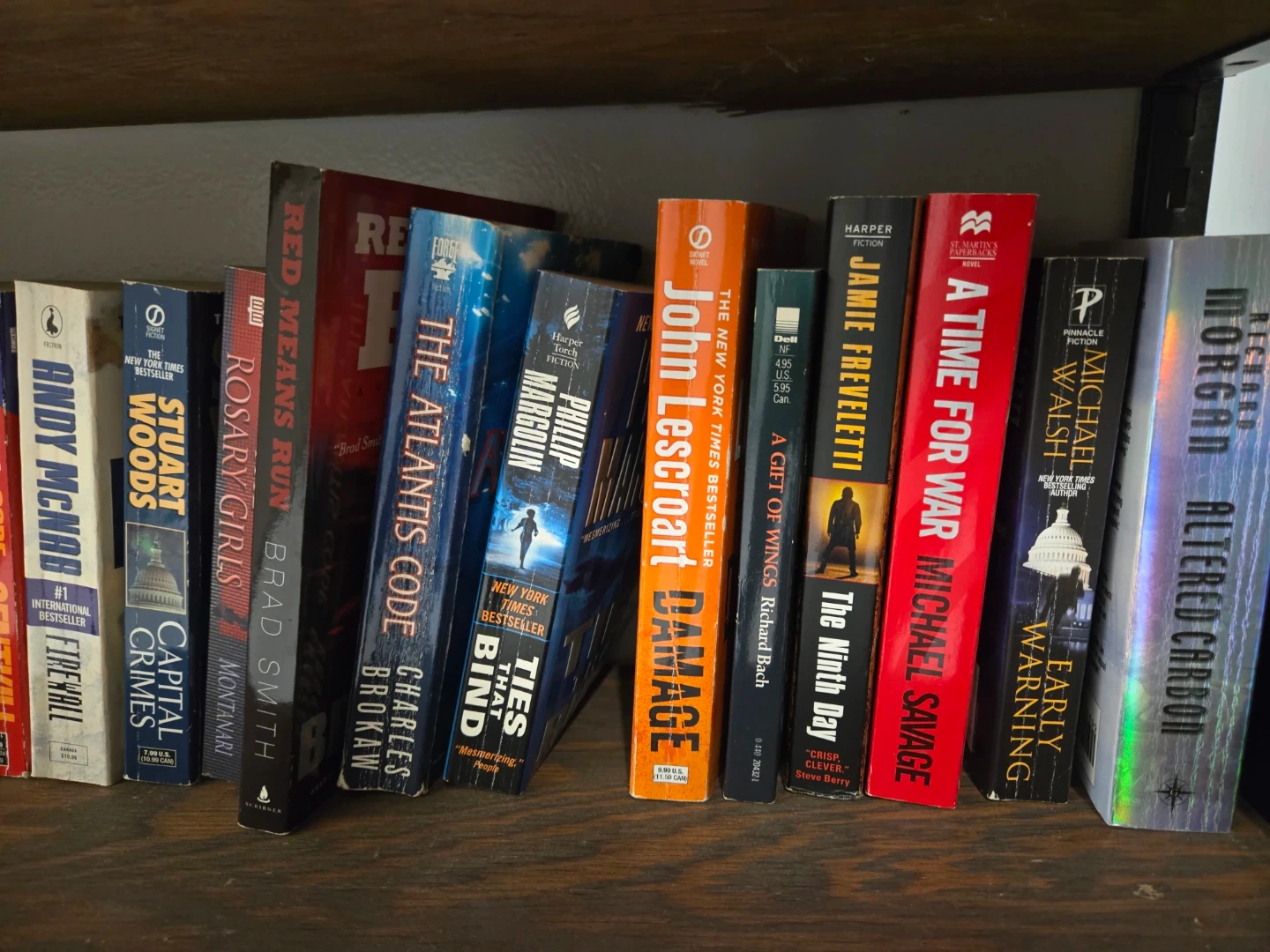 A collection of eight paperback novels by various authors. Titles include 'Damage' by John Lescroart and 'Altered Carbon' by Richard Morgan. These books are all in good condition. A great selection for any fiction reader! $5 each