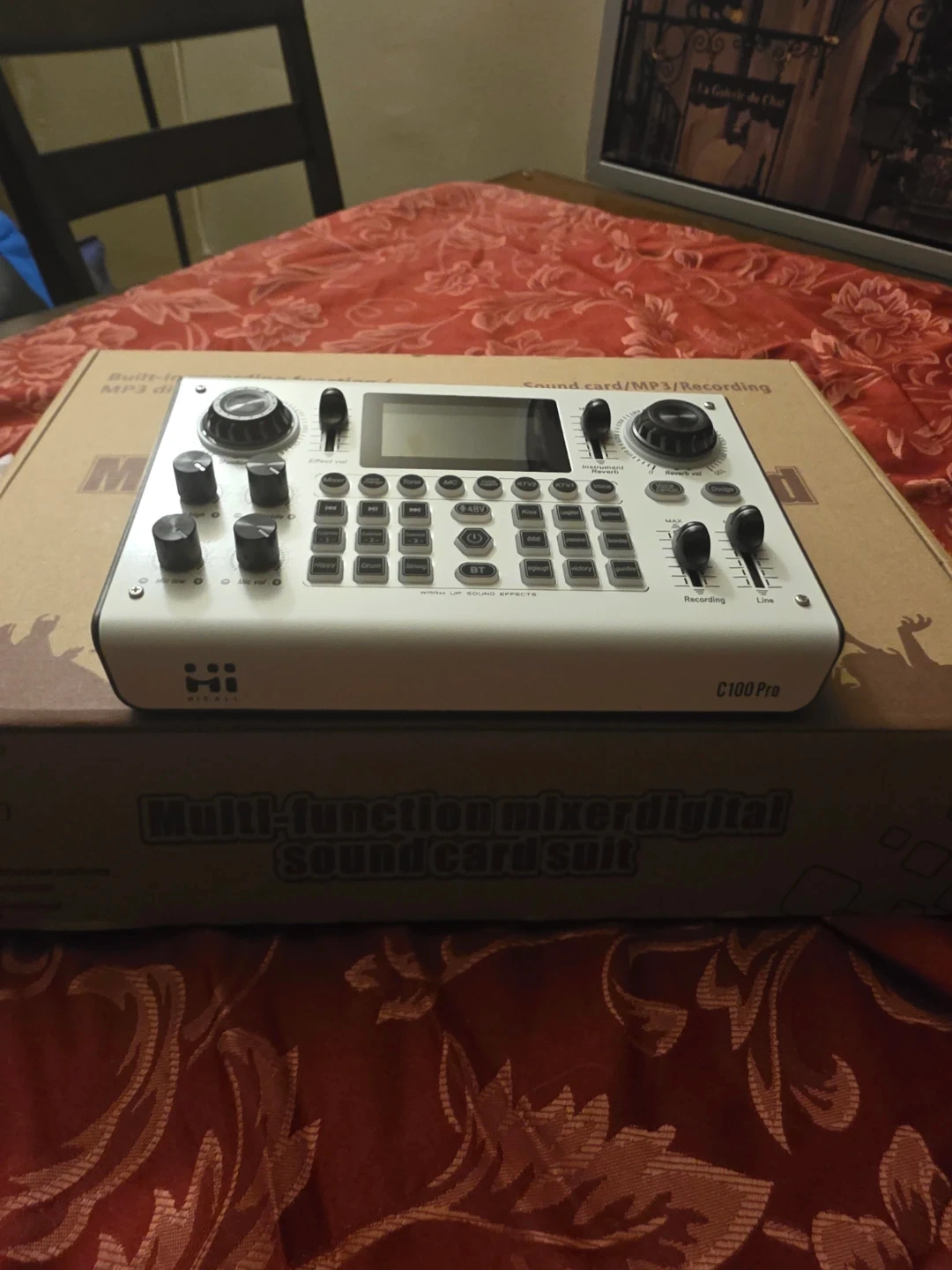 This is a MAONO C100 Pro multi-function mixer and digital sound card. It's designed for recording and includes various controls for audio mixing. The unit comes in its original packaging with accessories. It features built-in MP3 and sound effects.