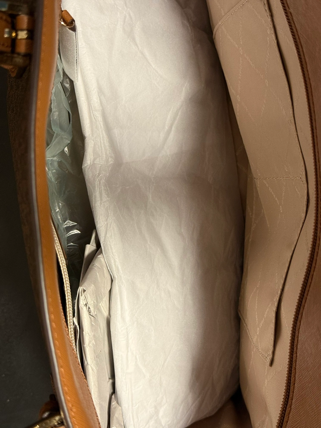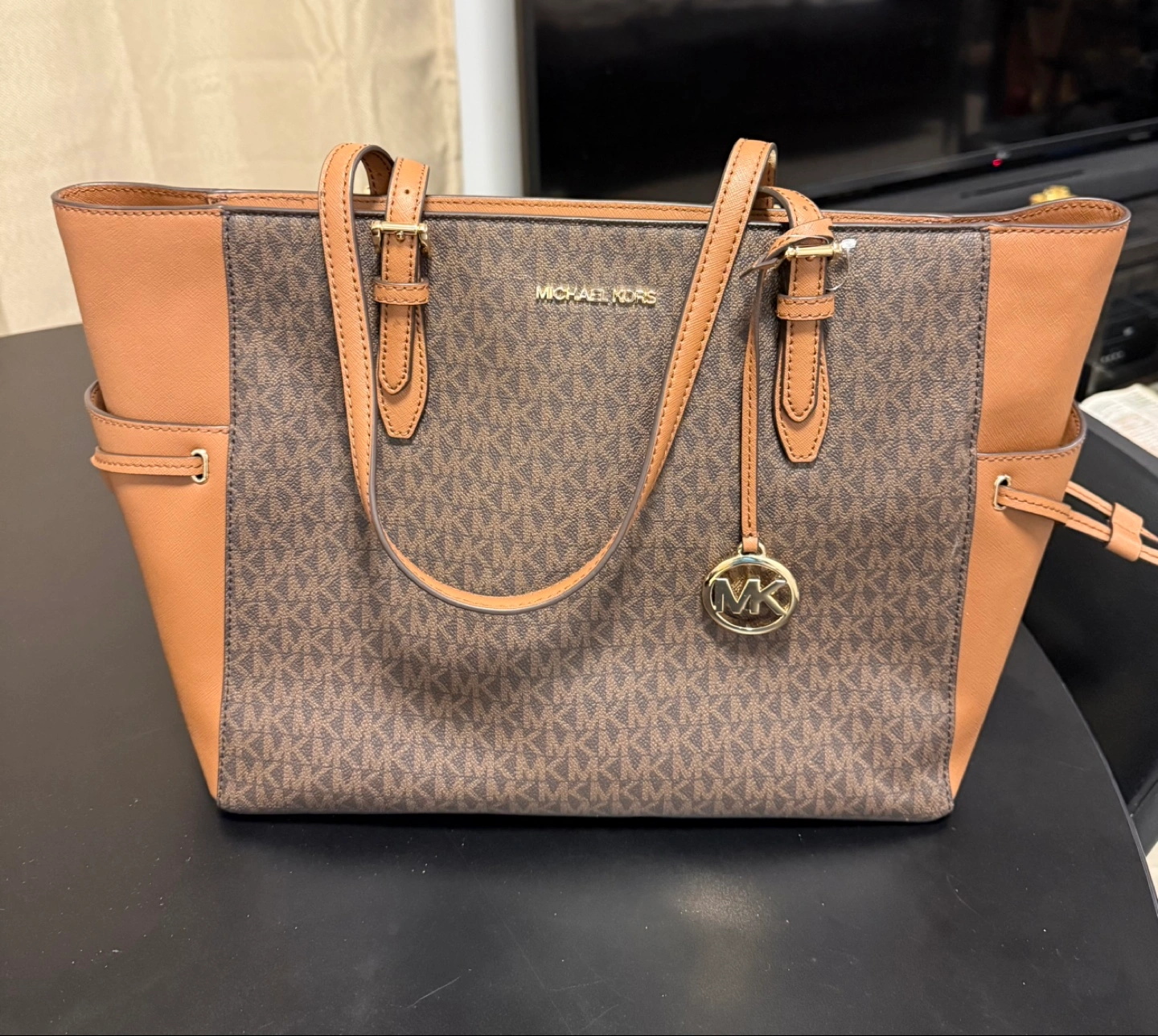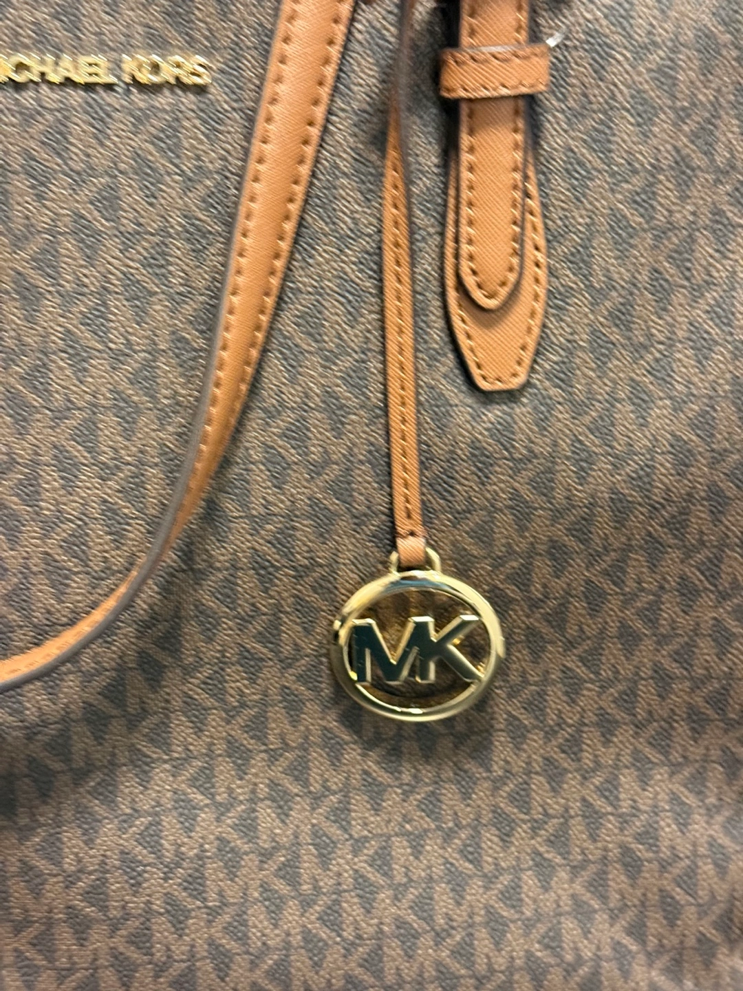 Brown and tan MK tote bag. Large size. Drawstring closure. Two top handles. MK logo. Excellent condition.