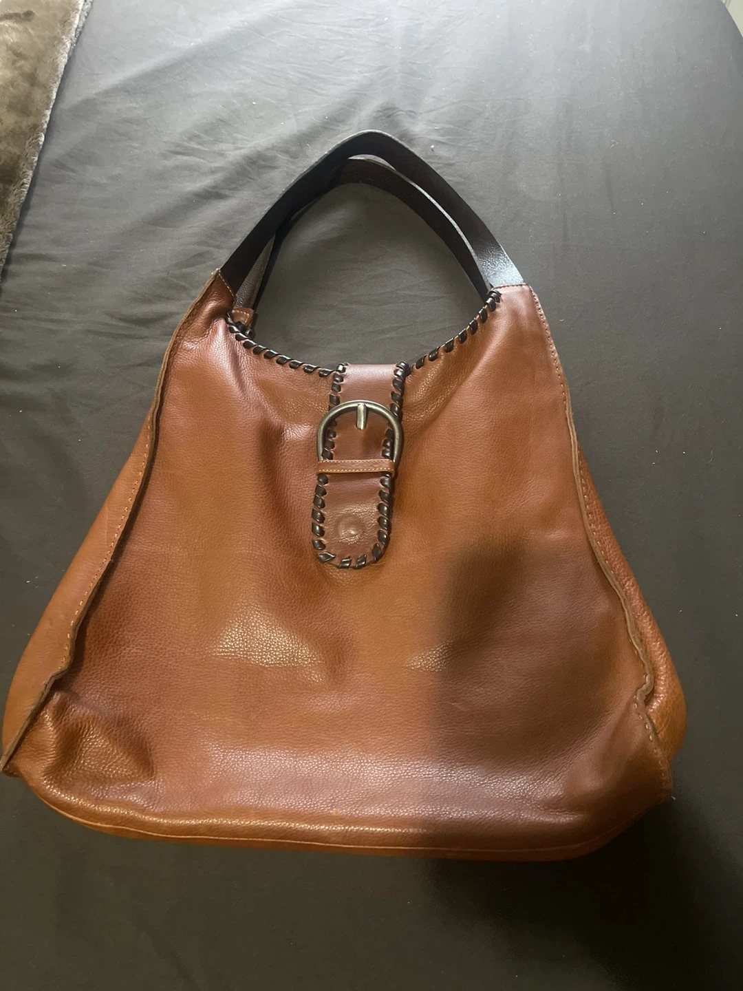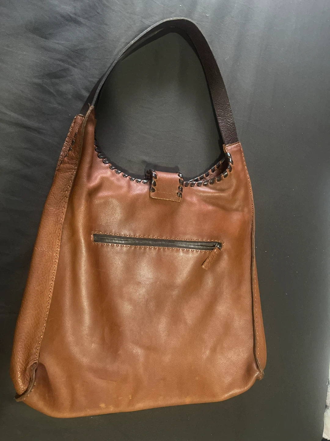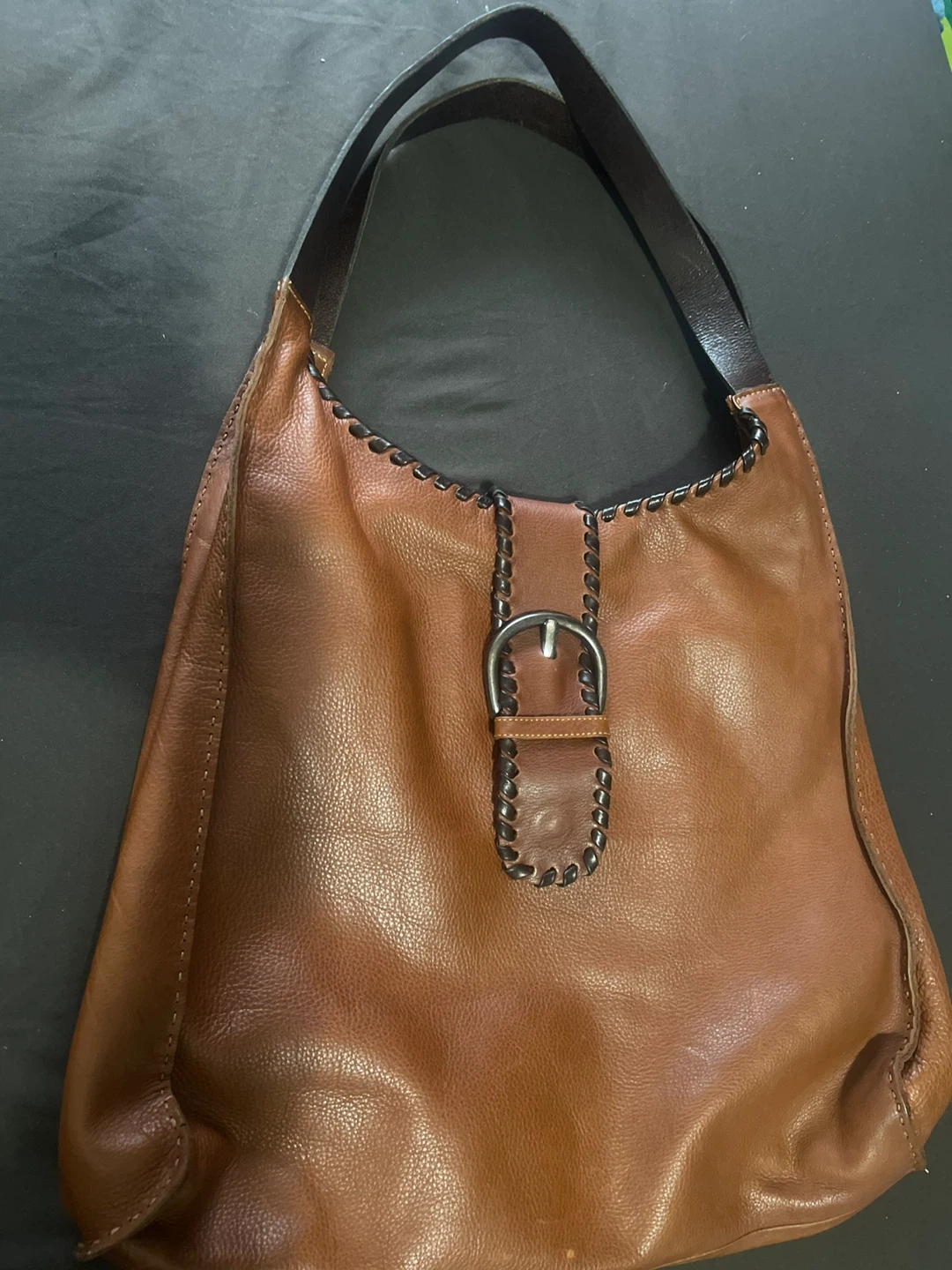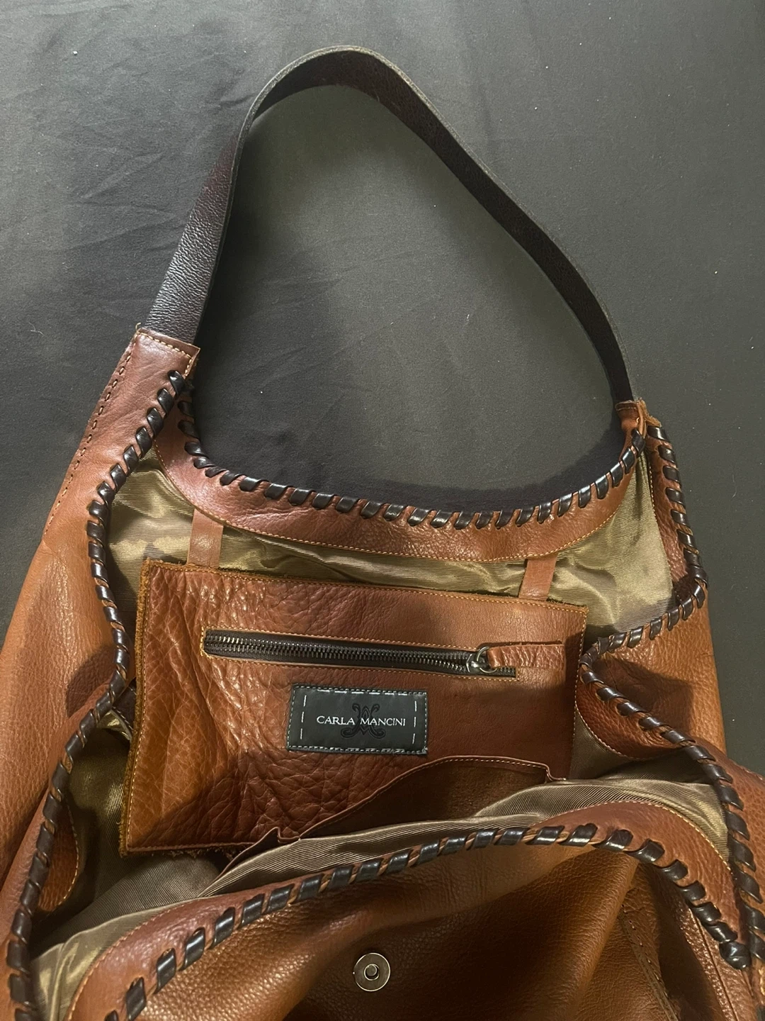 This is a Carla Mancini hobo bag crafted from genuine brown leather. It features a decorative buckle closure on the front and a zippered pocket on the back. The interior has a zippered pocket and an open pocket.