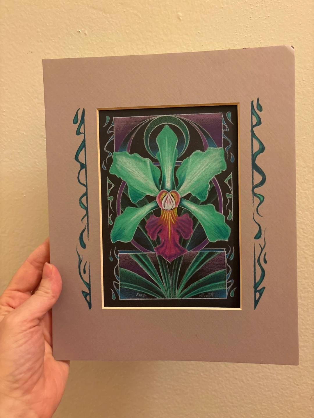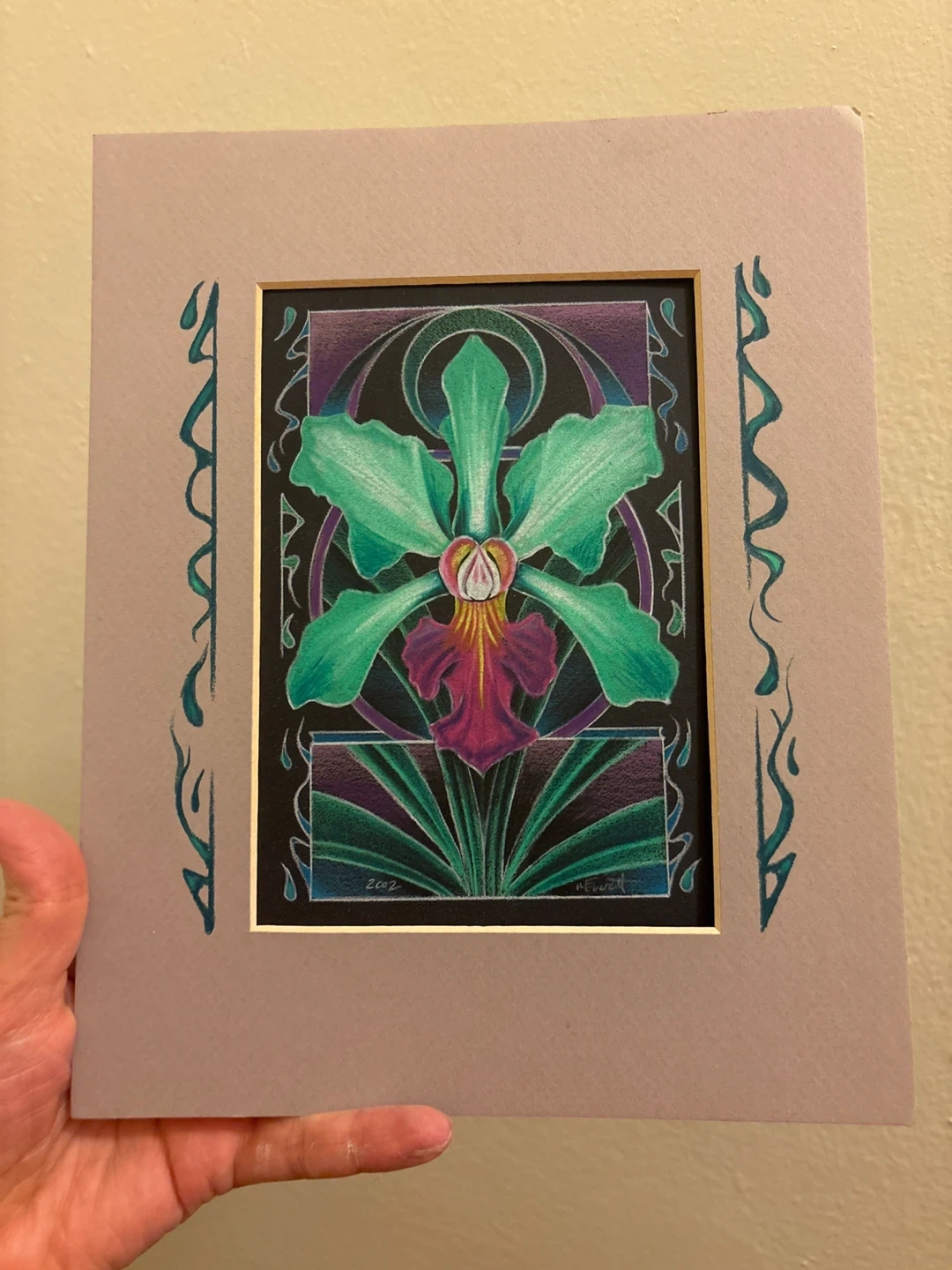 Stunning framed hand drawing featuring a colorful orchid given to my rockstar ex_husband. The artwork is matted and ready to hang. It's signed '2002' during a live show, done with colored pencils.