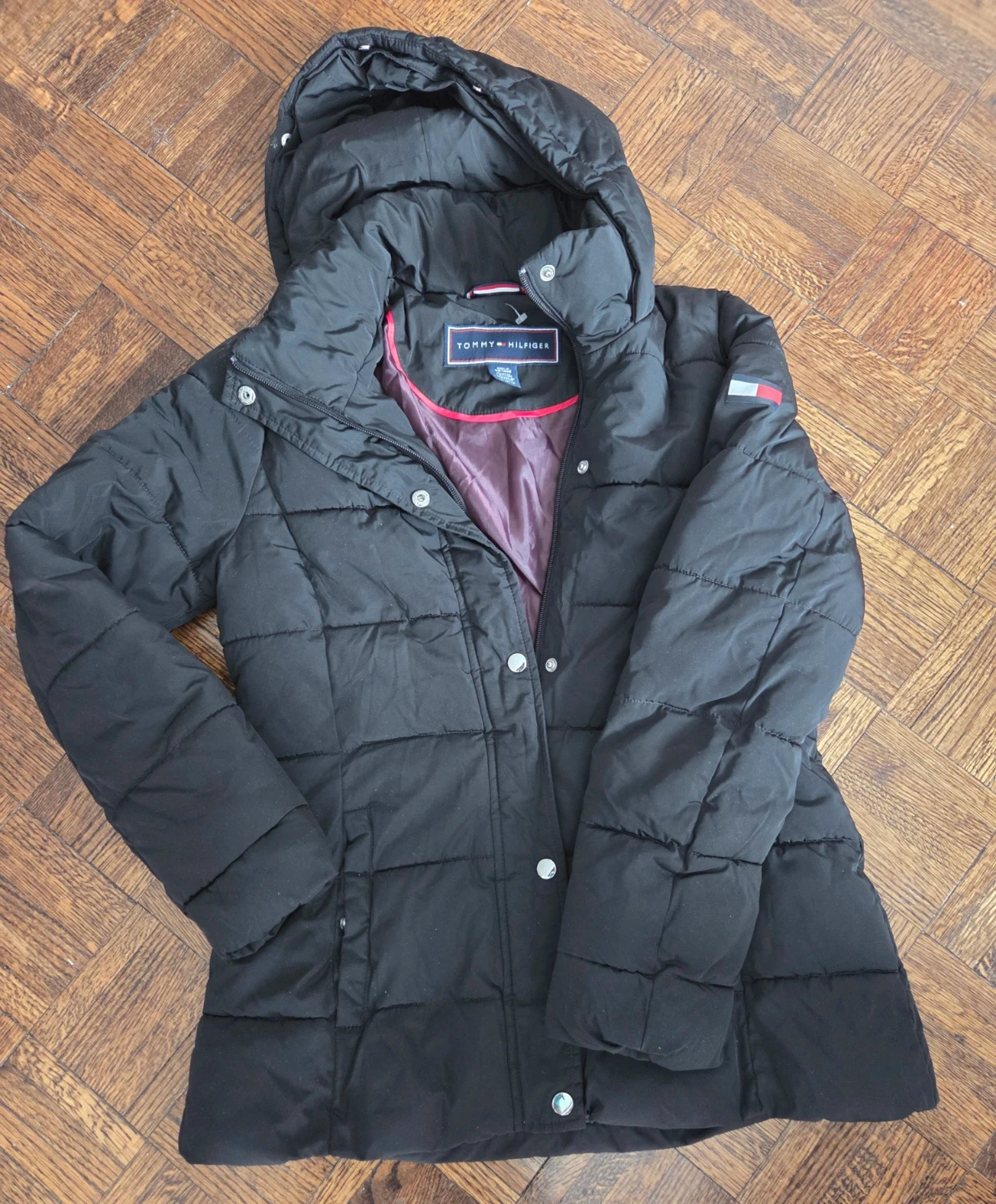 This is a black puffer jacket from Tommy Hilfiger. It features a quilted design and a hood. The interior lining is a contrasting pinkish-red colour. It's a great outerwear piece for cooler weather!