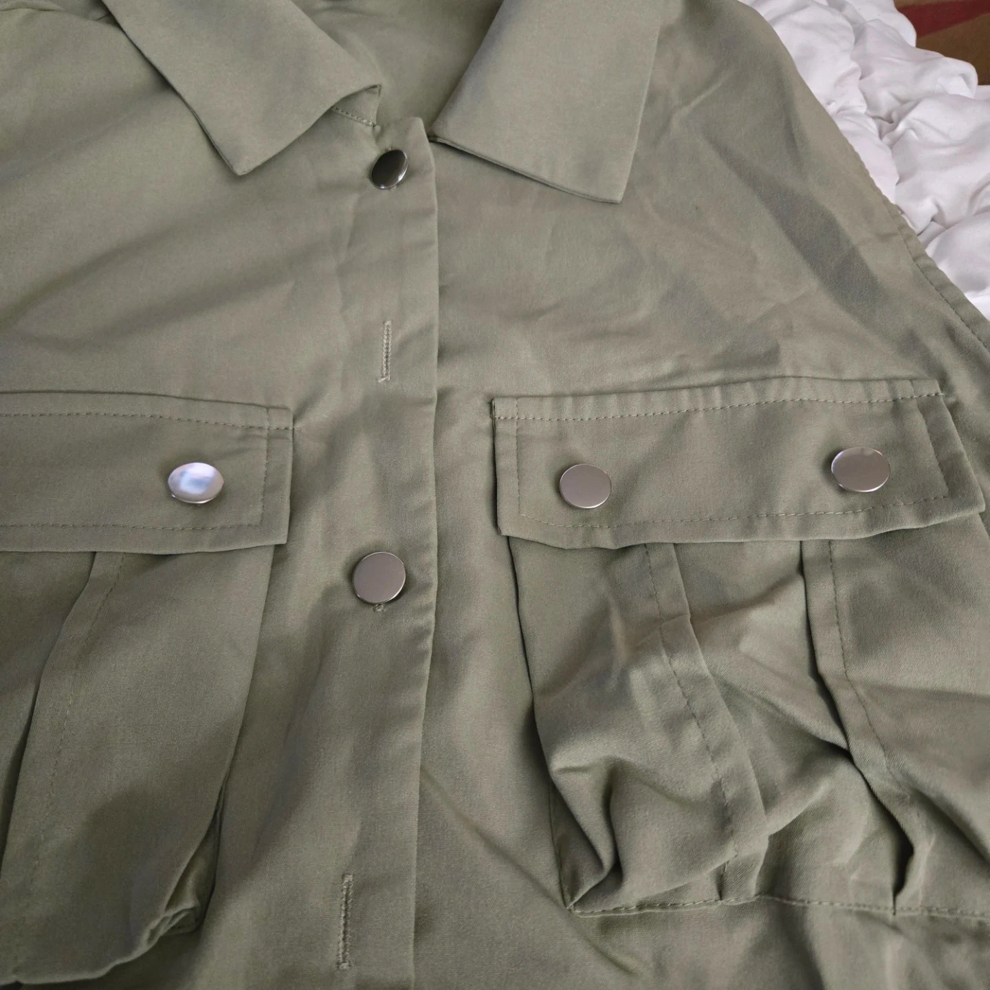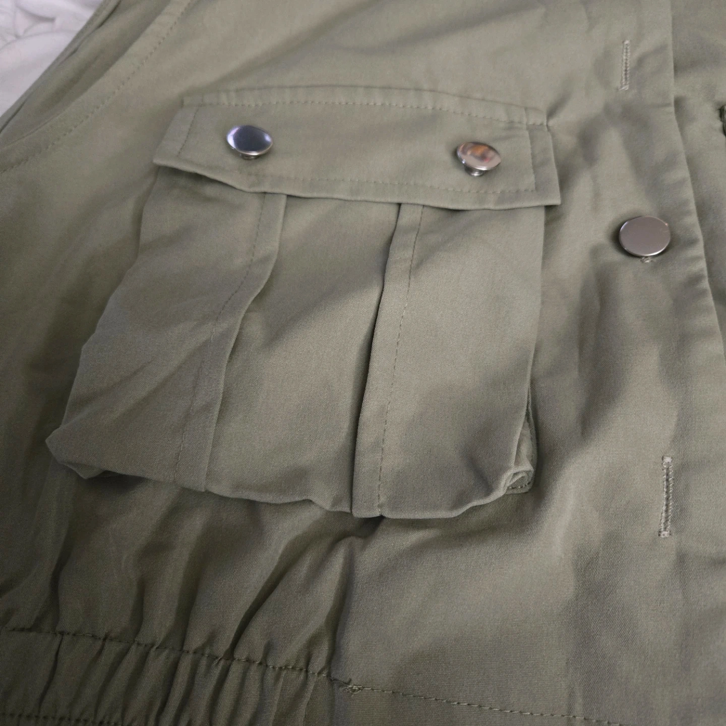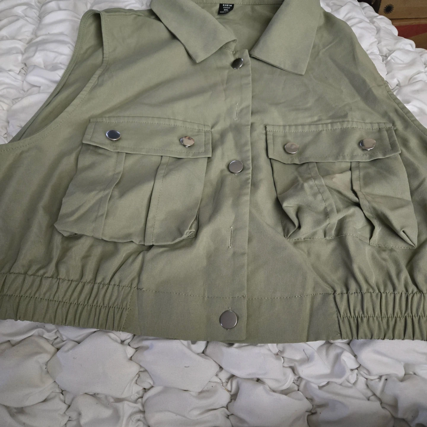This is a SHEIN utility vest in olive green. It features two front pockets with snap closures and a button-down front. It has an elastic waistband. This vest is great for layering over tops.