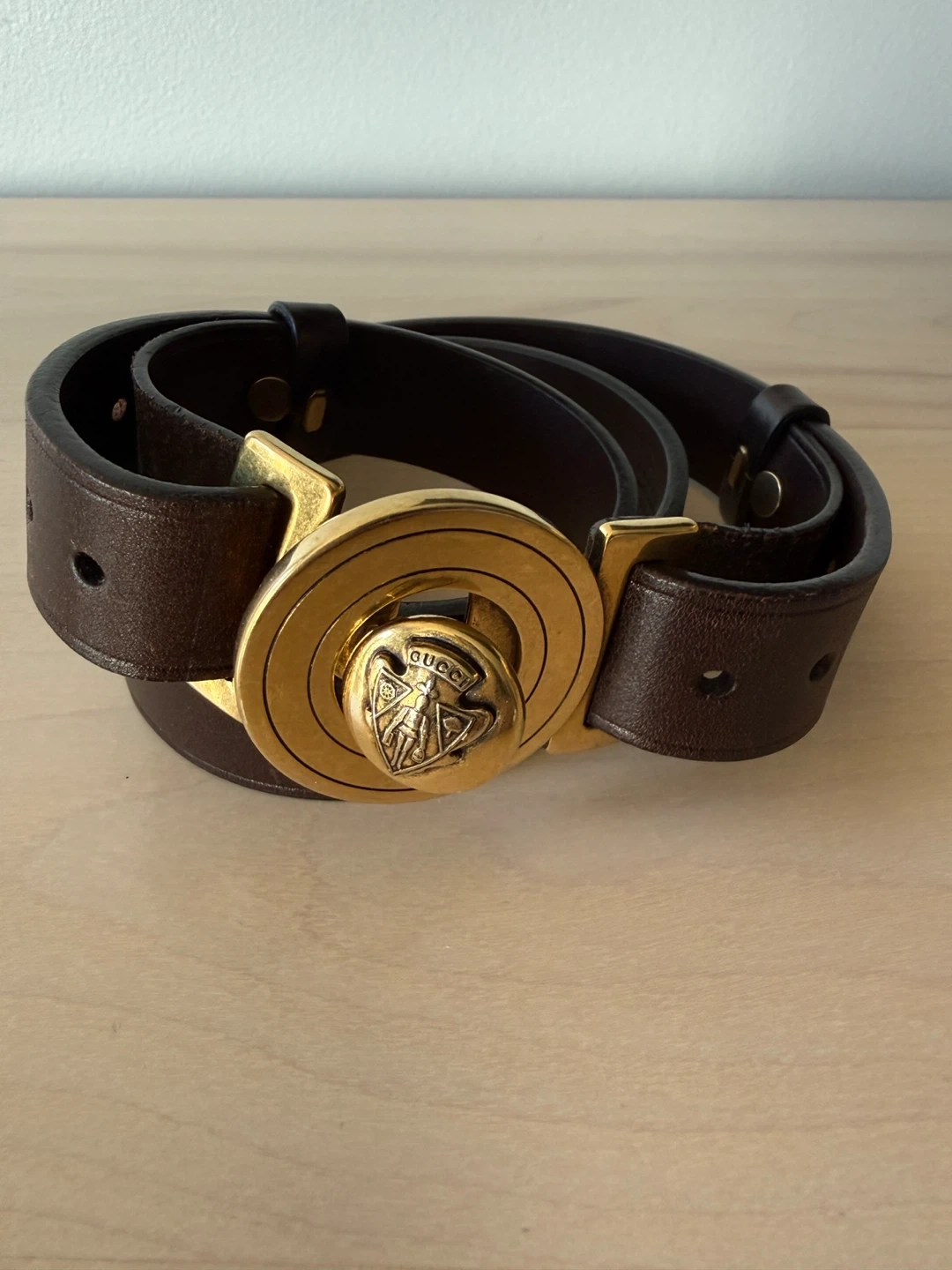 This is a stylish brown leather belt from Gucci. It features a distinctive gold buckle. The belt is in good condition and ready to add a touch of luxury to your outfit!