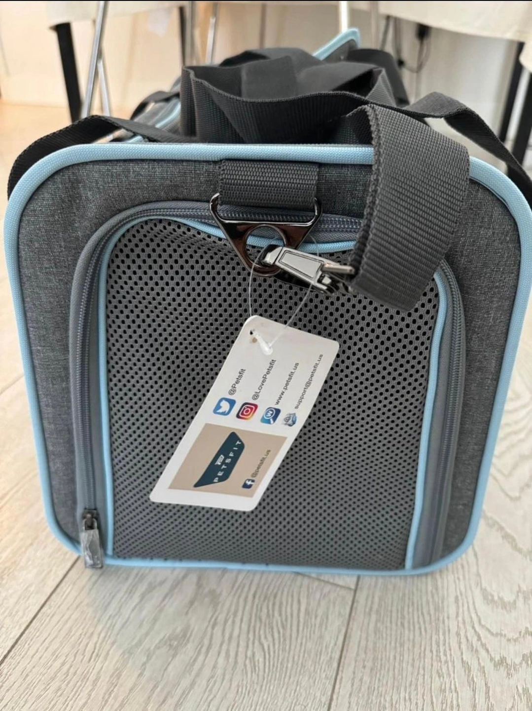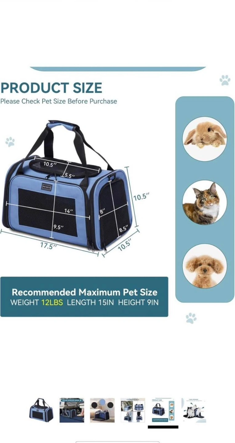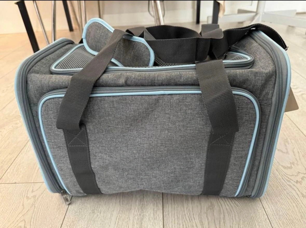 Brand new Grey and blue pet carrier. Can be carried as a backpack or by the handles. Has a side pocket for treats or a phone. Measures approximately 17.5"L x 10.5"W x 9.5"H. Maximum weight capacity is 12lbs.