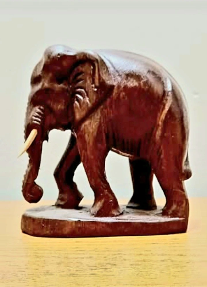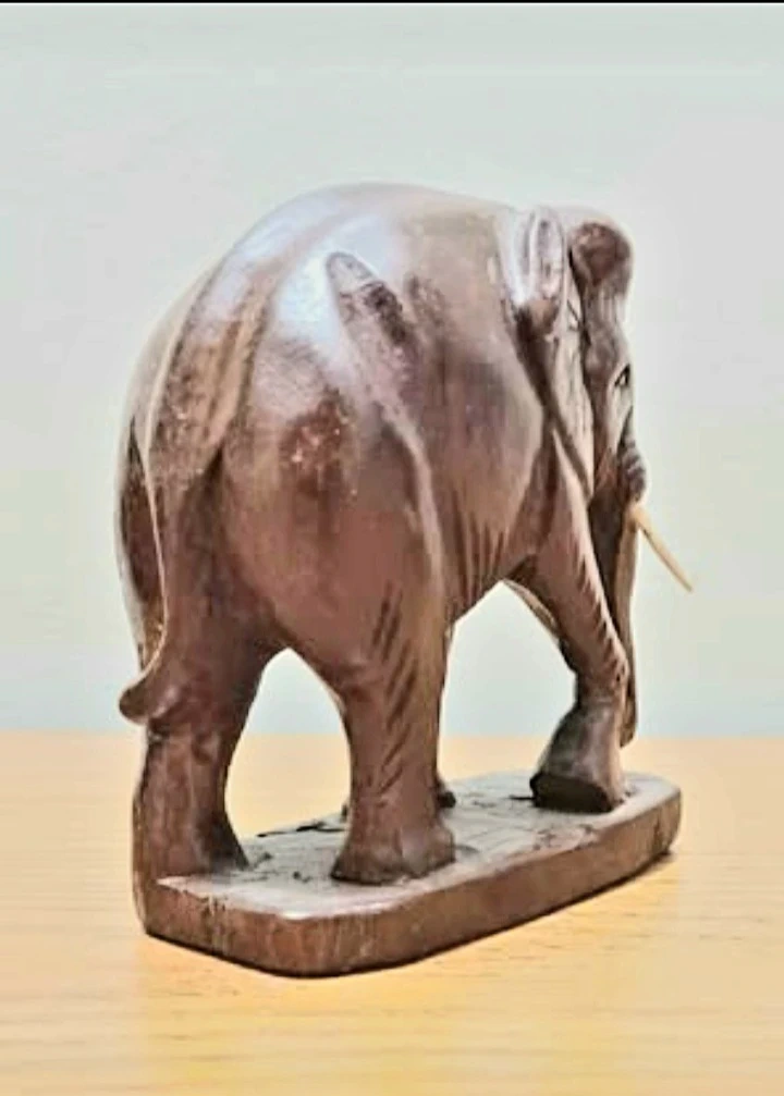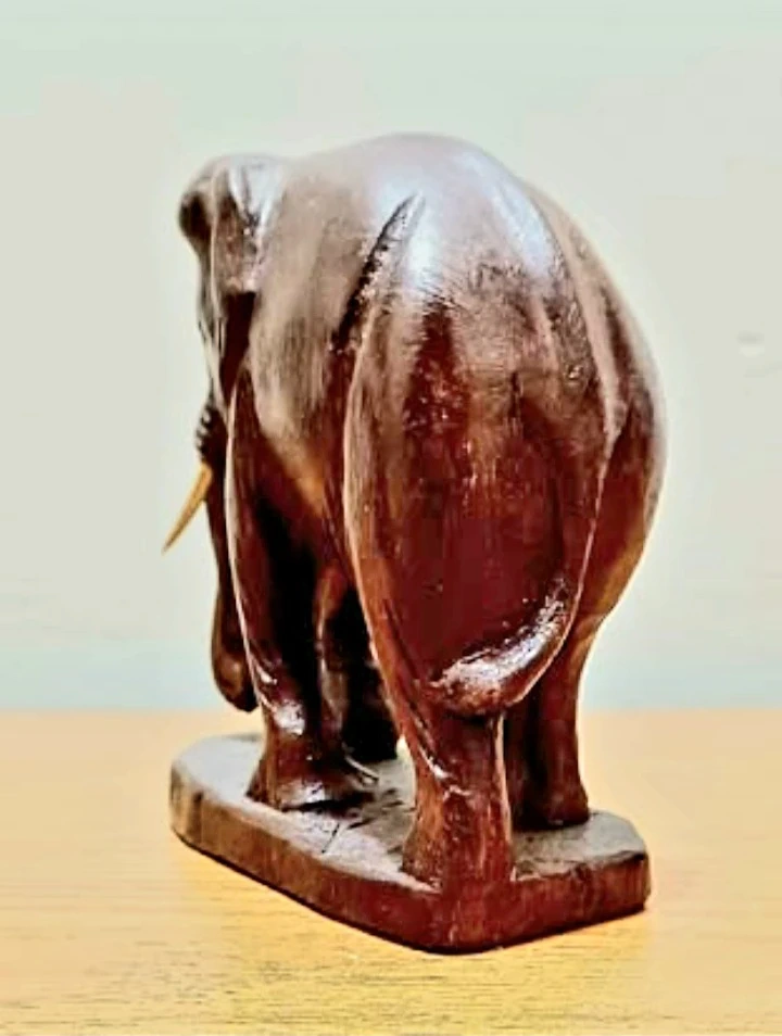 Vintage Hand-carved Wooden Elephant is a Unique piece, showcasing detailed Craftsmanship and a rich, dark finish. The Figurine stands sturdily on a small platform, emphasizing its artistic form and natural wood grain. Very Good Condition . Decorative Household