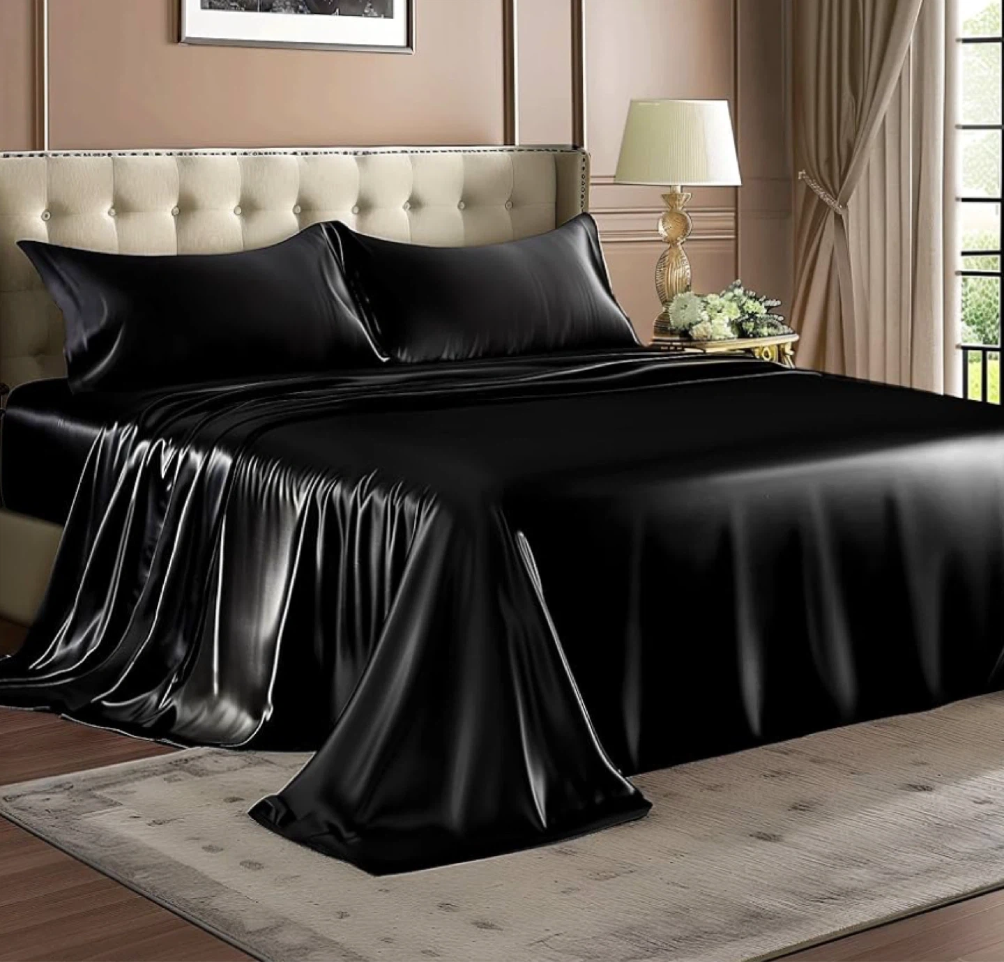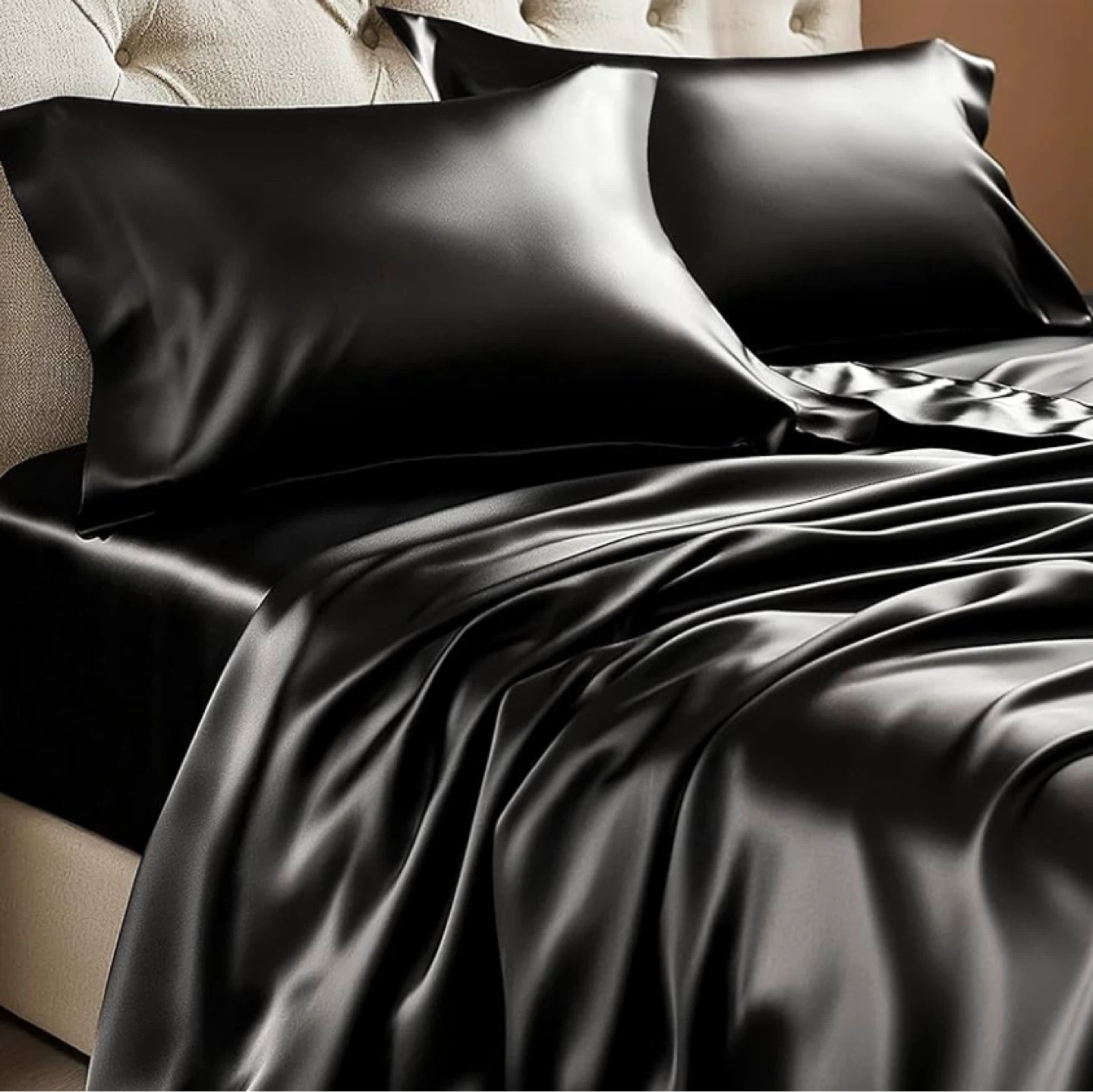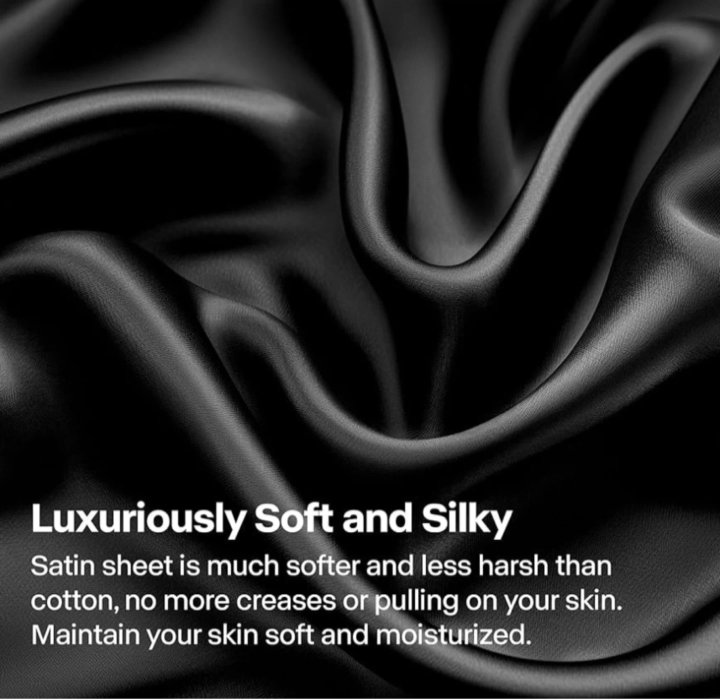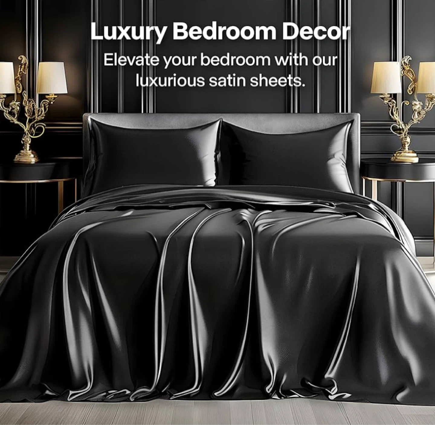 Luxury Soft Black Silky Sheets for Hair and Skin, Set 4 Pieces with- 1 Deep Pocket Fitted Sheet, -1 Flat Sheet, and -2 Pillowcases