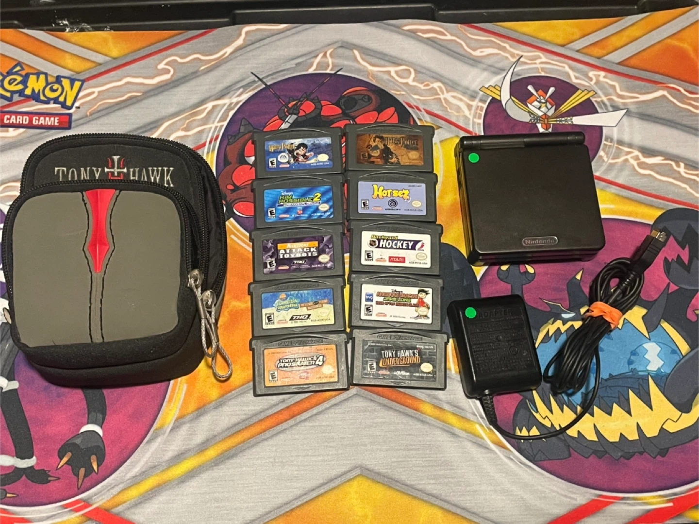 This bundle includes a black Nintendo Game Boy Advance SP and ten assorted Game Boy Advance cartridges. It also comes with a Tony Hawk carrying case and an AC adapter. All games appear to be in playable condition, ready for gaming on the go!