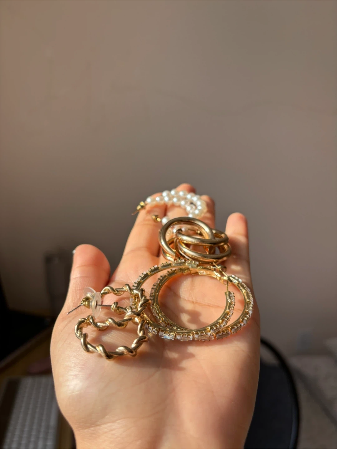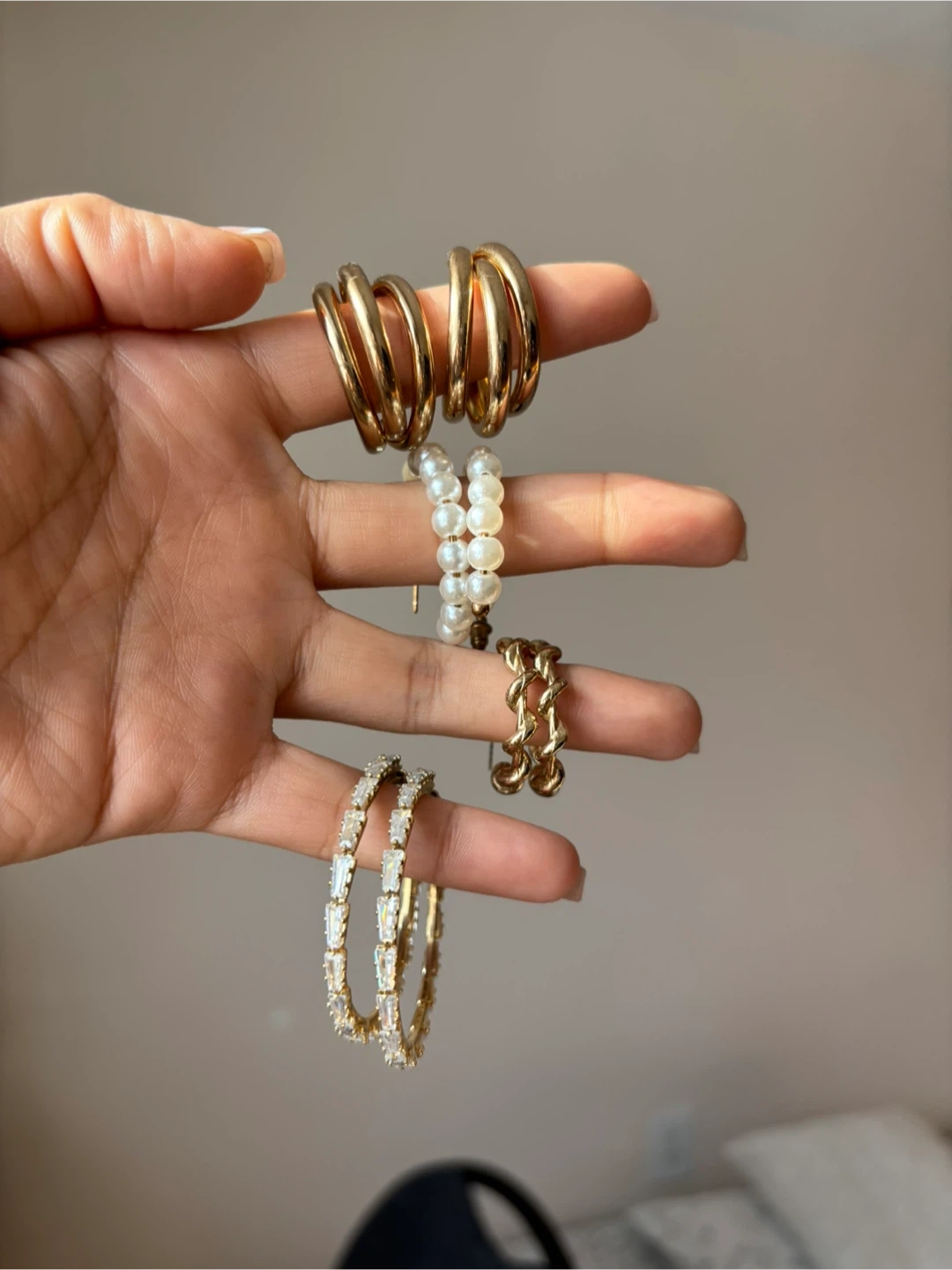 A collection of stylish gold hoop earrings, including textured and crystal-embellished designs, paired with a classic pearl bracelet. It's a versatile set for everyday wear or special occasions!
