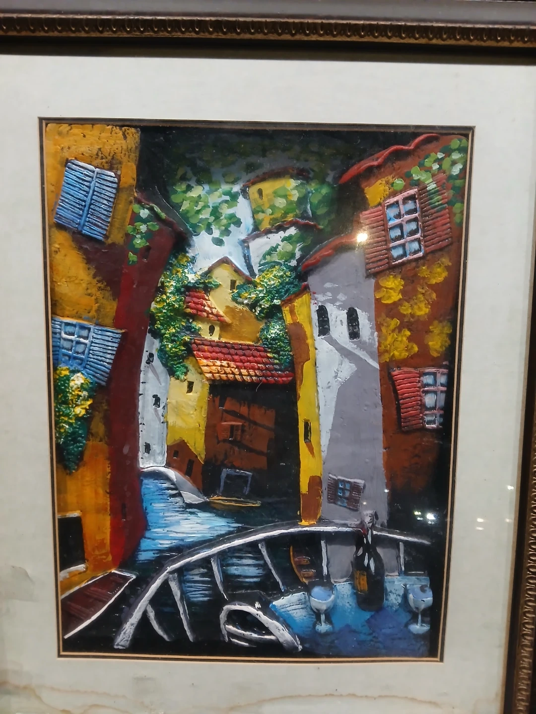 This is a dimensional art piece titled "Venice" by artist Miguel Freitas. The artwork features a vibrant, textured depiction of a canal scene with buildings and foliage. The piece is framed and ready to hang.