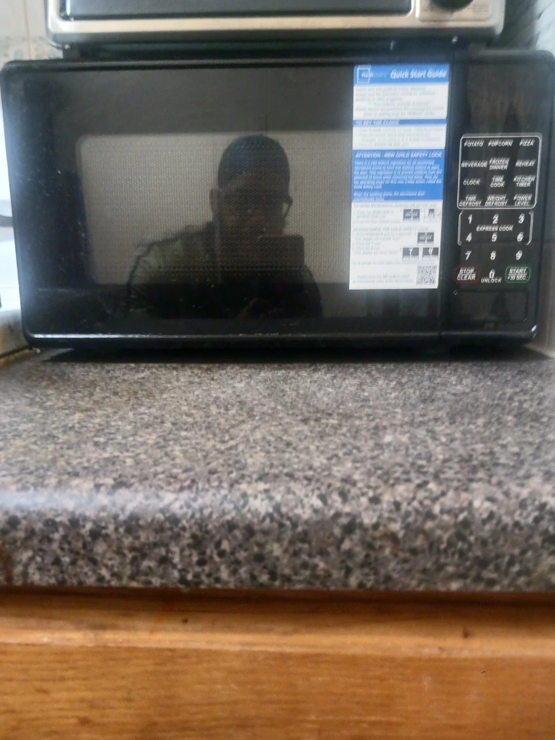 Black countertop microwave oven with various cooking presets. It has express cook options and a child safety lock. Includes quick start guide.