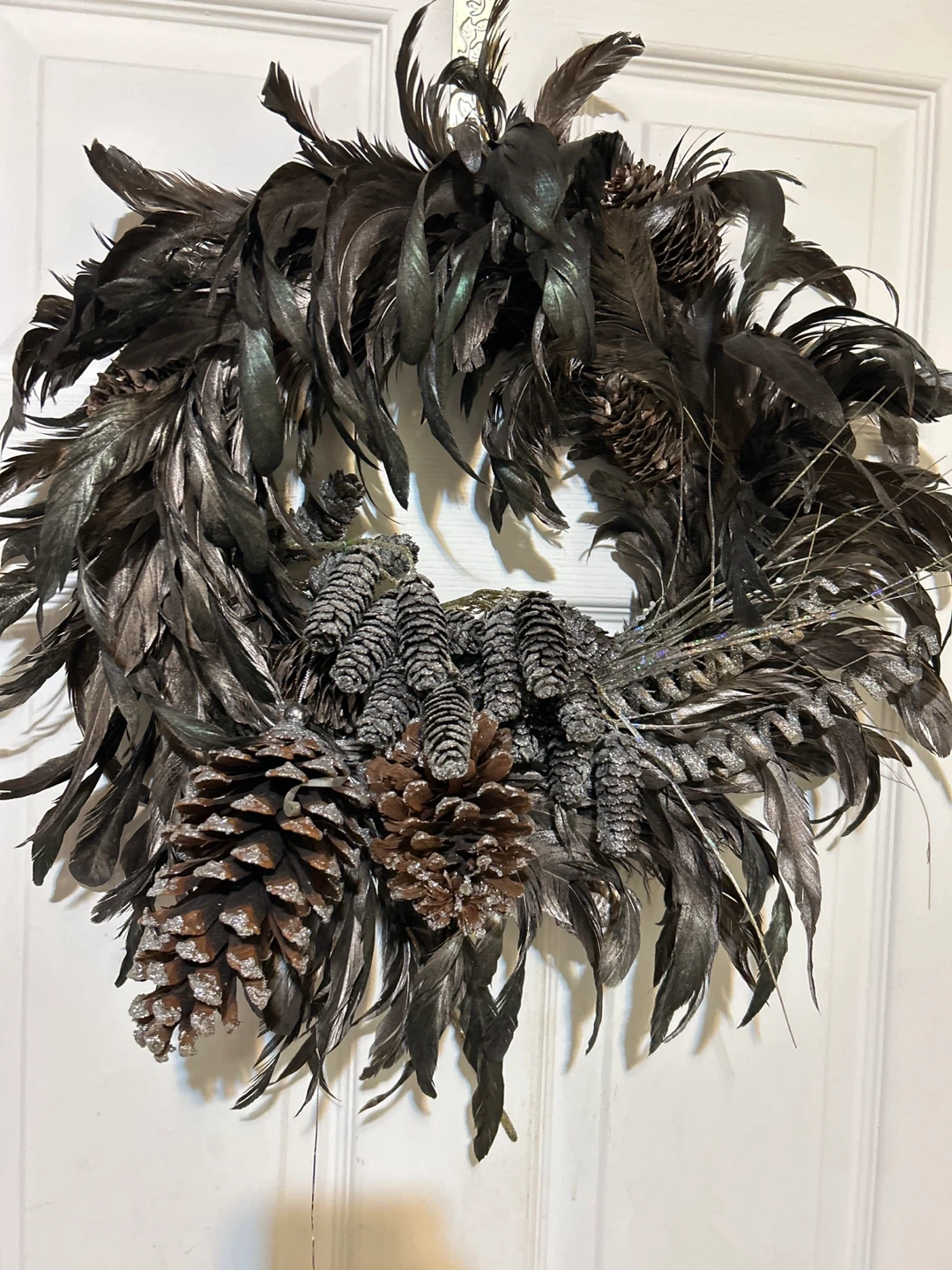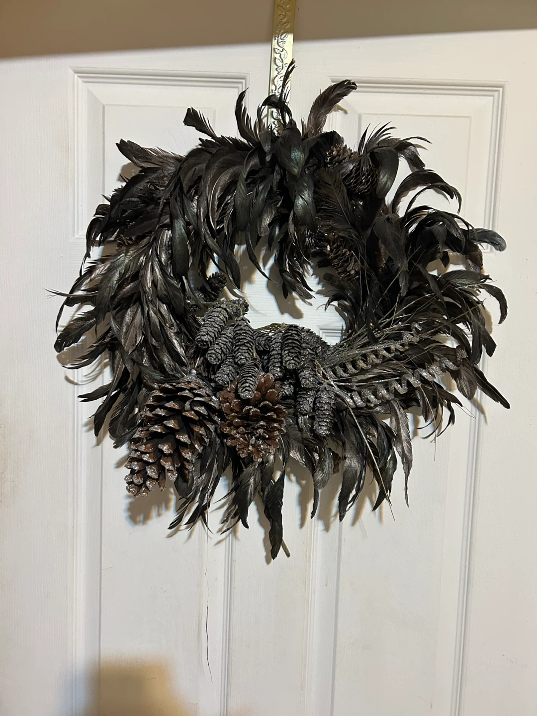 I'm selling a beautiful black feather and pinecone wreath. It's perfect for adding a touch of rustic elegance to your home decor. The wreath features a combination of black feathers and natural pinecones, creating a unique and eye-catching design could be for gothic