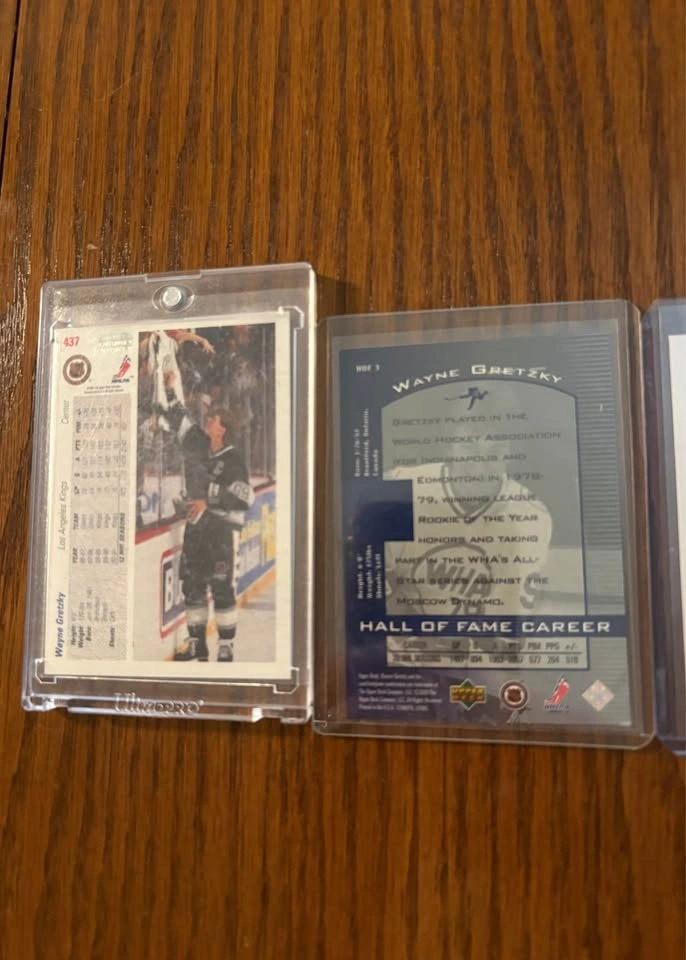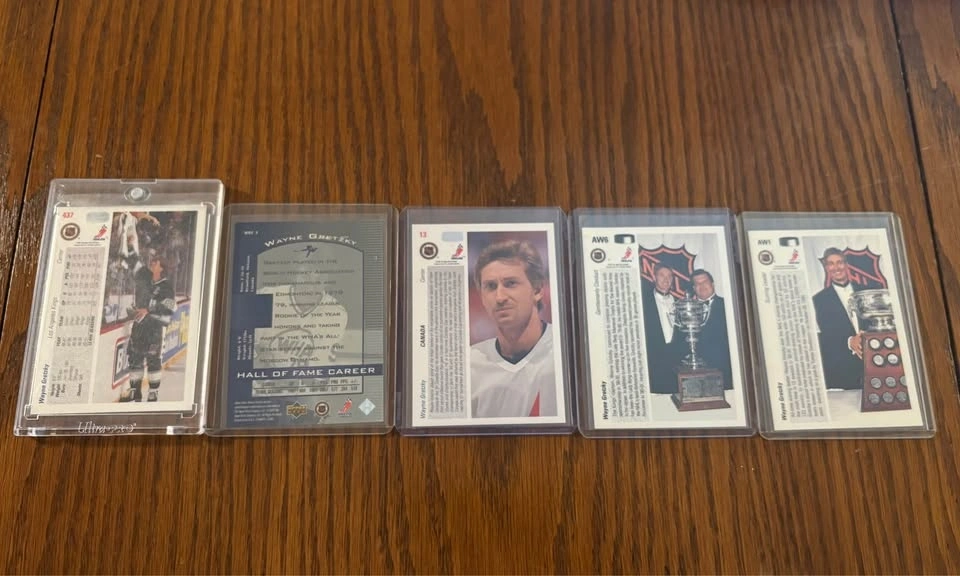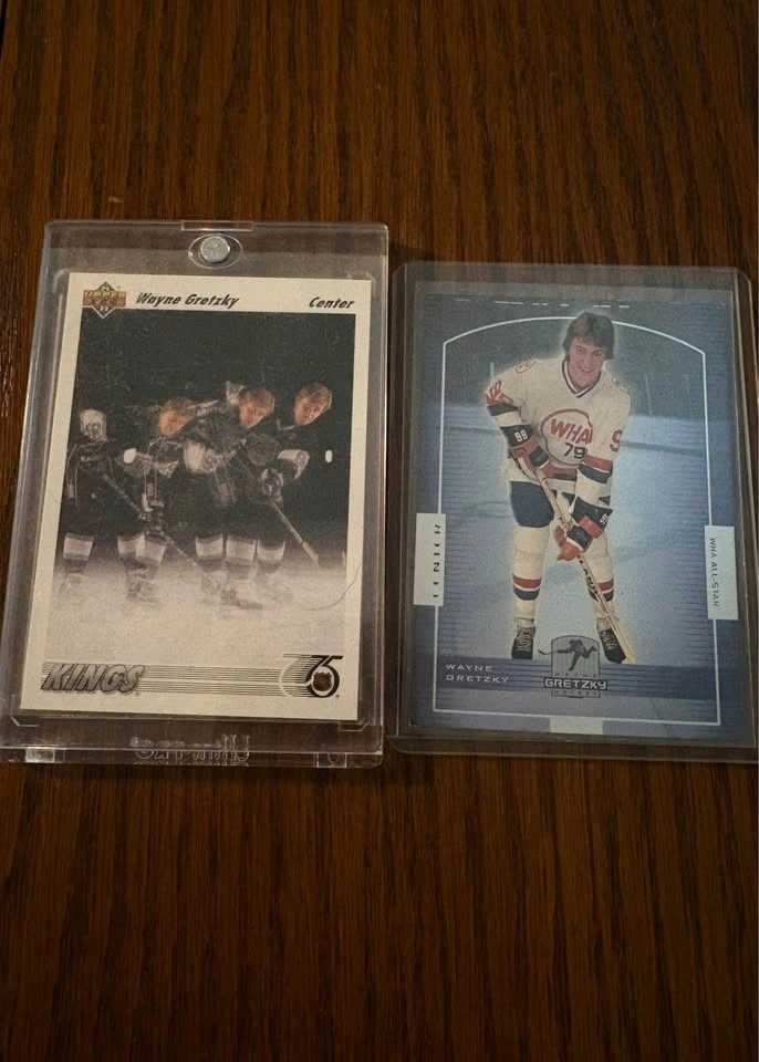 Wayne Gretzky card lot featuring early 1990s cards. Includes 1991 Upper Deck base cards and 1991 AW Trophy Winner hologram inserts. Cards are in good overall condition and have been stored properly in penny sleeves and top loaders. One card is in a magnetic one-touch case. Selling as a lot only. Pickup preferred. Asking $45 OBO.