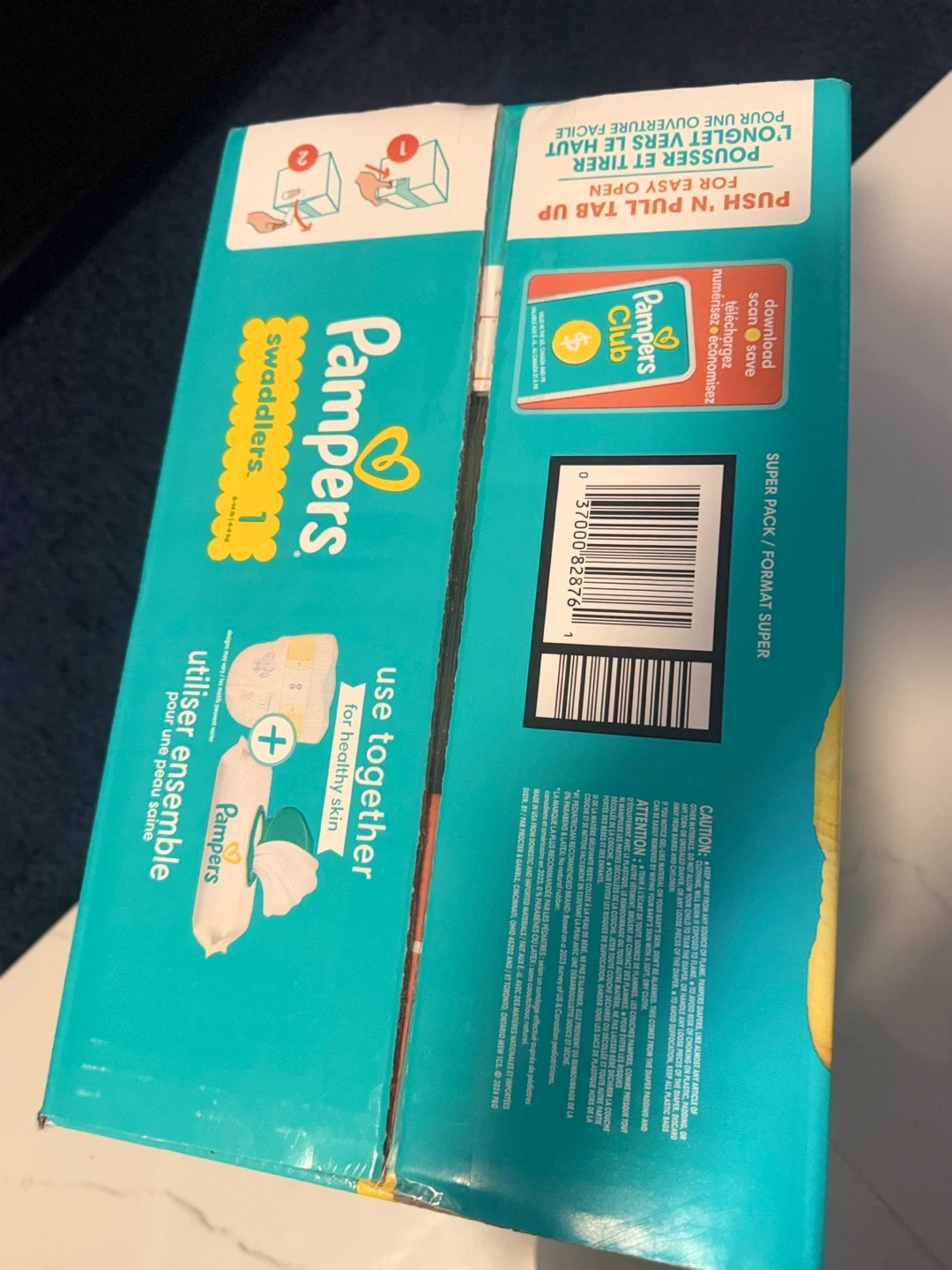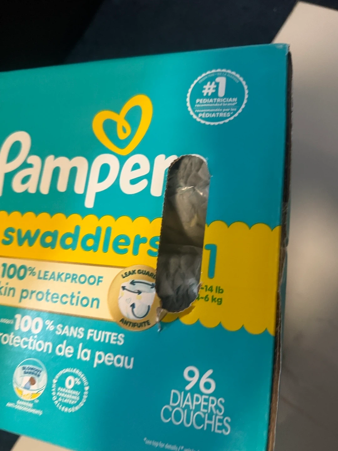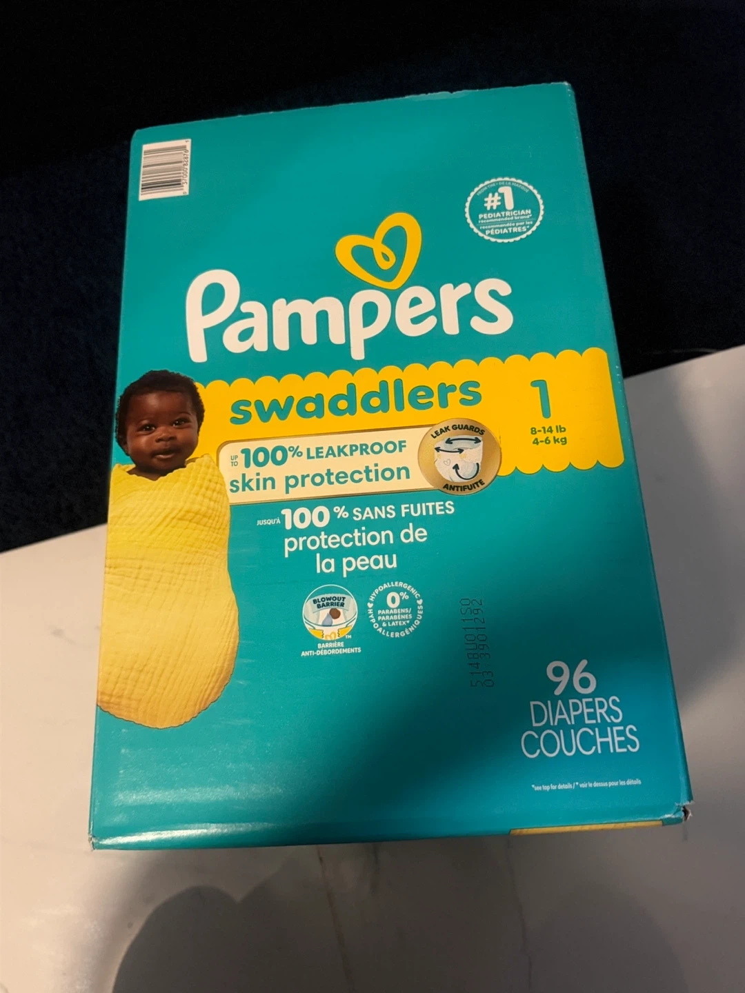Pampers Swaddlers diapers in size 1. These offer 100% leakproof skin protection. Includes 96 diapers.