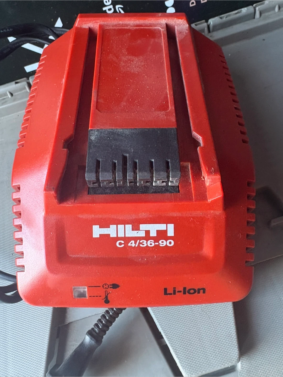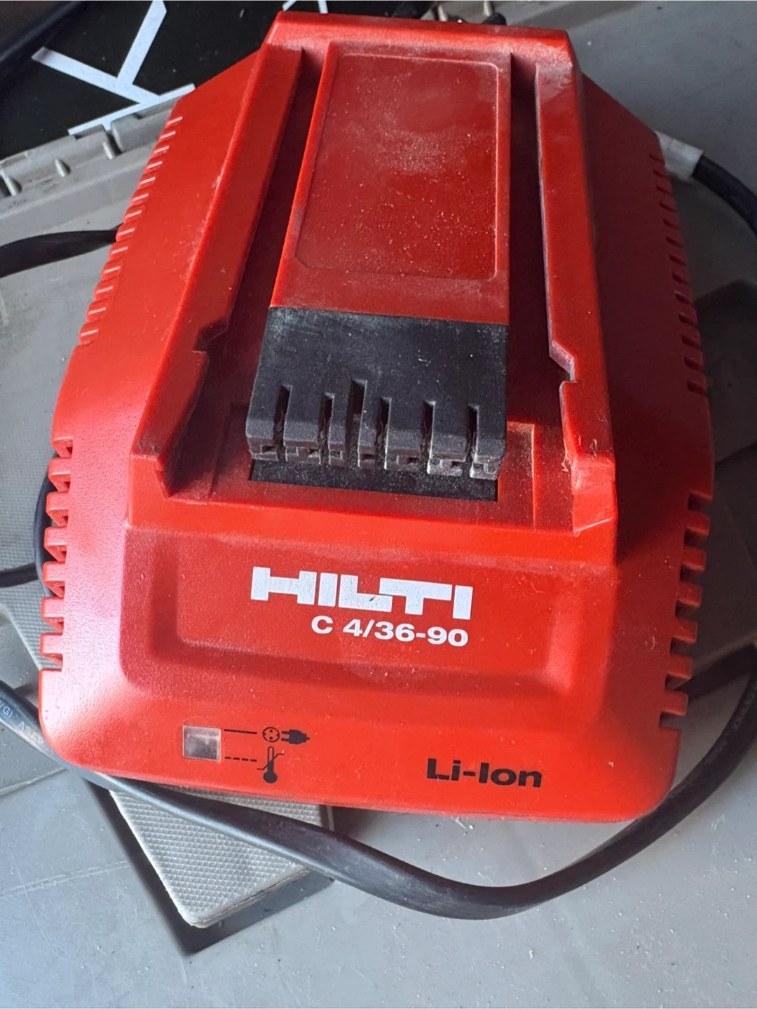 This is a Hilti C 4/36-90 Li-ion battery charger. It's designed for Hilti's 36V lithium-ion batteries. The charger features a quick charging indicator light.