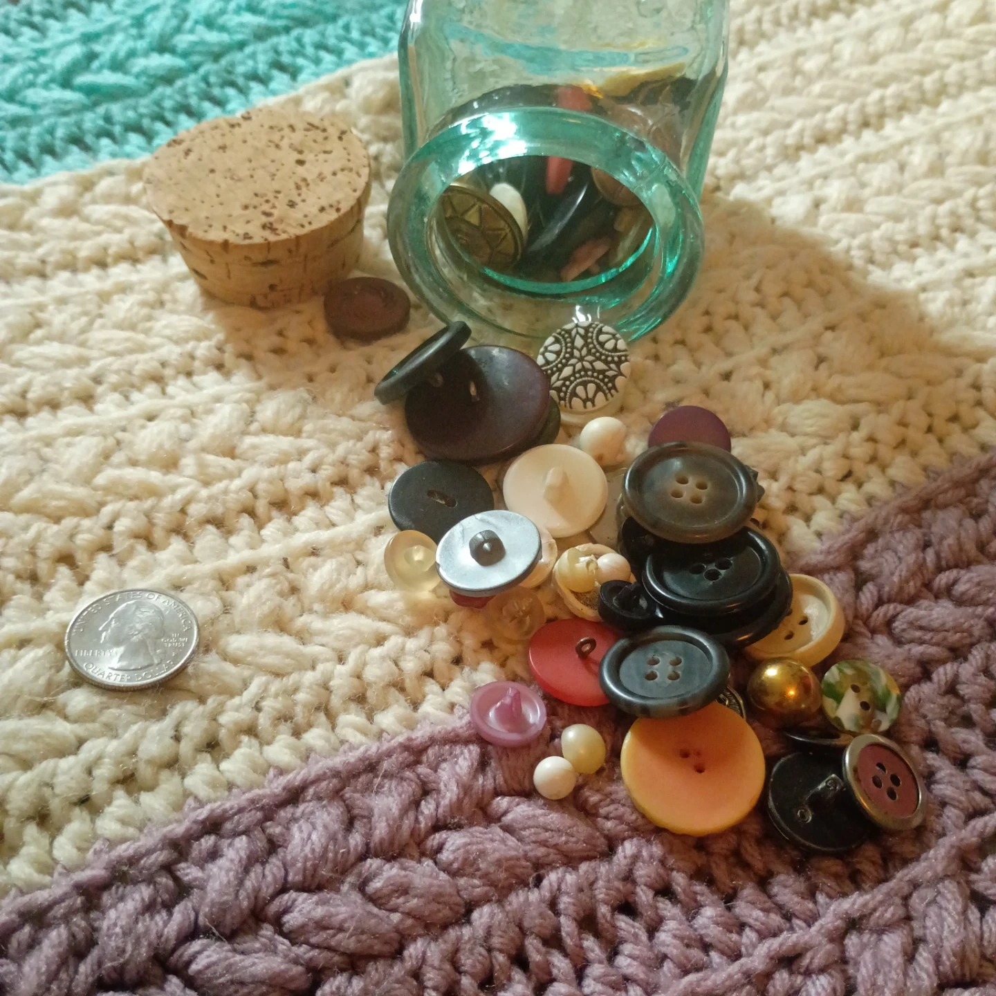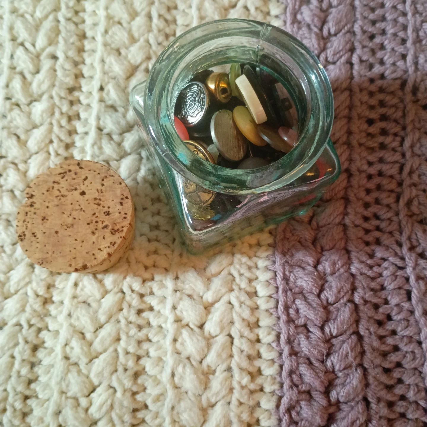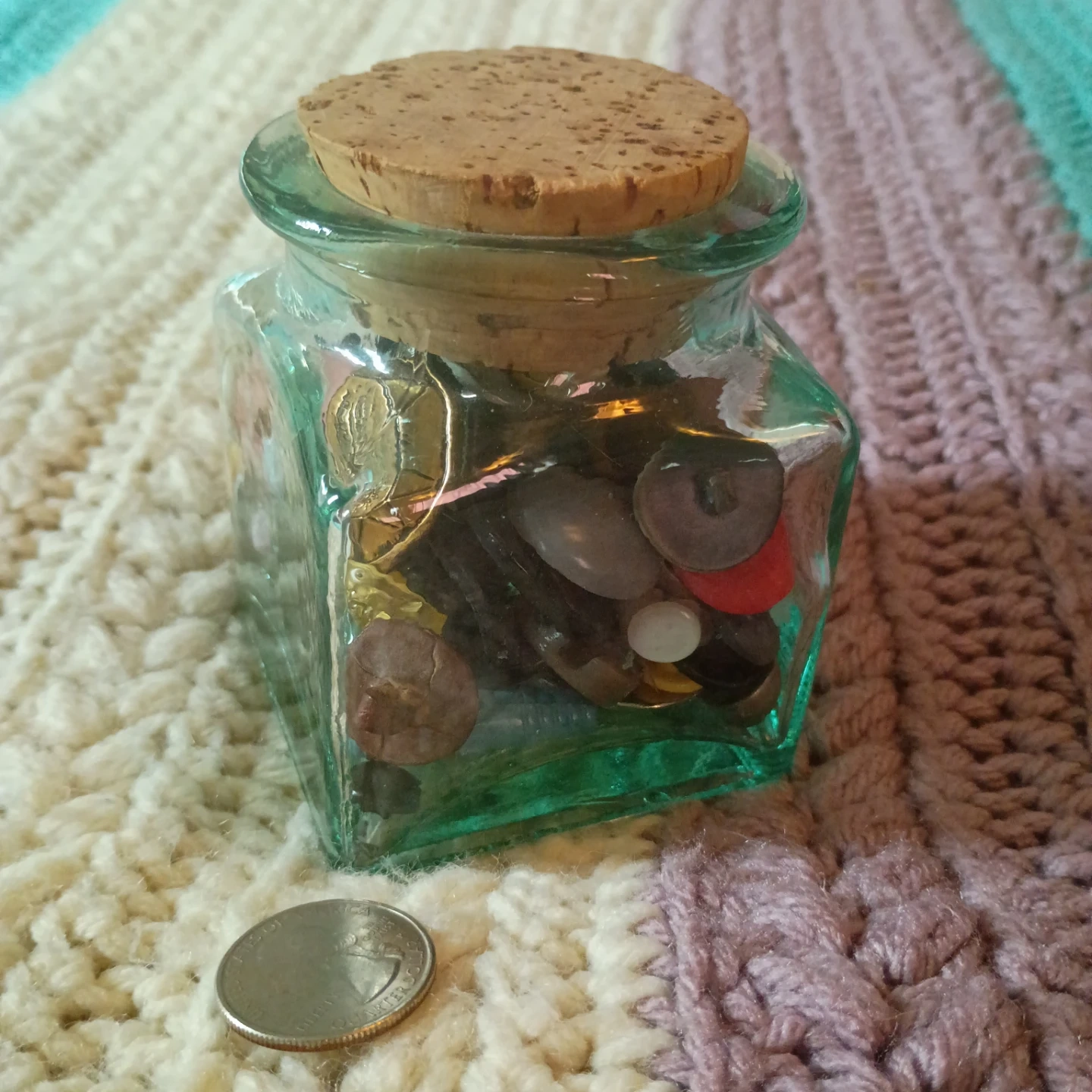 A collection of various buttons in different sizes, colors, and materials. They're stored in a small, clear glass jar with a cork stopper. Includes metal, plastic, and shell buttons.