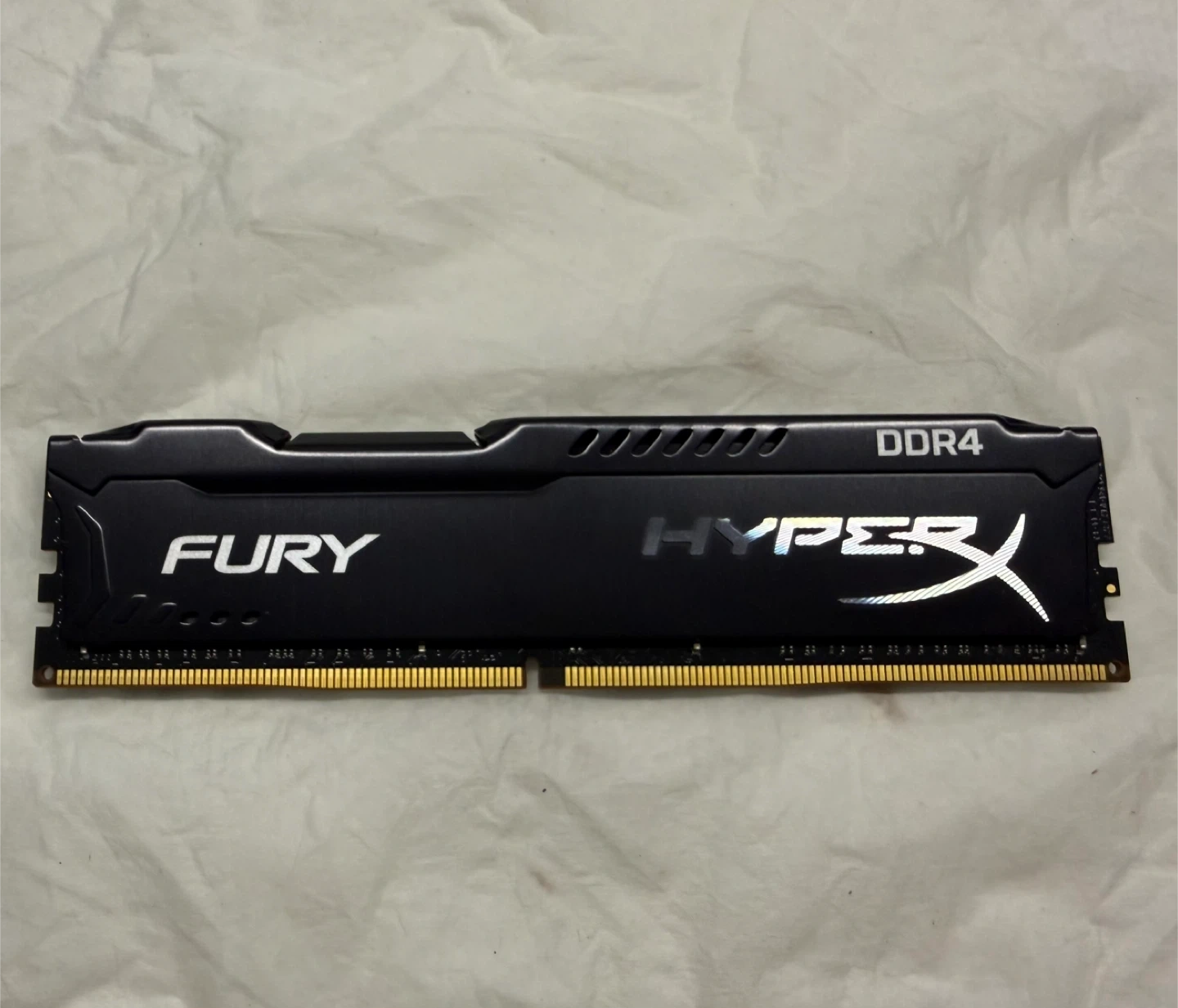 This is a HyperX Fury DDR4 RAM stick. It's black and features the HyperX logo. It's a standard DDR4 16 GB module for computers.