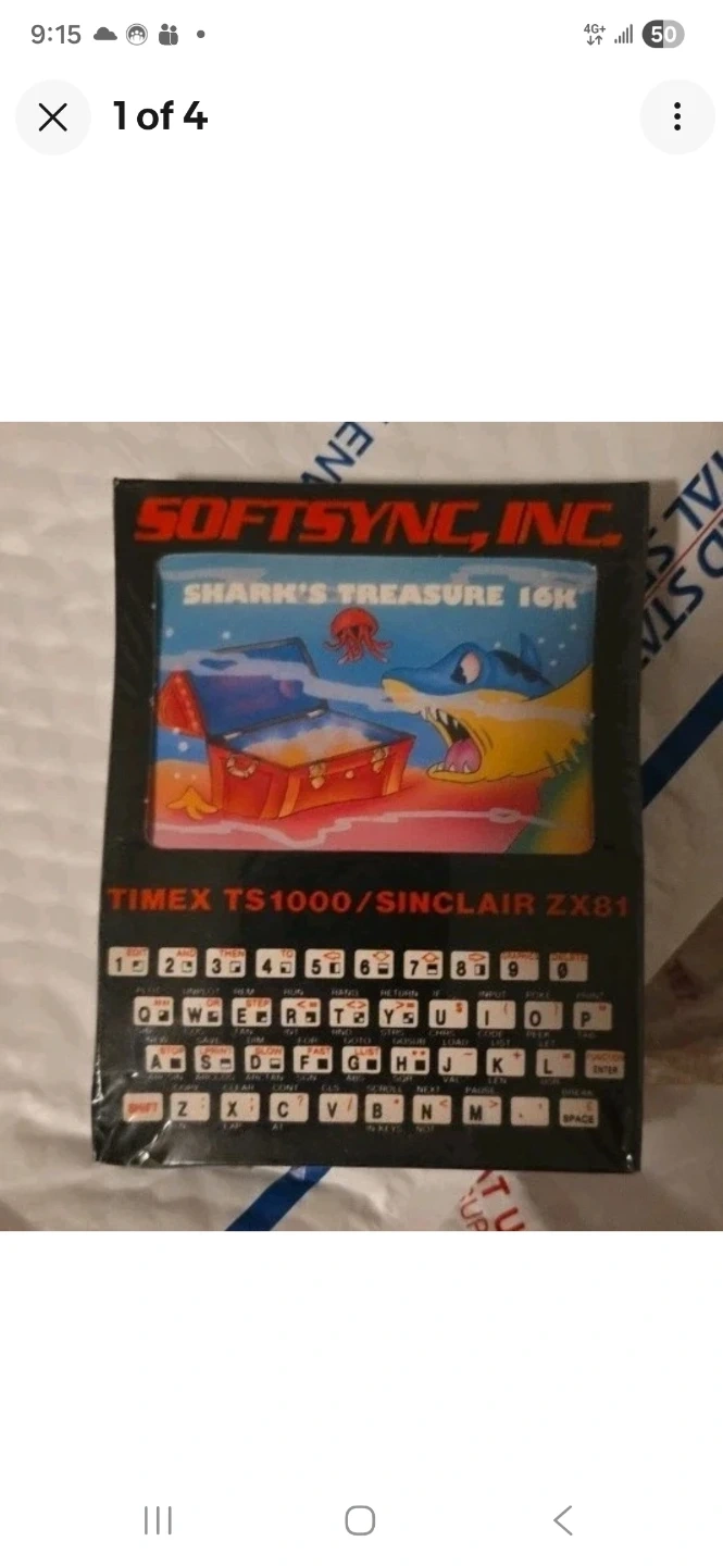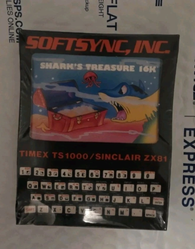 Selling a vintage Softsync Shark's Treasure 16K game for the Timex TS1000/Sinclair ZX81. It comes in the original packaging. A cool find for collectors!