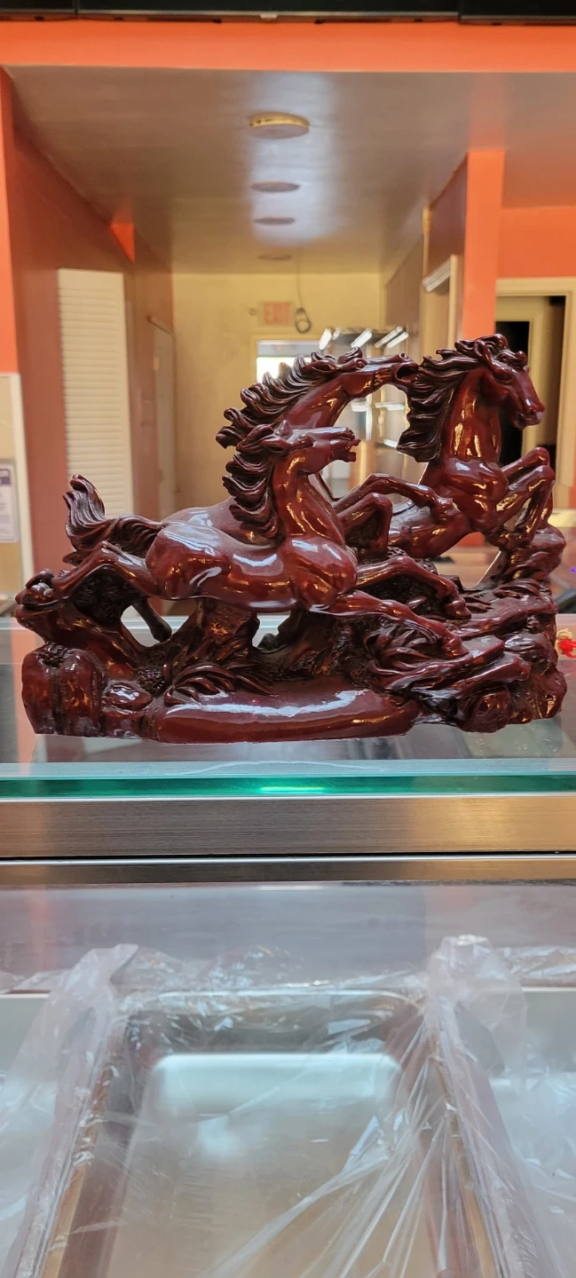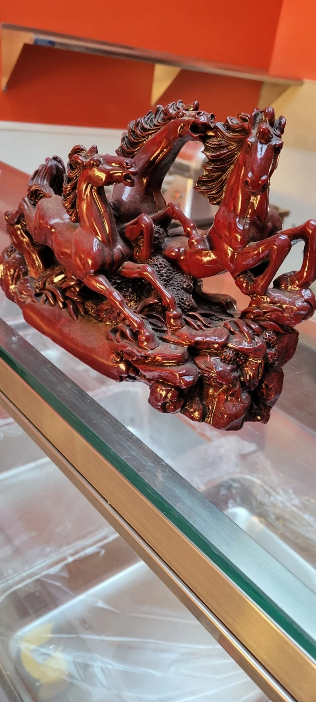 This decorative sculpture features several horses in motion. It's crafted from a dark, reddish-brown material, possibly wood or resin, with a glossy finish. The intricate detailing captures the dynamic energy of the horses.