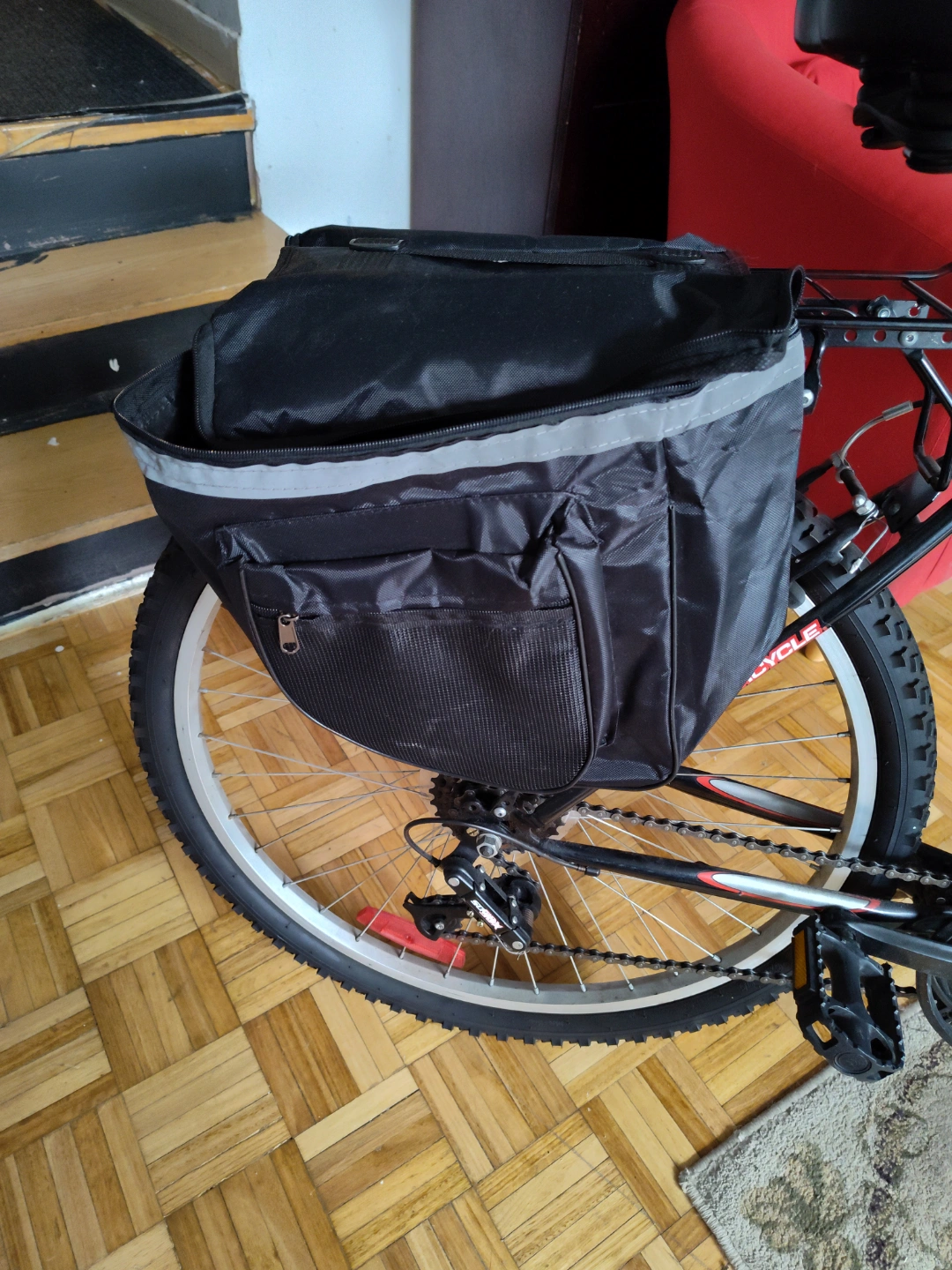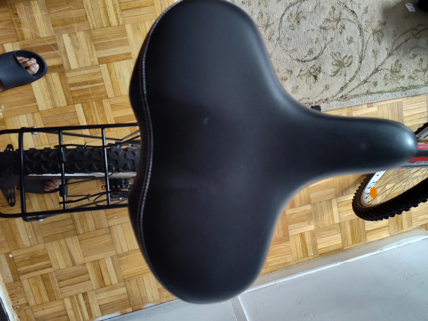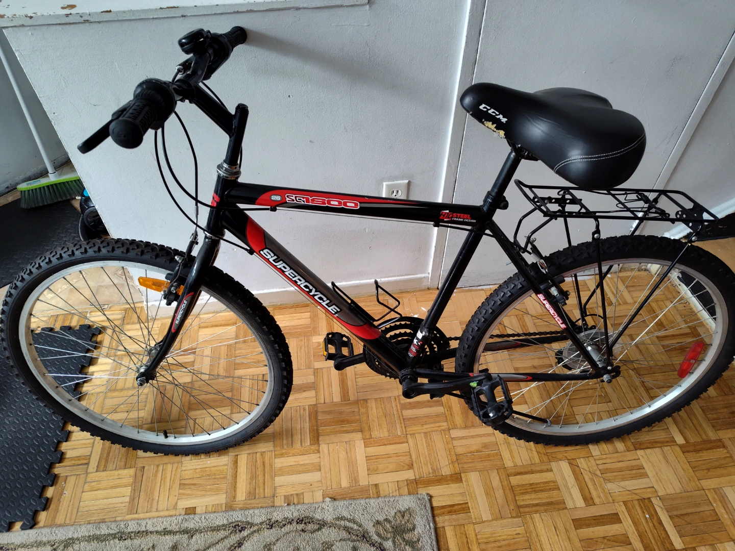 26 inch wheel mountain bike. Black and red frame. Includes rear rack and CCM saddle. Shows some wear and tear on the seat due to squirrel other than that it's a great bike comes with the Bell and a bottle holder the bike was kept indoors so there is a bit of rust the chains are good! serious reply only and cash only thank you for your interest!