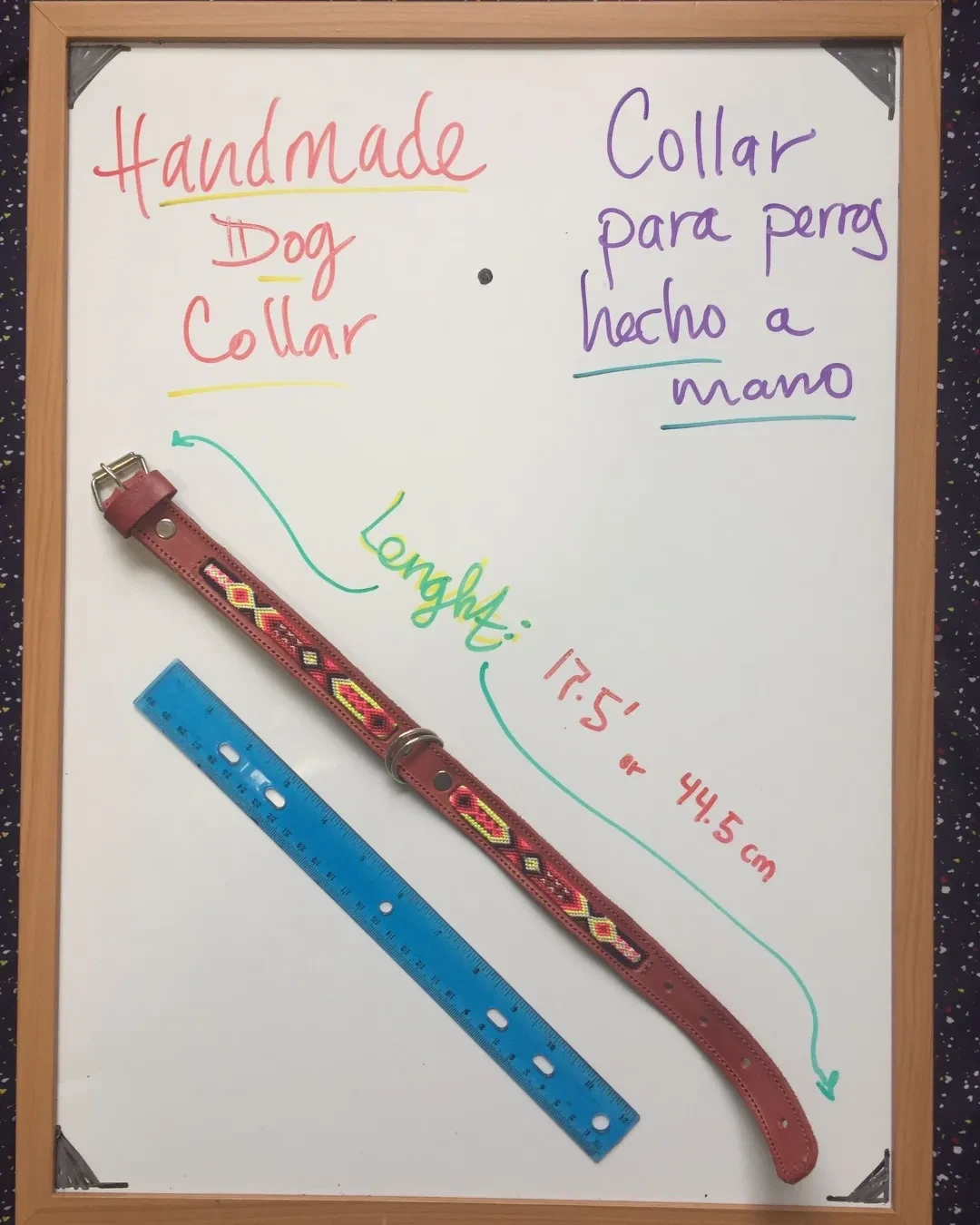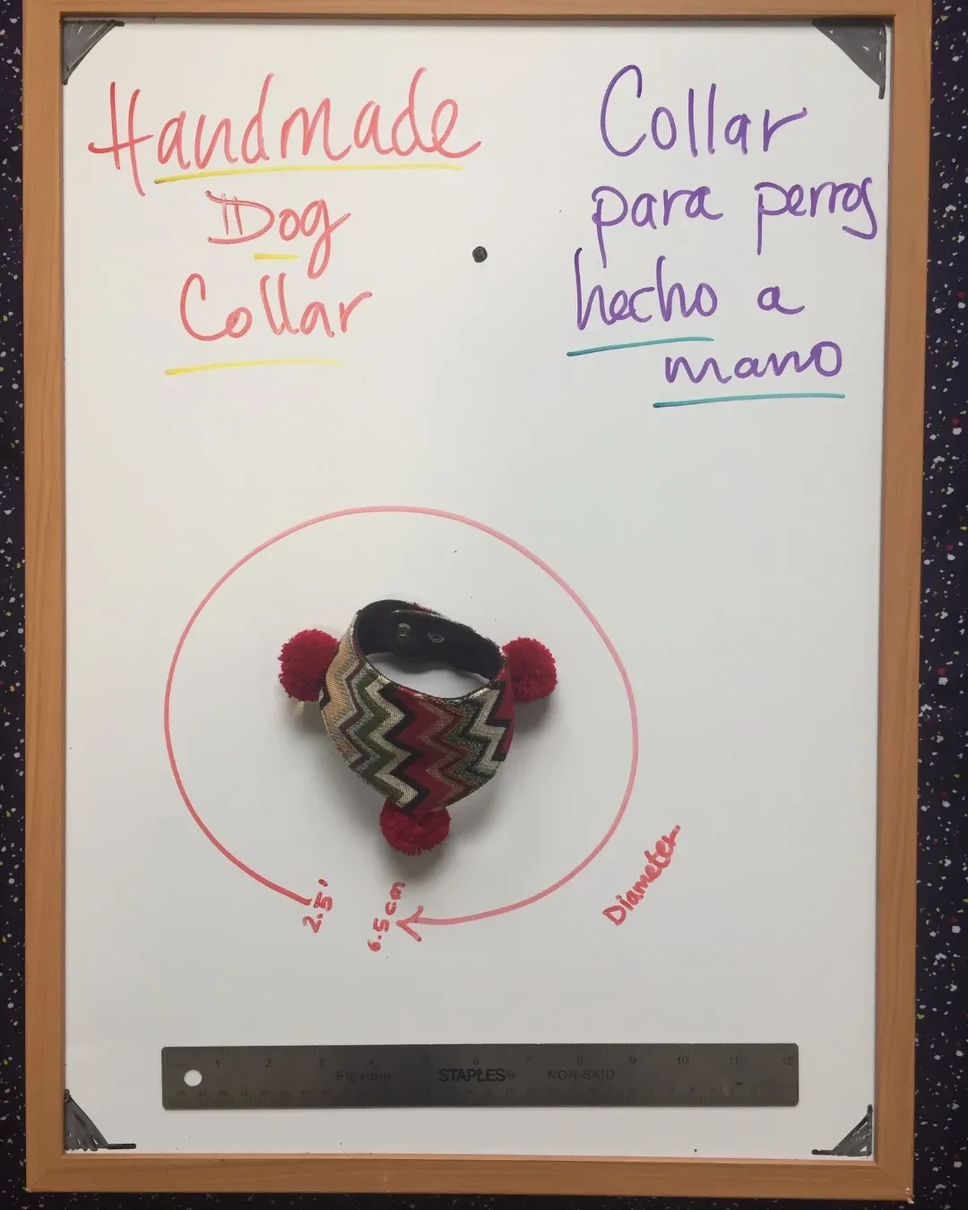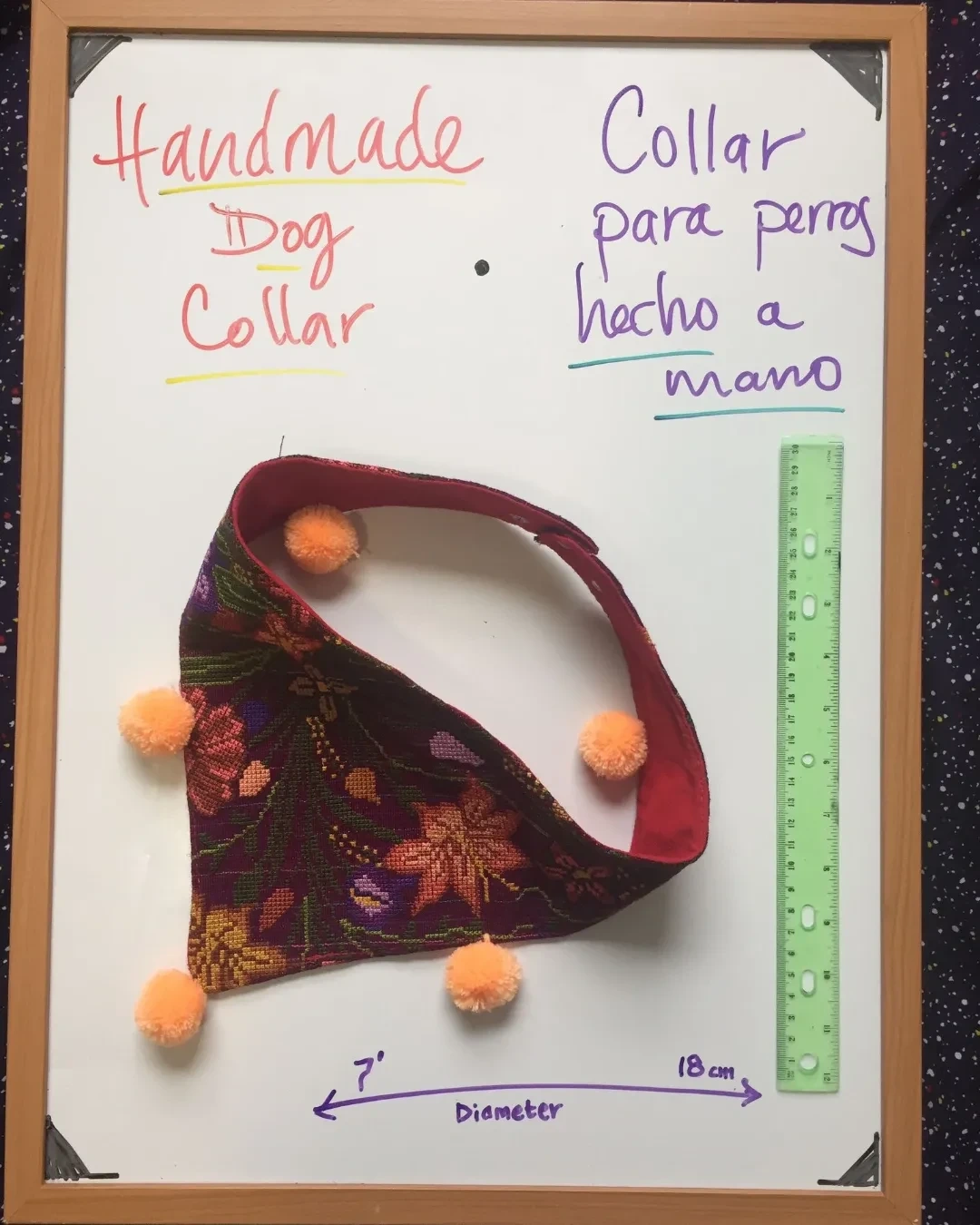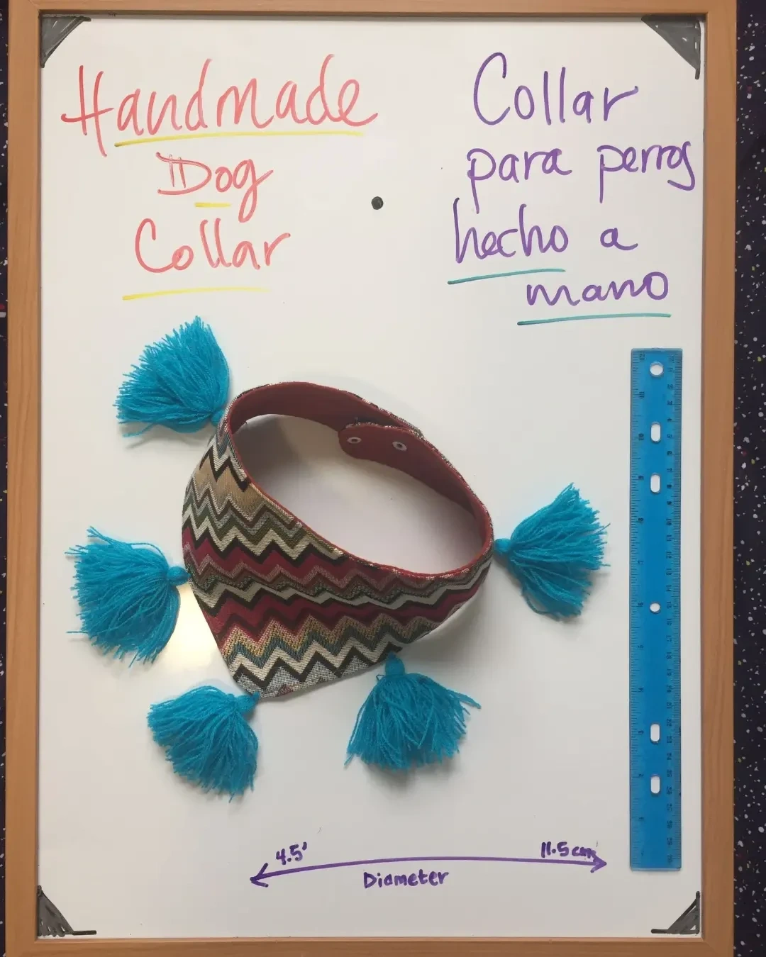 Handmade dog collar with pom poms made by artisans from South of Mexico. Comes in a variety of colours and patterns. Great for small to medium sized dogs.
