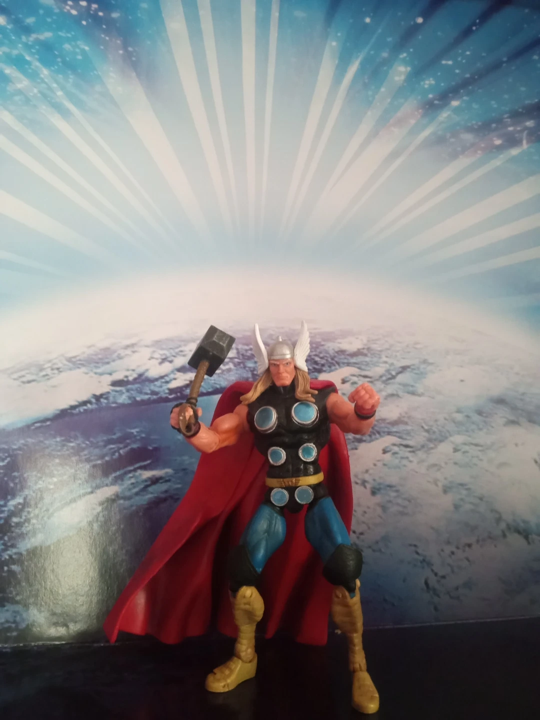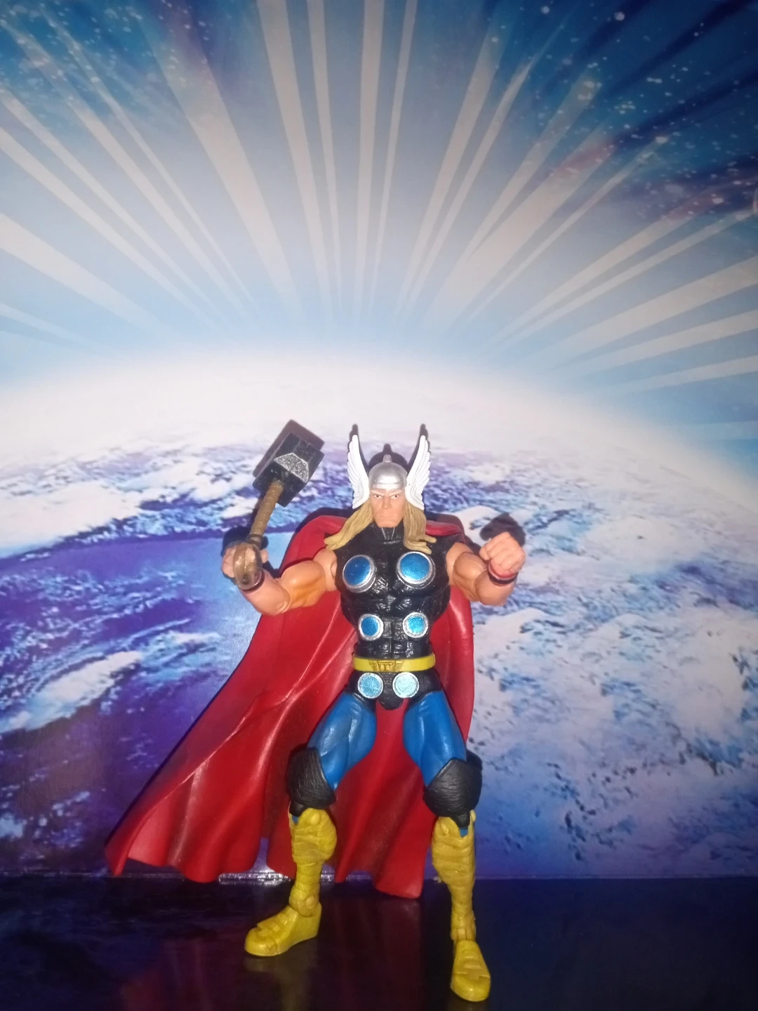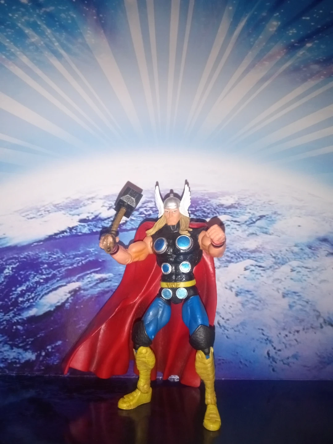 This is a Thor action figure holding his hammer, Mjolnir. It features a red cape and classic Thor costume. This figure is great for Marvel fans and collectors!