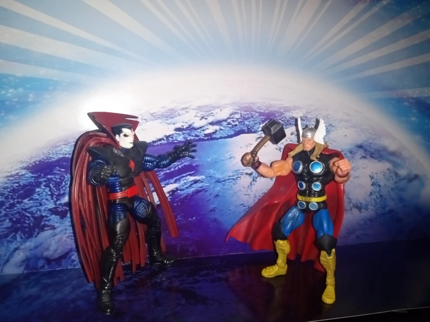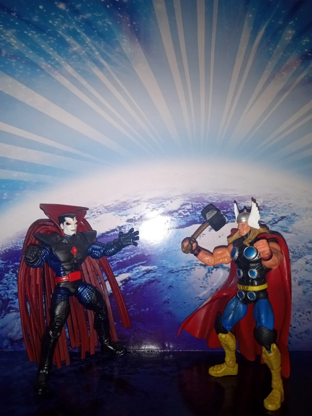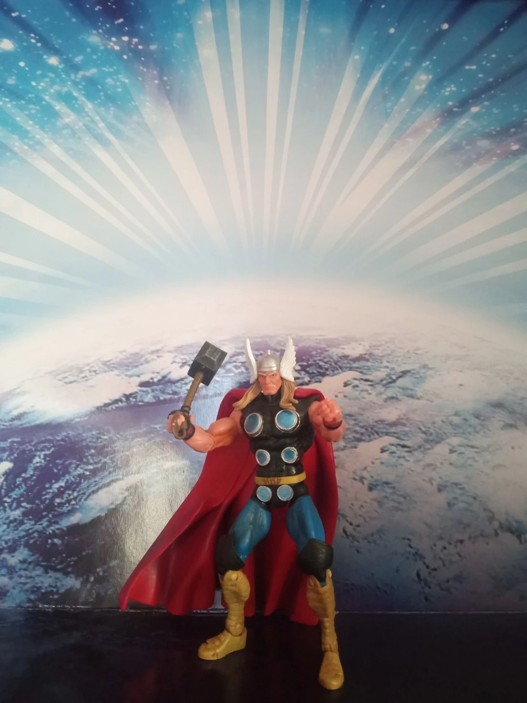 This is a Thor action figure holding his hammer, Mjolnir. It features a red cape and classic Thor costume. This figure is great for Marvel fans and collectors!