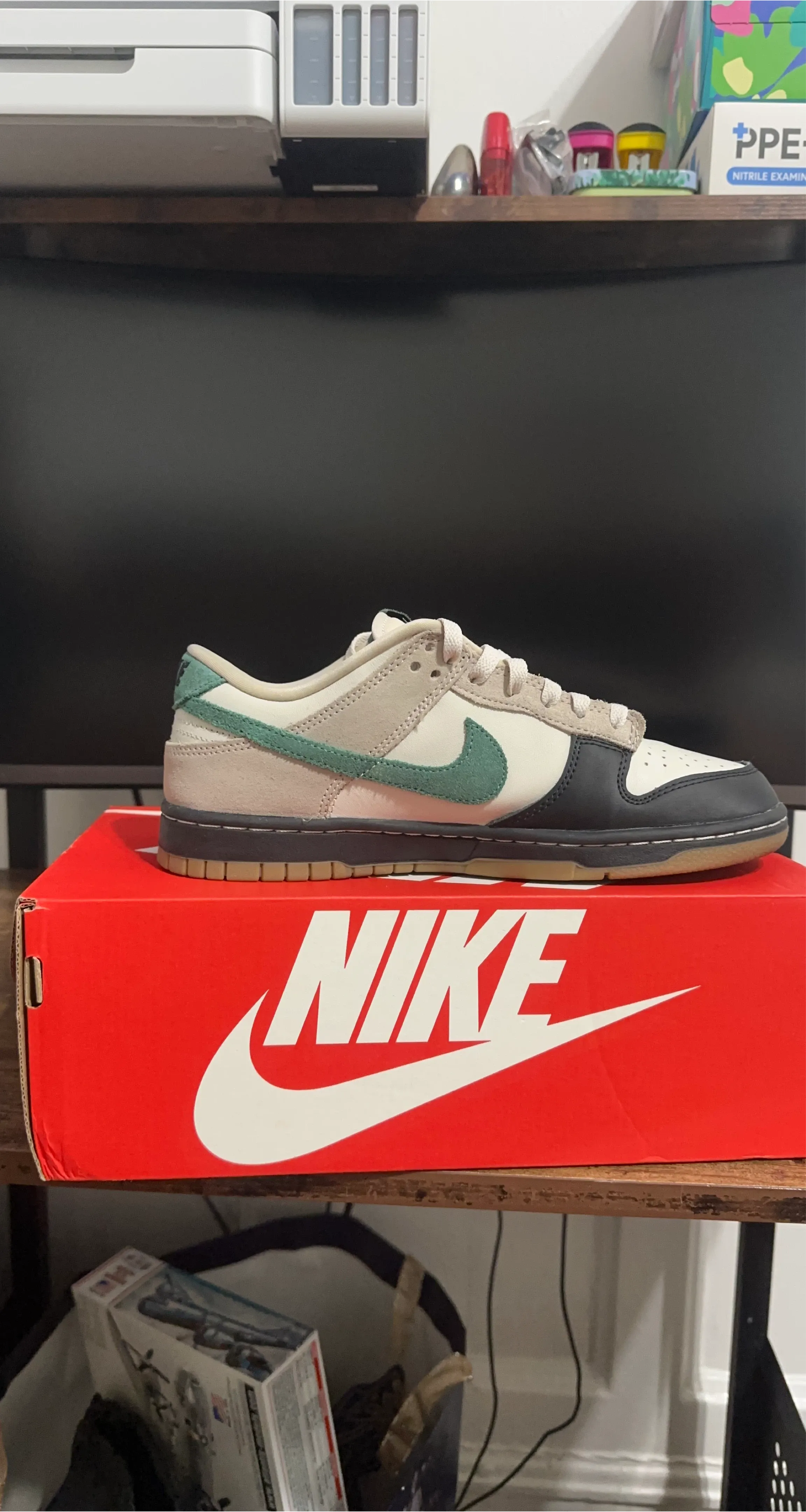Classic Nike Dunk Low sneakers in a "Green Curry" colorway. Features a mix of leather and suede materials. Comes with the original Nike box. Size is not visible in the images.