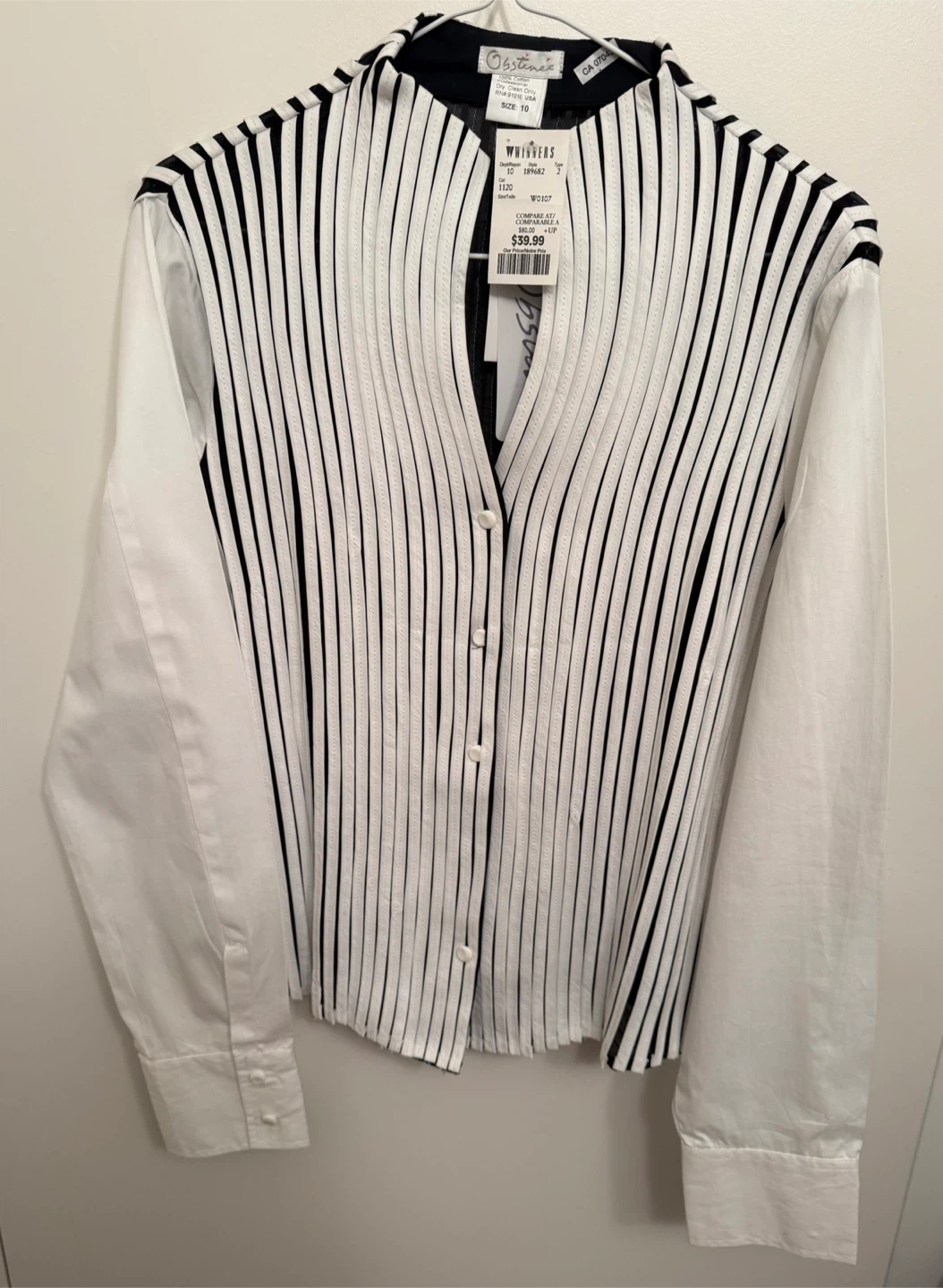 This SESSUN shirt features a striking black and white vertical stripe pleated pattern on the front with a crisp white button-up design. It's a size 10. The sleeves and back are white, offering a nice contrast. It's got buttons all the way up the front.