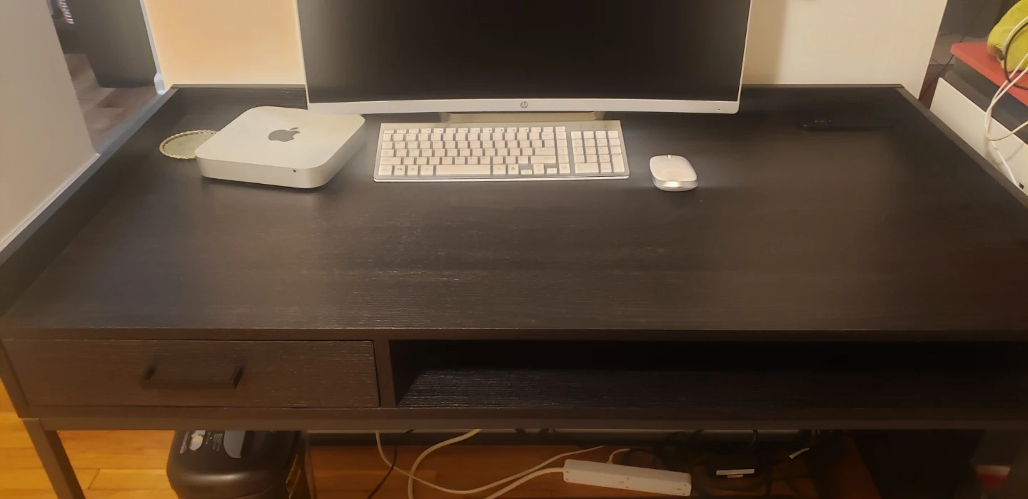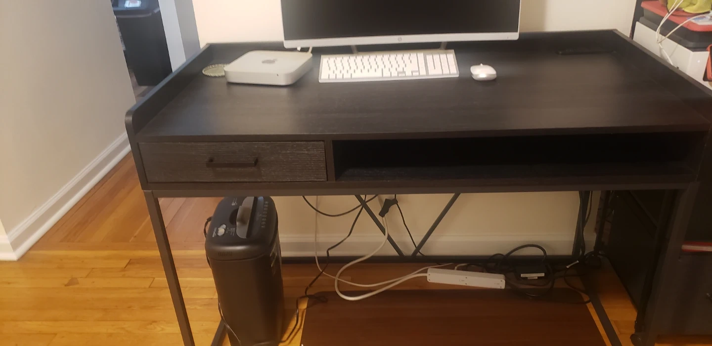 This desk features a spacious top and a convenient drawer for storage. It also has an open shelf area below the desk surface. The dark finish and metal frame give it a modern look. It's a great option for a home office setup.