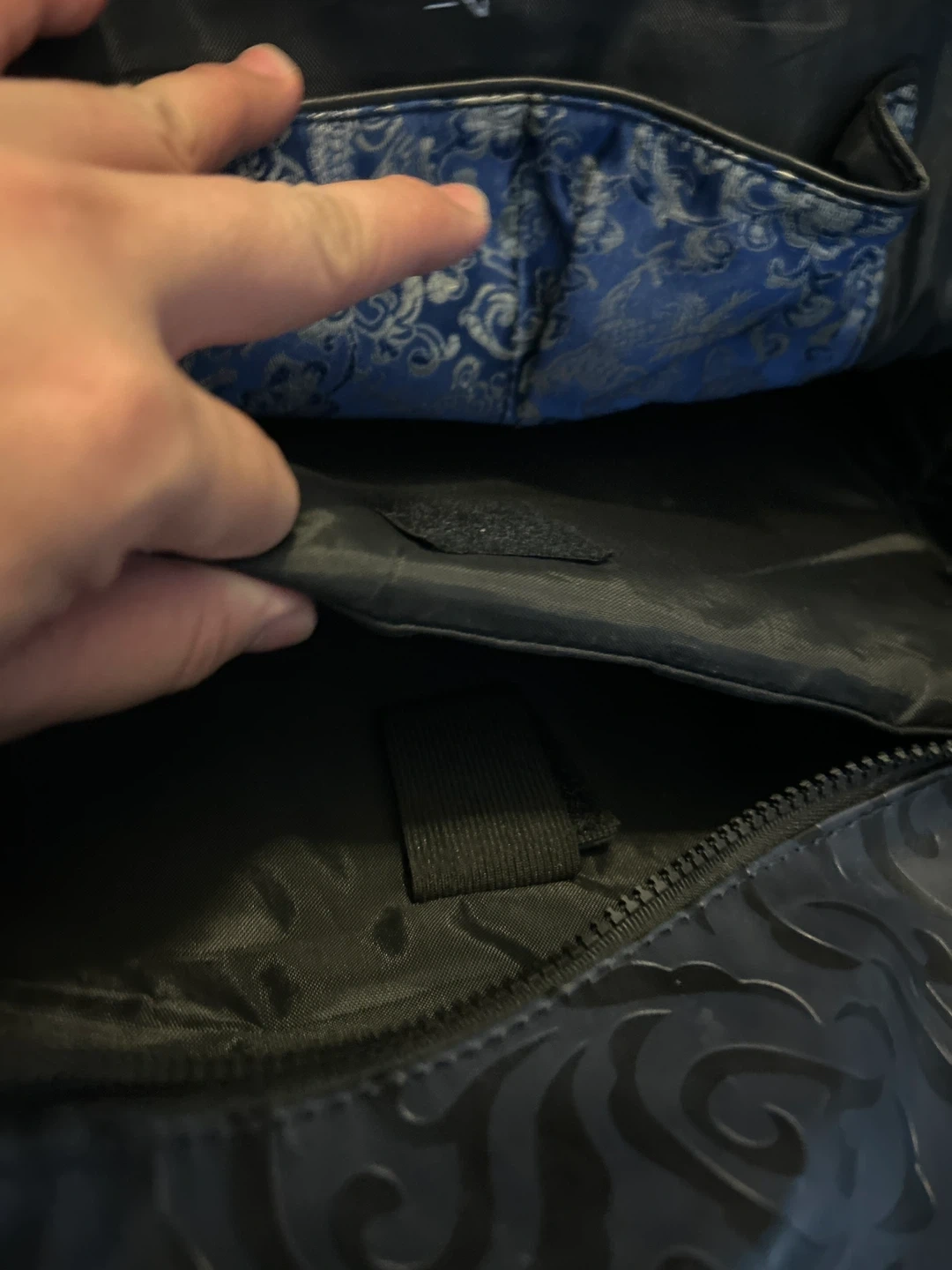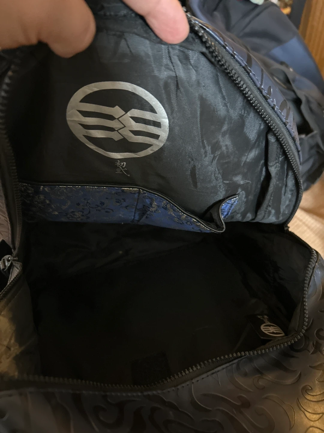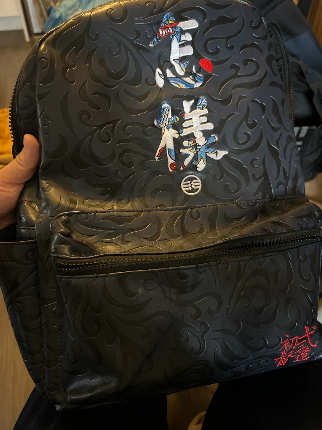 Here's a stylish black backpack with a unique embossed pattern and some Japanese text and designs. It features multiple compartments to keep your belongings organized. Perfect for school, work, or everyday use!