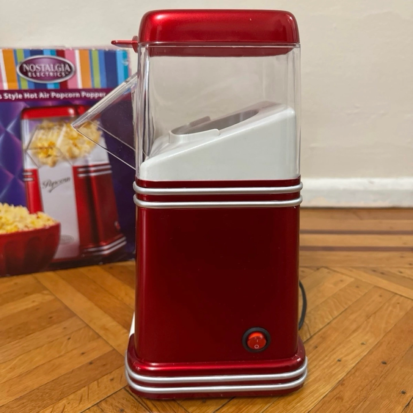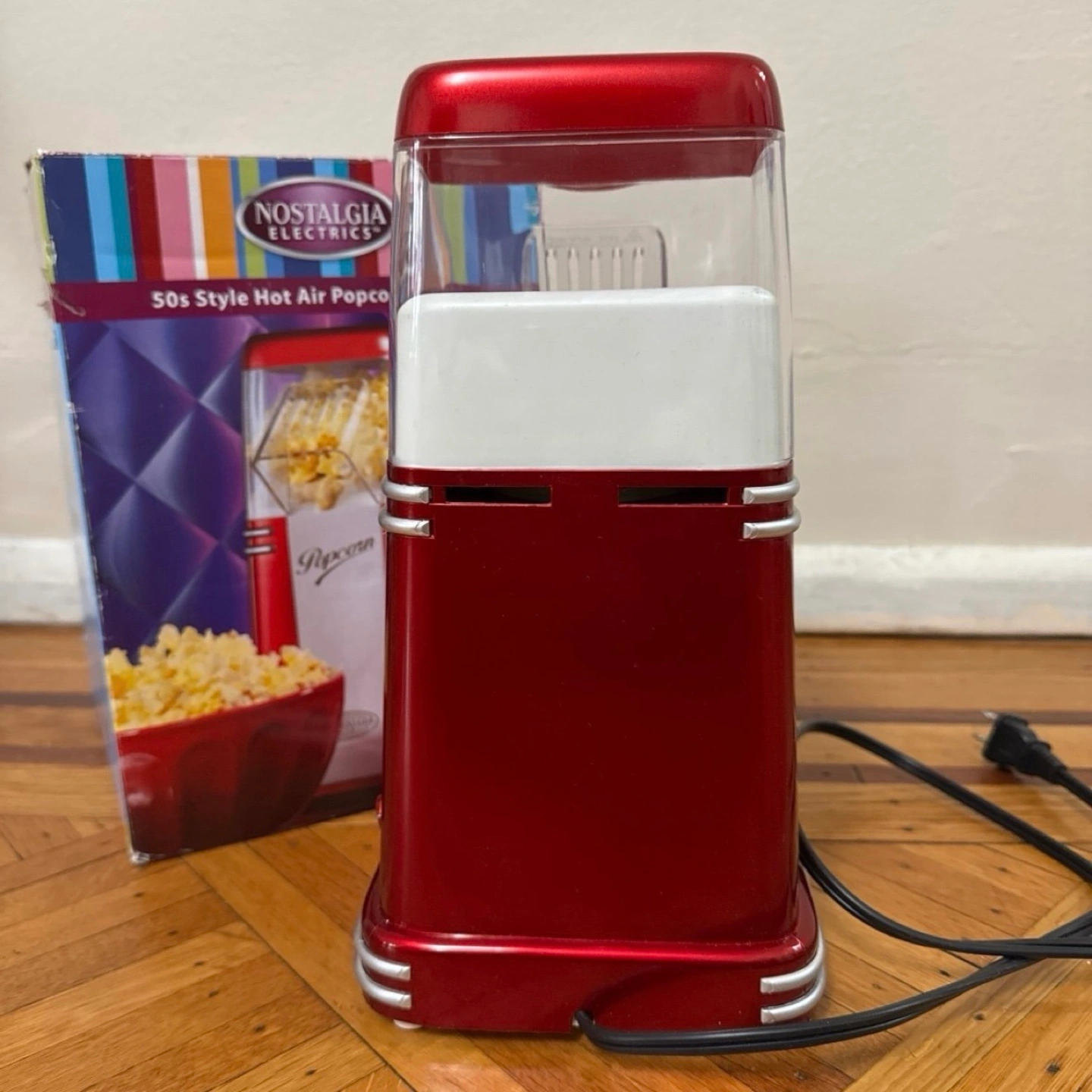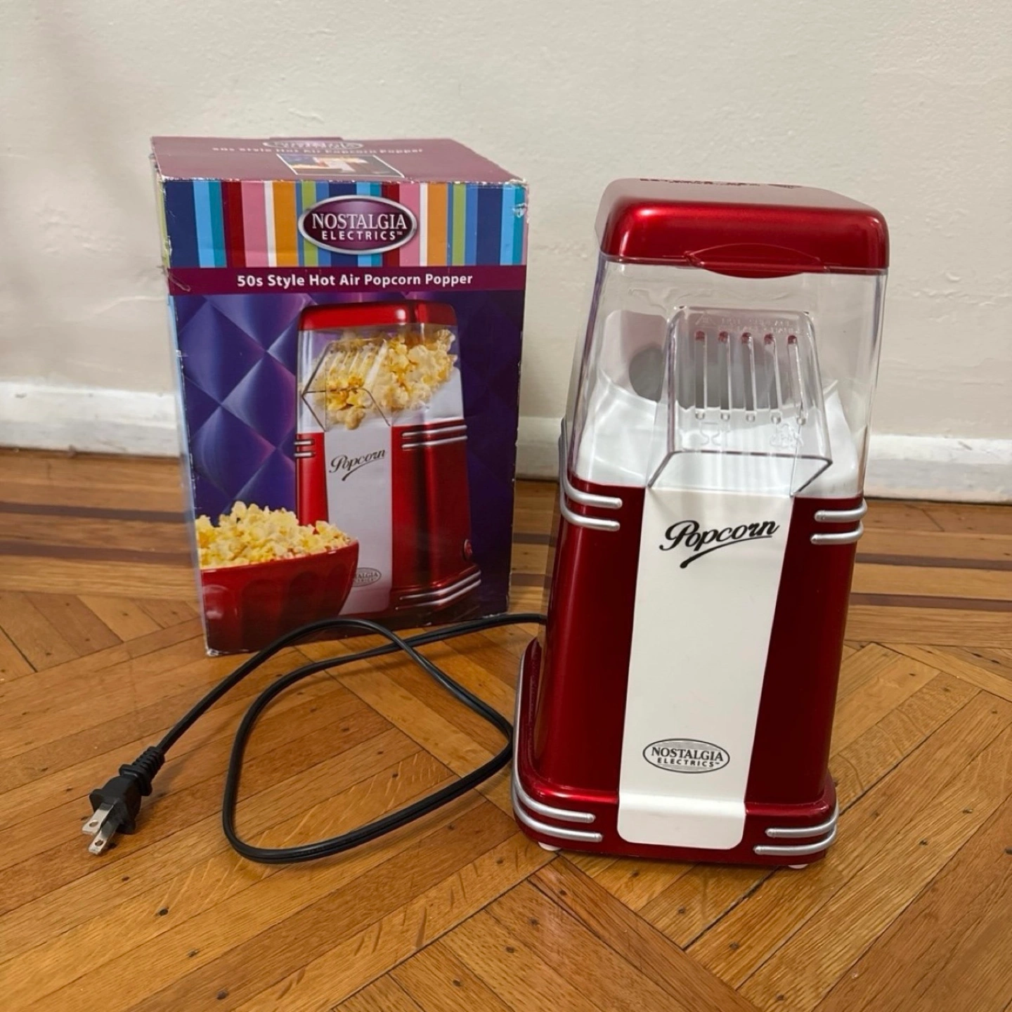Red and white popcorn popper. Includes original box.