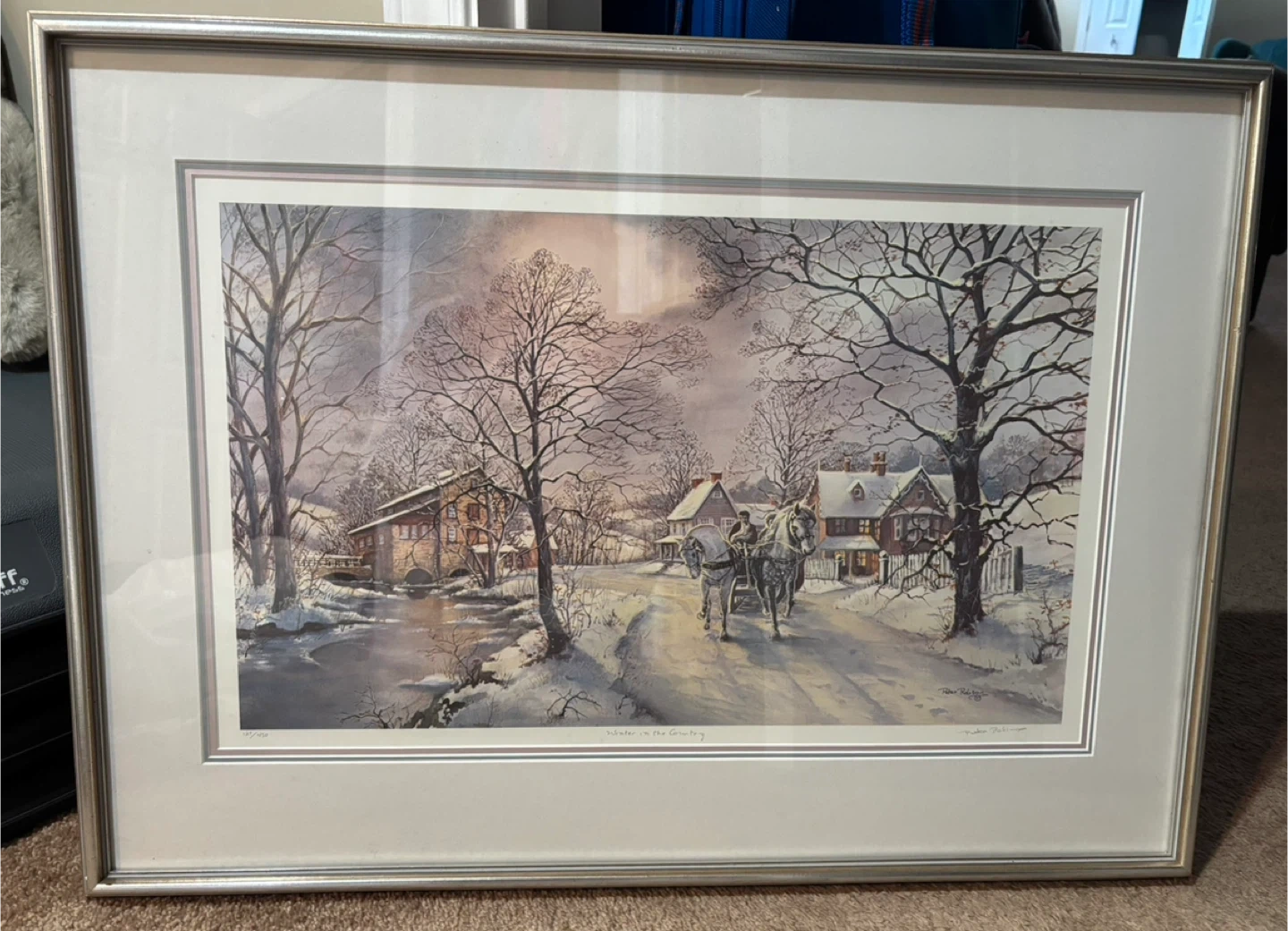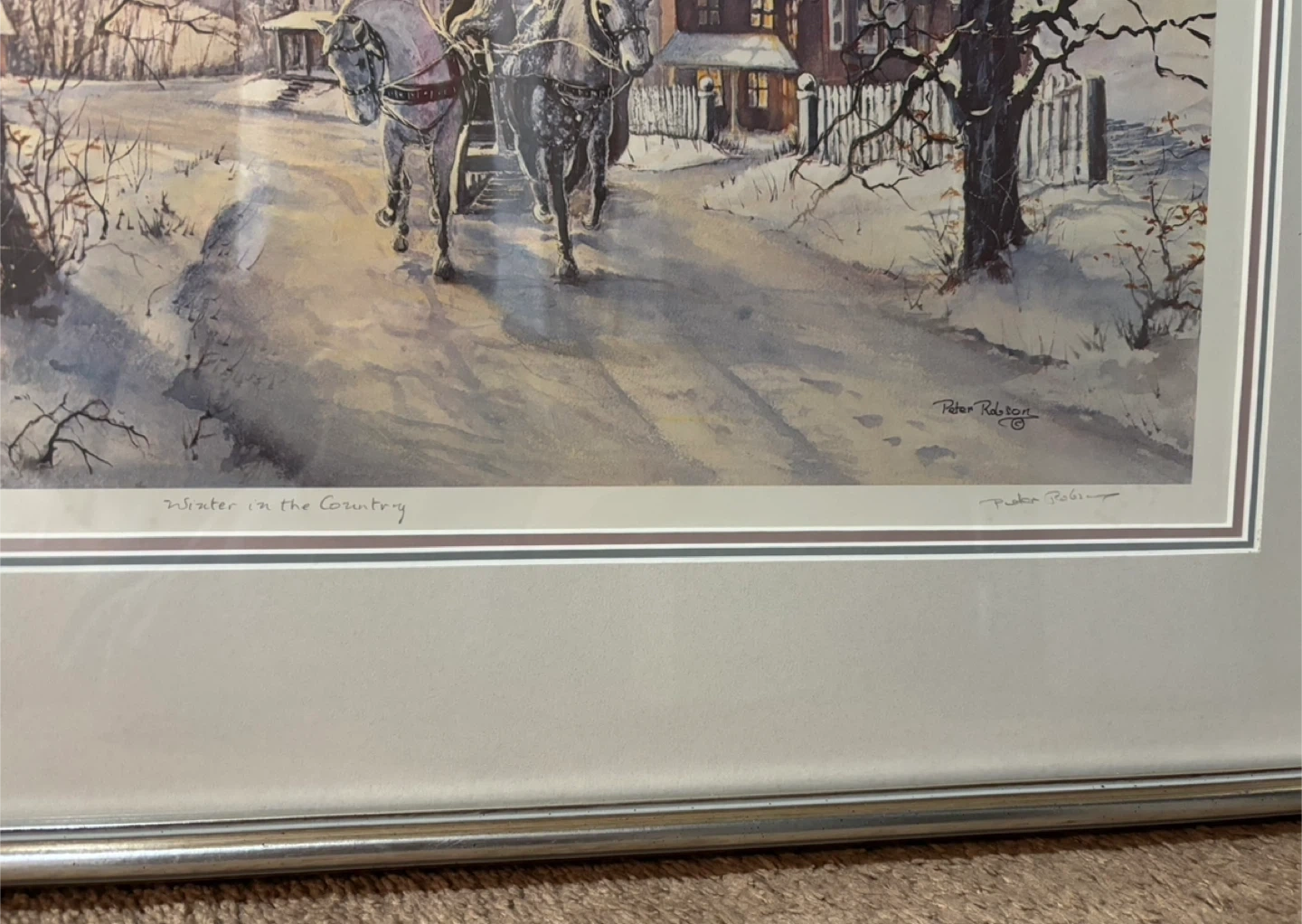 Framed print titled "Winter in the Country" by artist Peter Robson. It's a lovely winter scene featuring a horse-drawn carriage. This piece comes from the Visions Art Gallery.