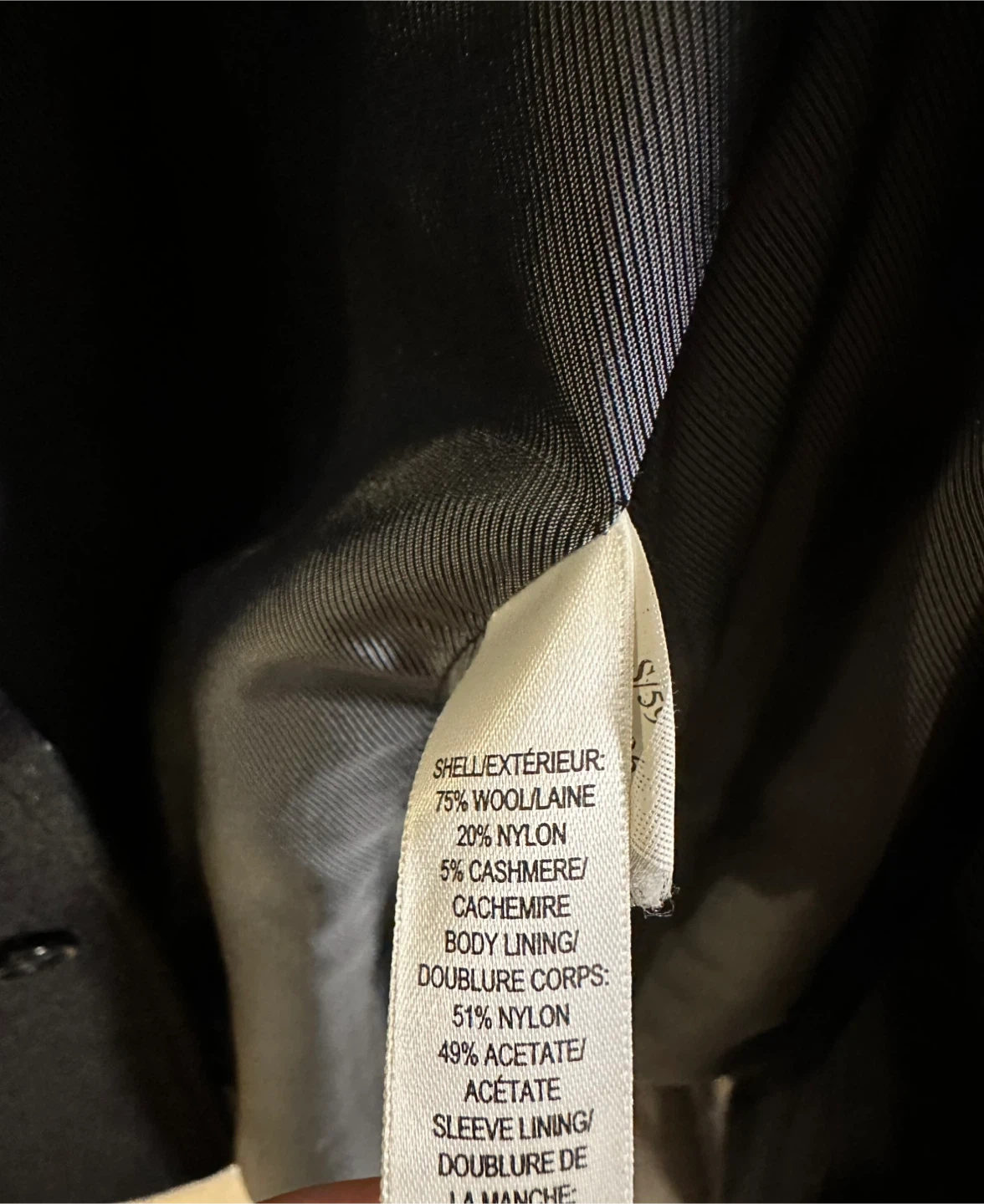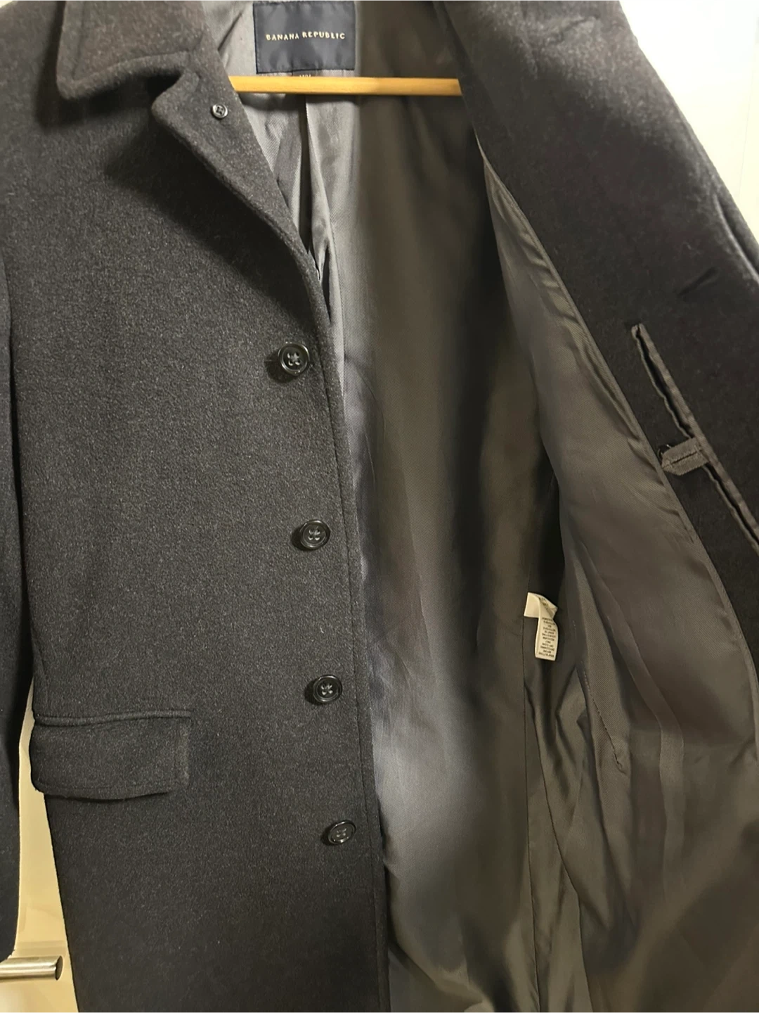 This Banana Republic coat is made from a blend of 75% wool, 20% nylon, and 5% cashmere. The body lining is 51% nylon and 49% acetate. Sleeve lining is also acetate. It's a charcoal grey colour.