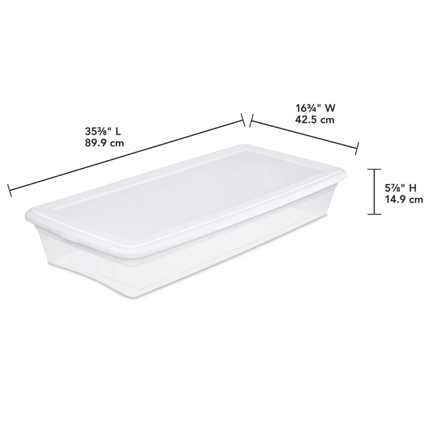 Clear plastic storage box with a white lid. Perfect for underbed storage. Dimensions: d35 5/8" L x 16 ¼" W x 5 ⅝" H. Holds 39 liters. Originally 17.9 per one but I will give it to you 10 for 2 boxes
