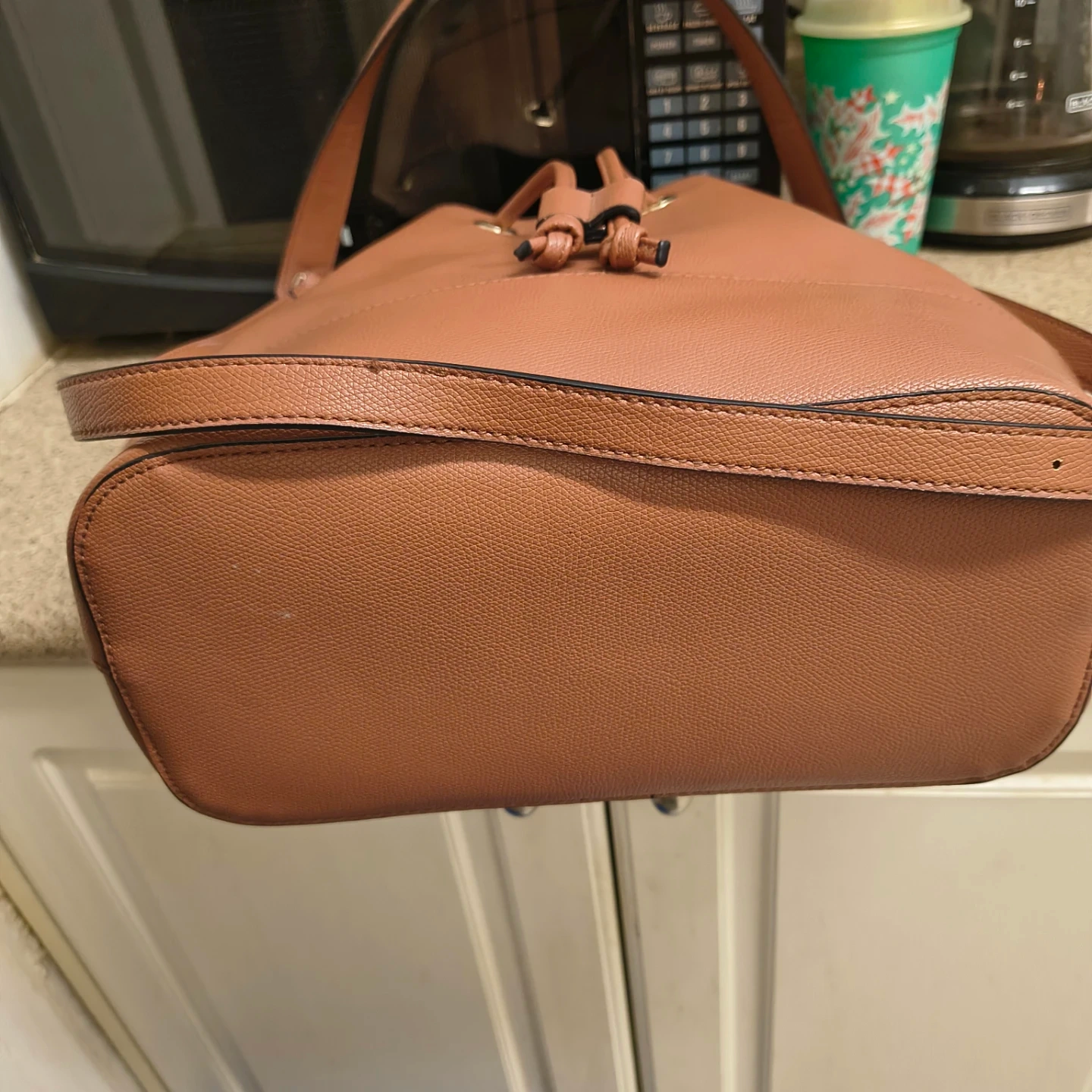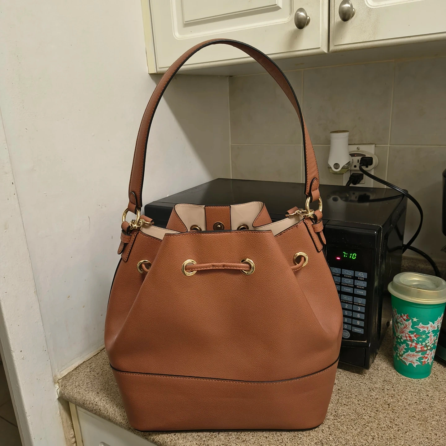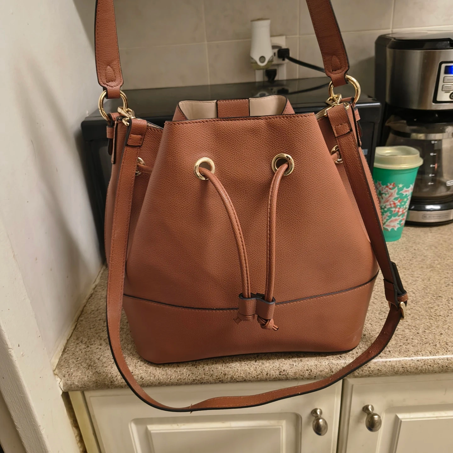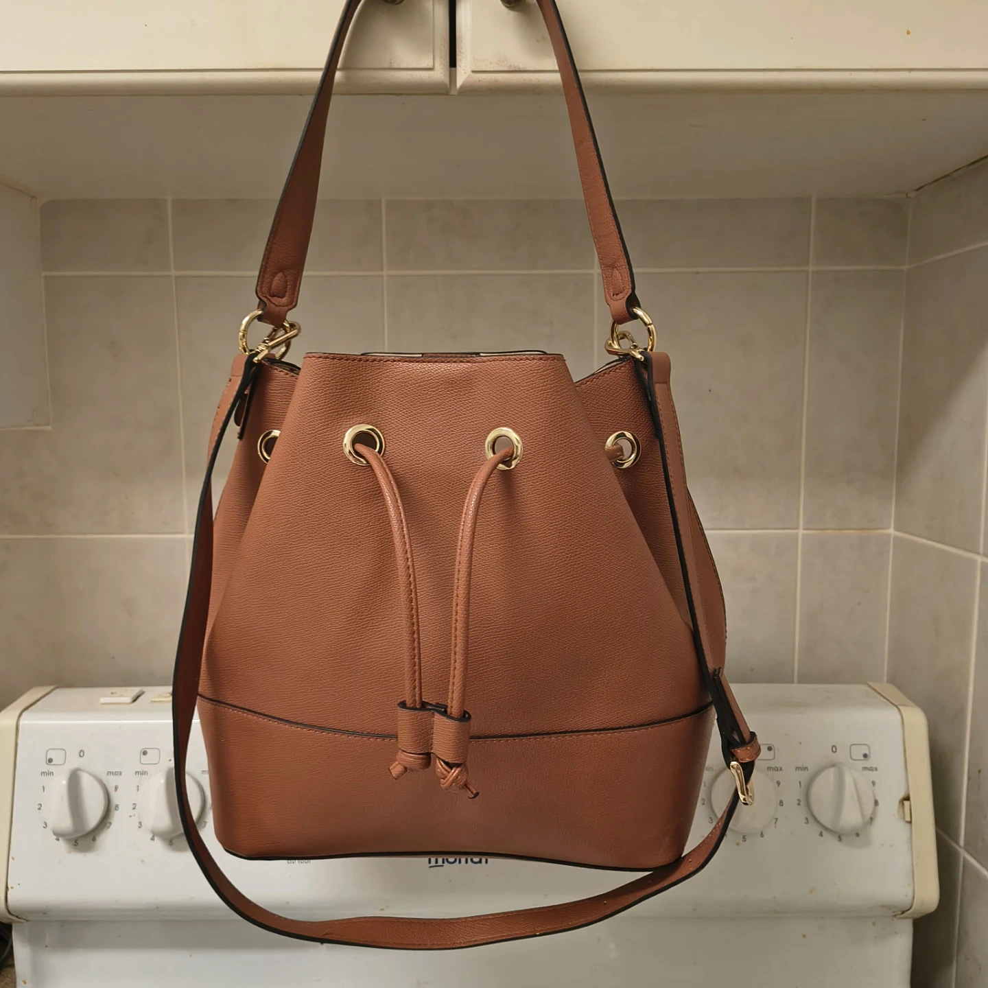 This is an H&M bucket bag in a brown faux leather material. It has a drawstring closure and multiple strap options. It's a stylish bag for everyday use.