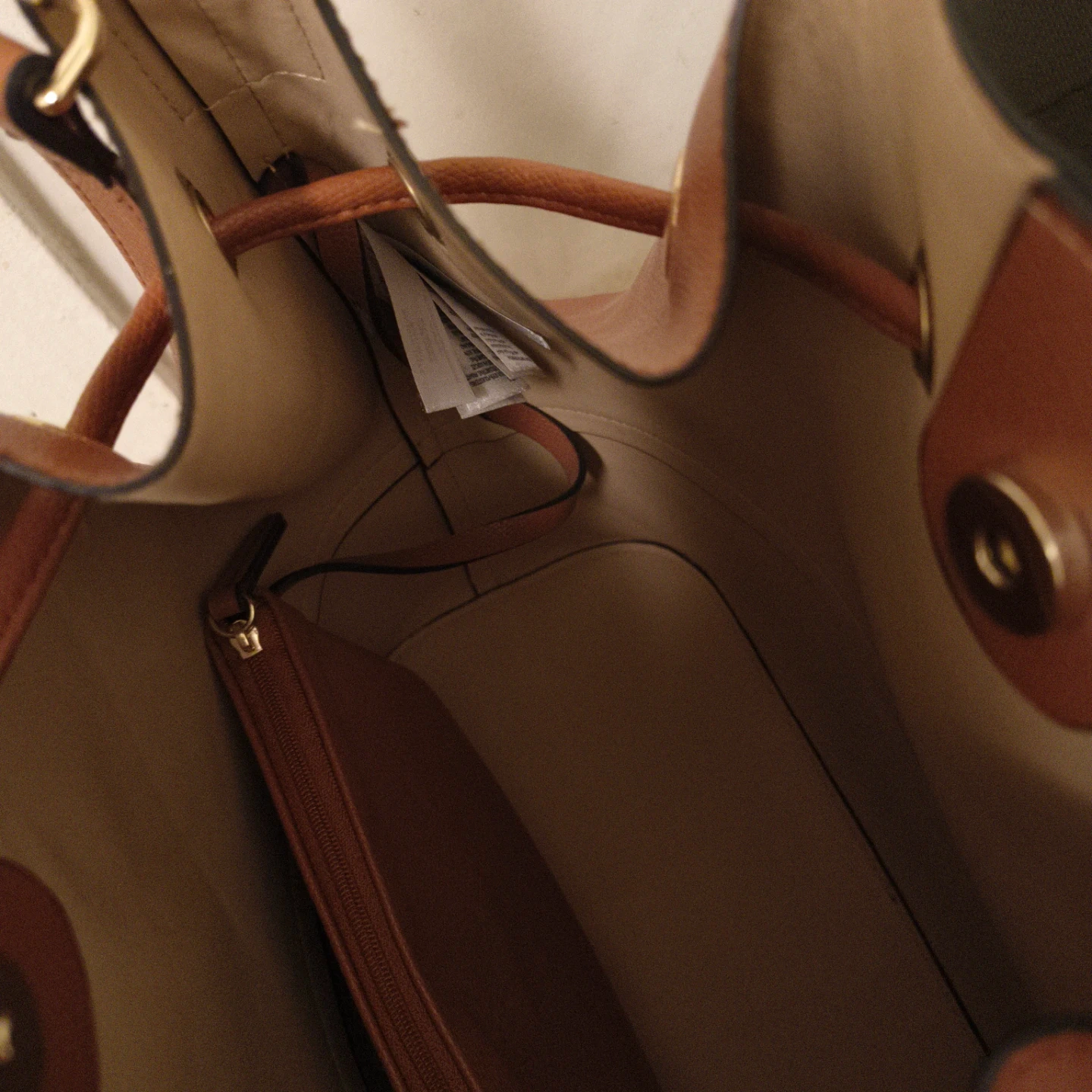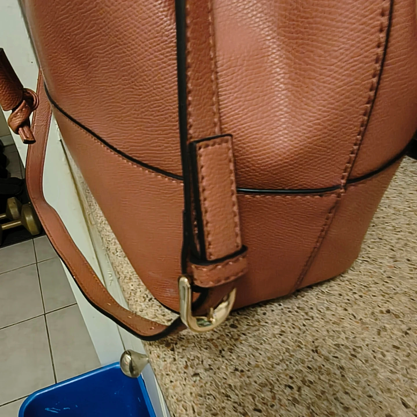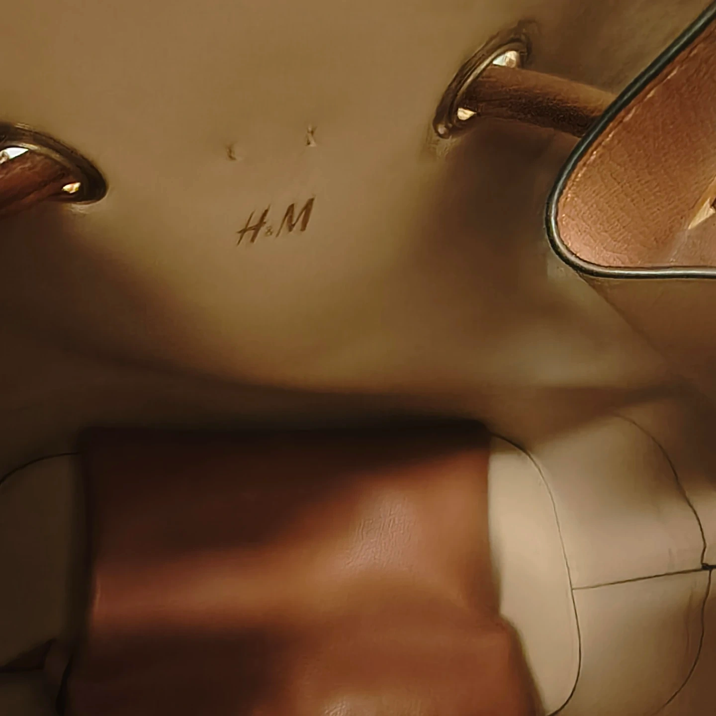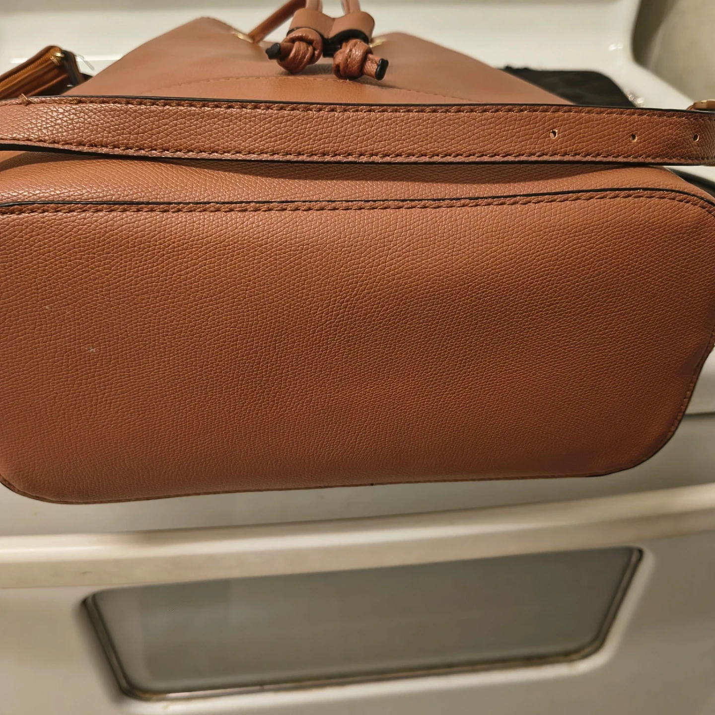 This is an H&M bucket bag in a brown faux leather material. It has a drawstring closure and multiple strap options. It's a stylish bag for everyday use.
