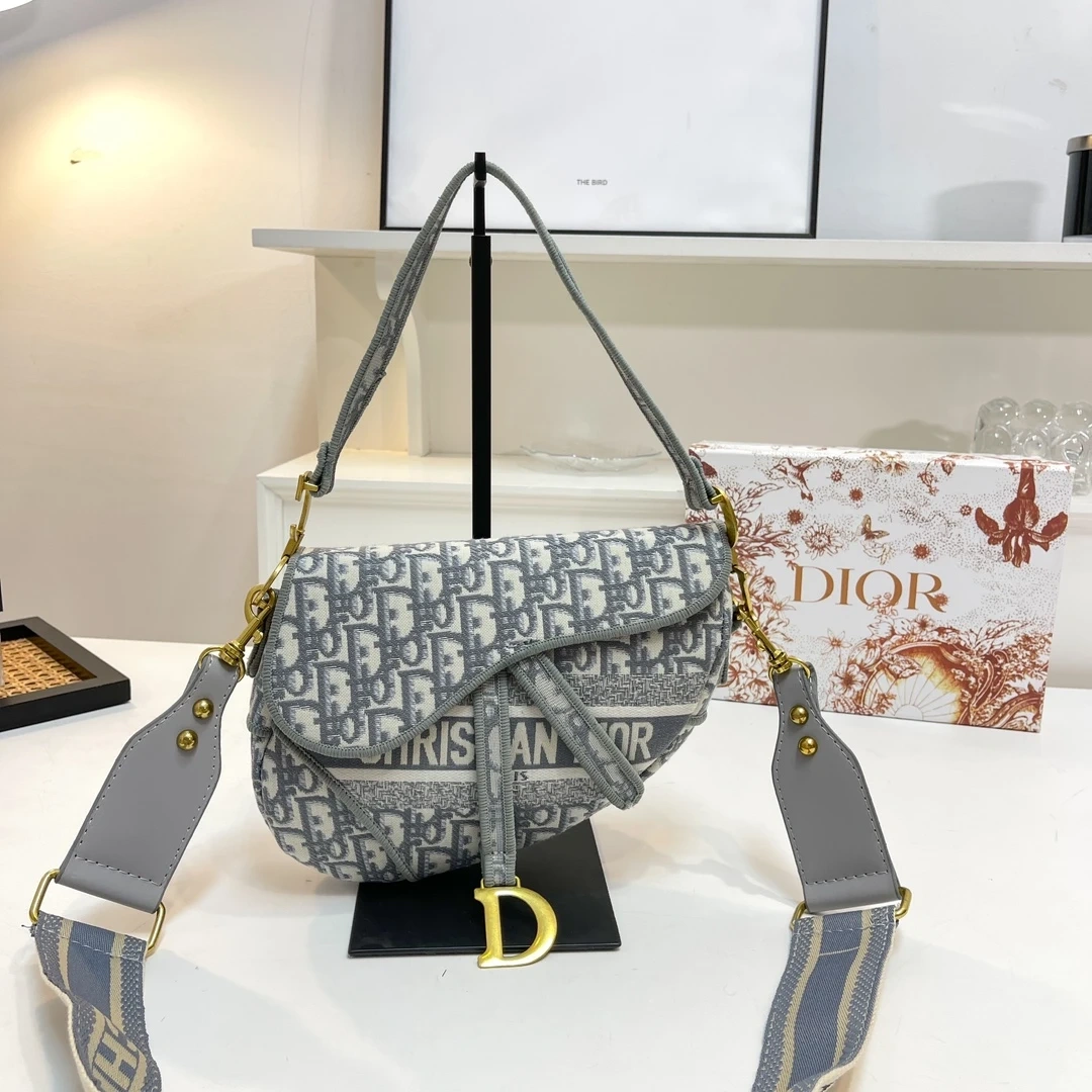Saddle Bag in the signature Oblique pattern. It features a canvas exterior with leather trim and a gold-tone 'D' charm. Includes original box.