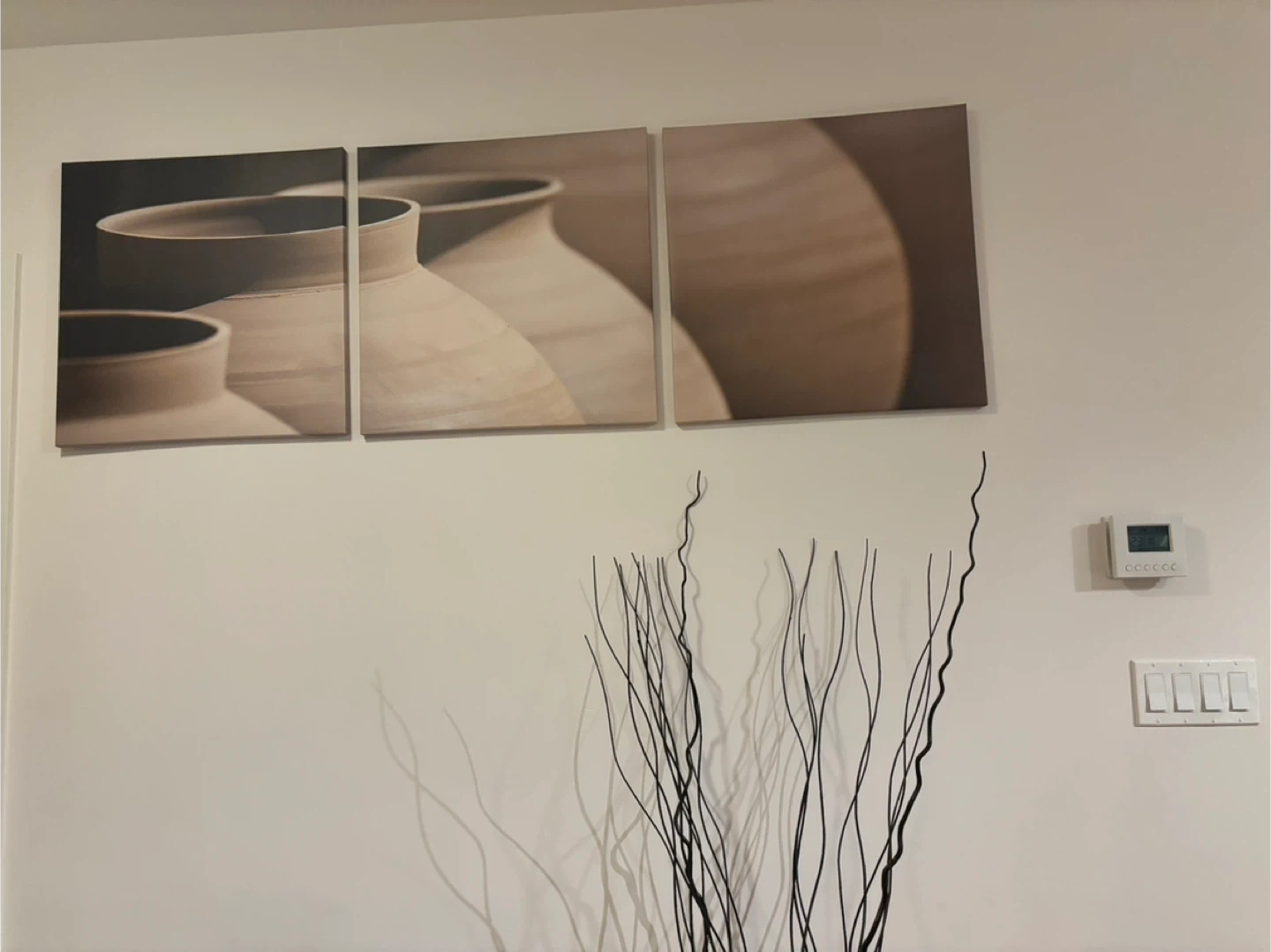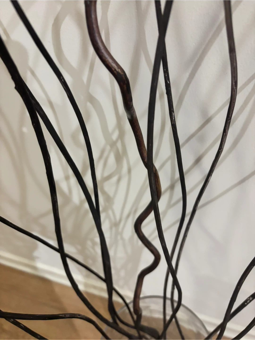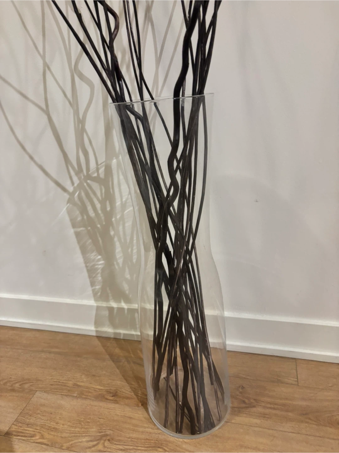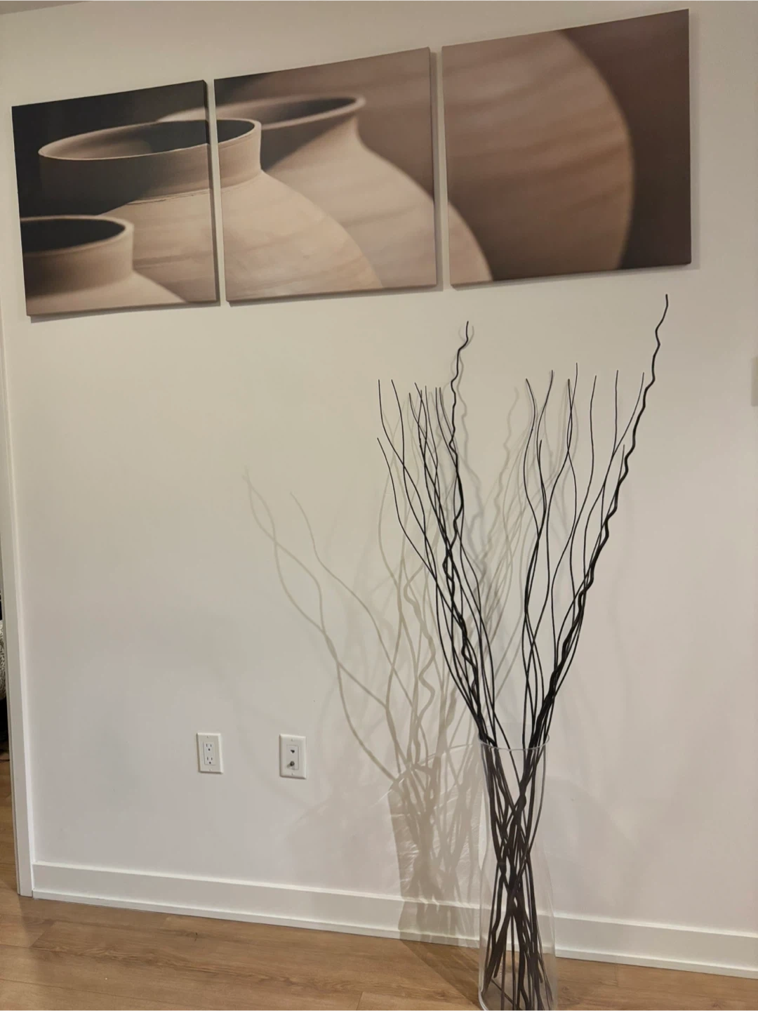 A clear glass vase filled with dark, decorative branches. It adds a modern touch to any space. The vase is tall and slender, perfect for displaying as a standalone decor piece. 3 piece wall art.