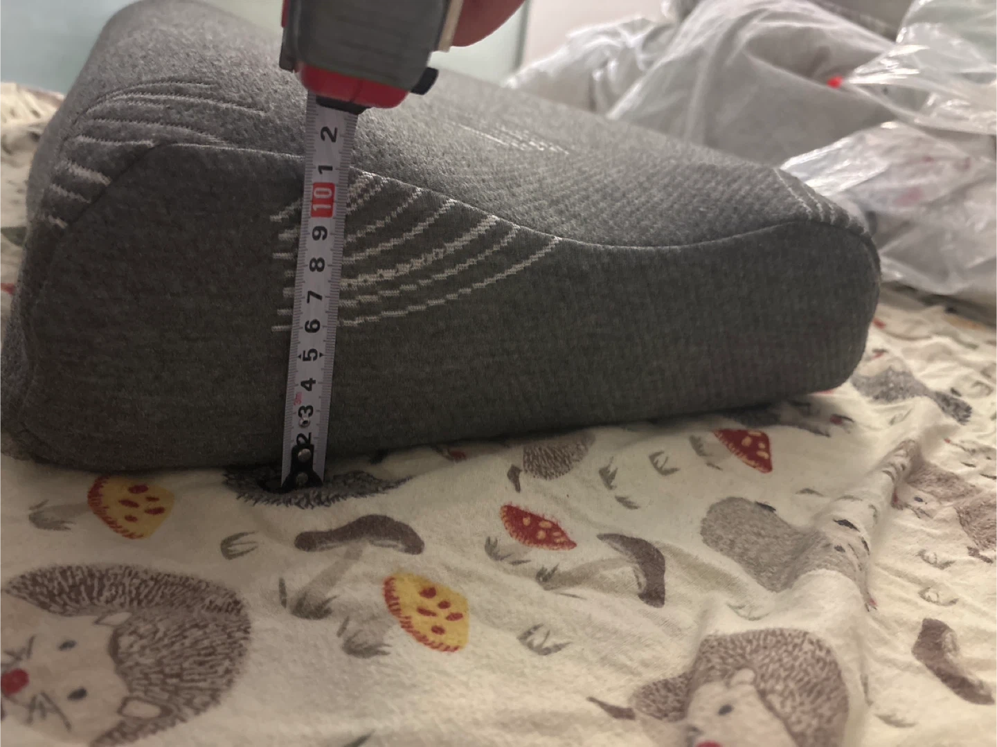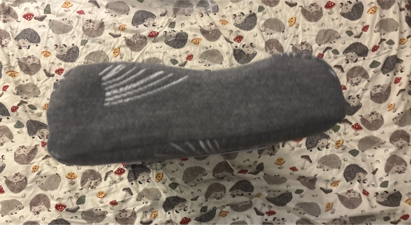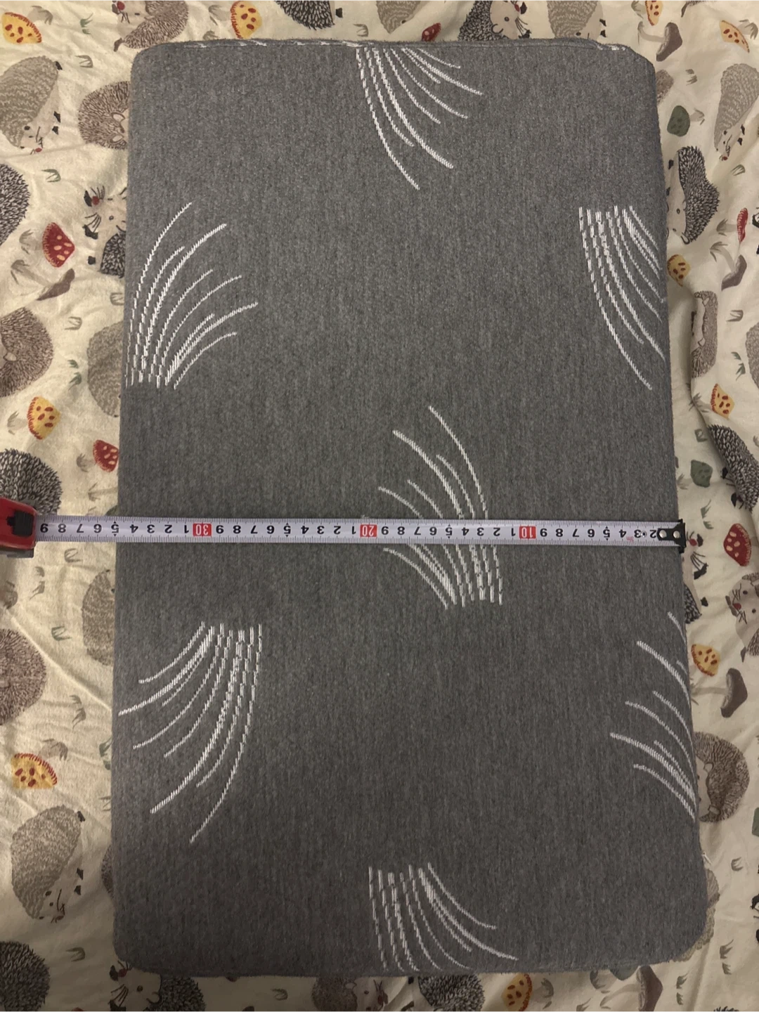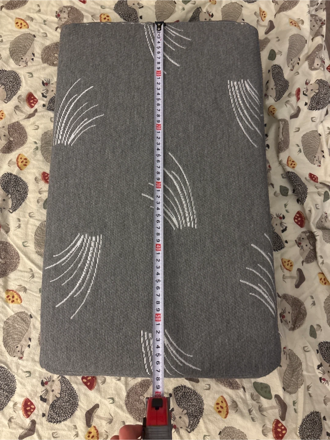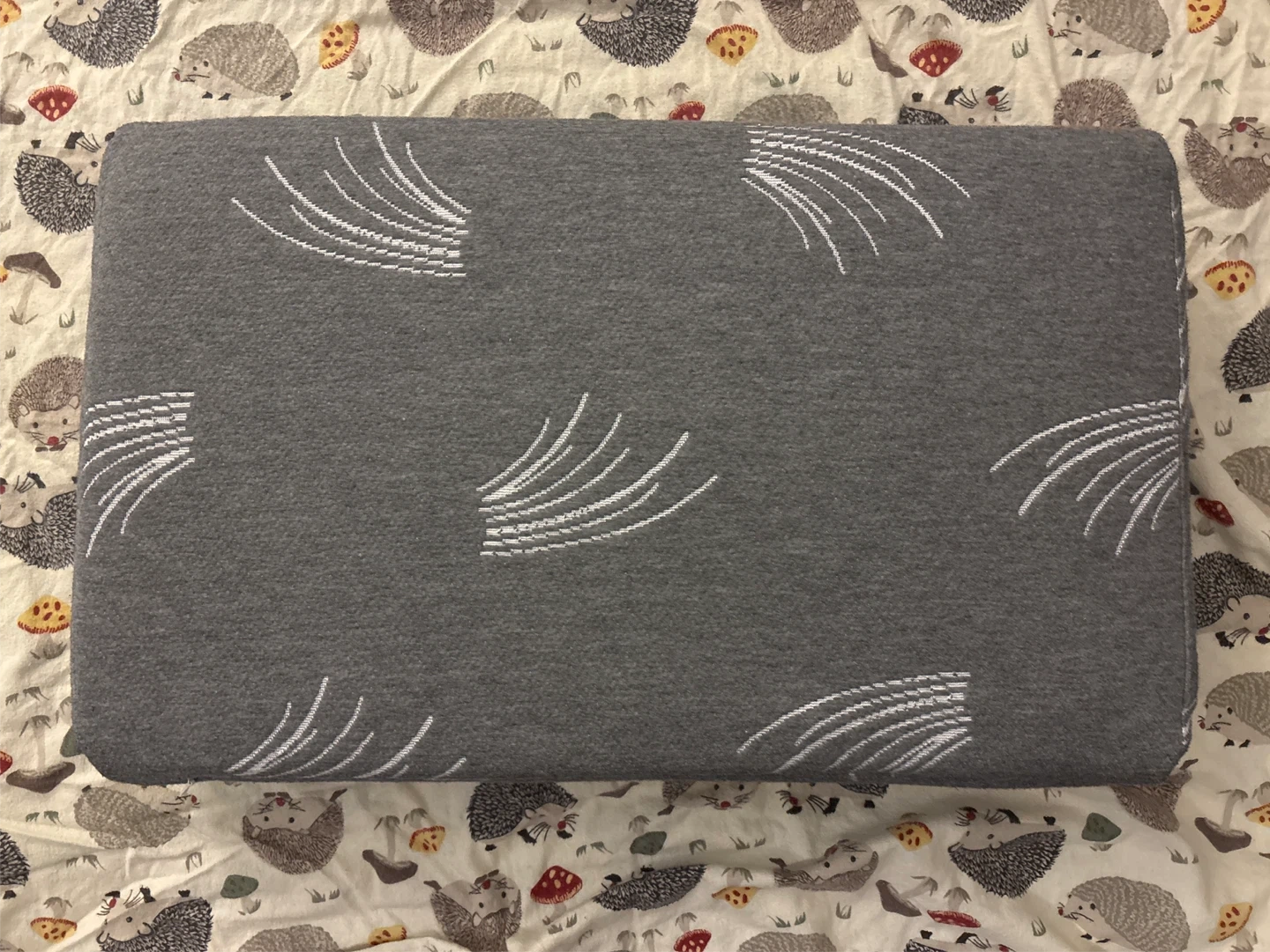 This is a grey memory pillow with a white abstract feather pattern. It's a rectangular shape and measures approximately 58 cm long by 35 cm wide. In great shape, barely used because itβs too high for my neck, usually stored with a pillow case so quite clean