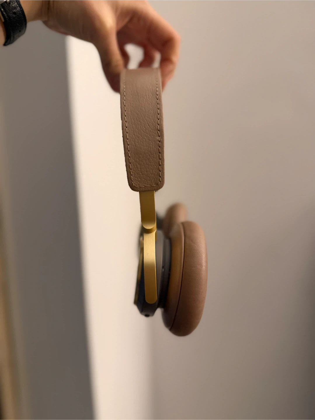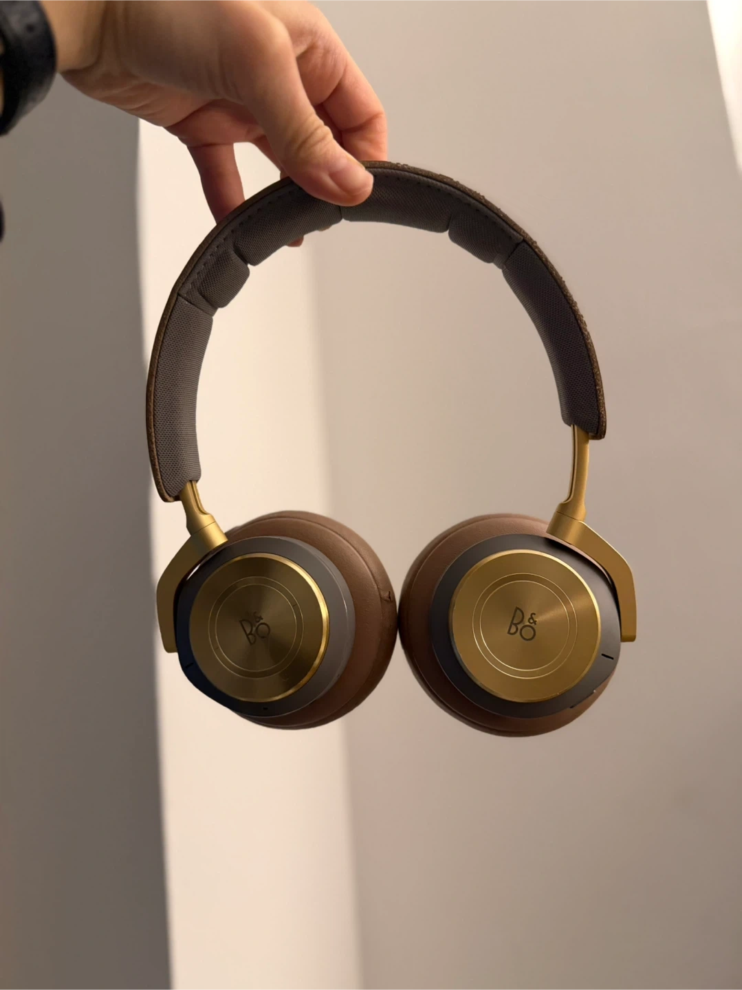 These are Bang & Olufsen Beoplay H9 headphones in a brown leather and fabric finish. They feature a padded headband and earcups for comfort. The gold accents add a touch of luxury.