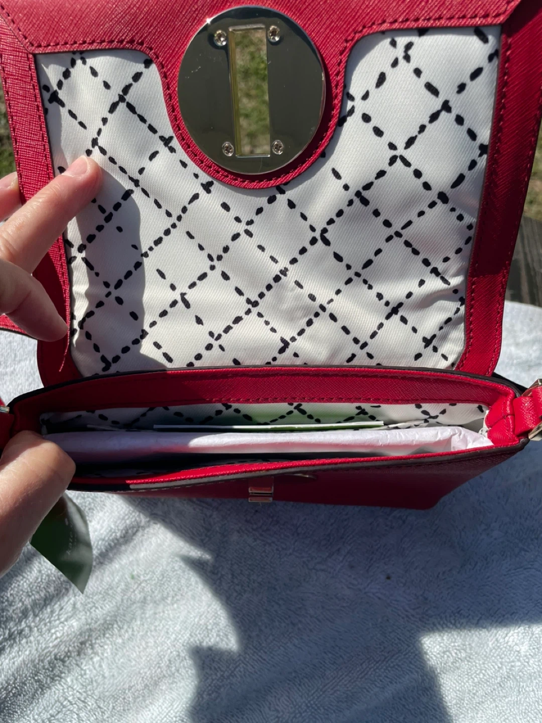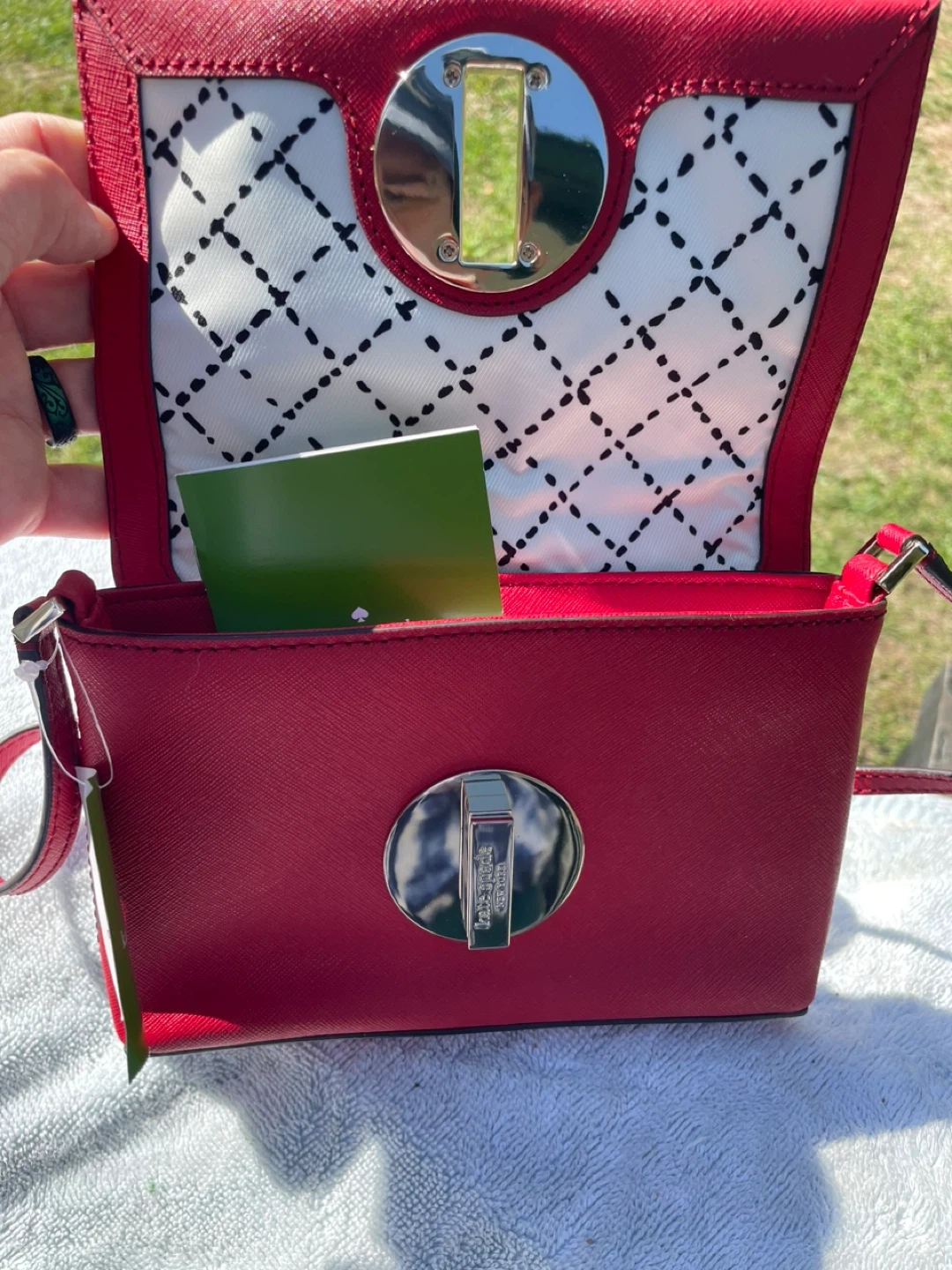 This Kate Spade crossbody bag is crafted from durable red saffiano leather. It features a classic turn-lock closure and a patterned interior lining. The compact size makes it perfect for carrying essentials.