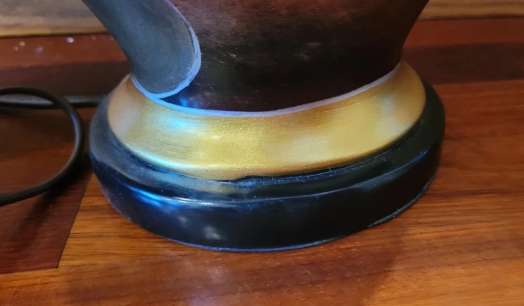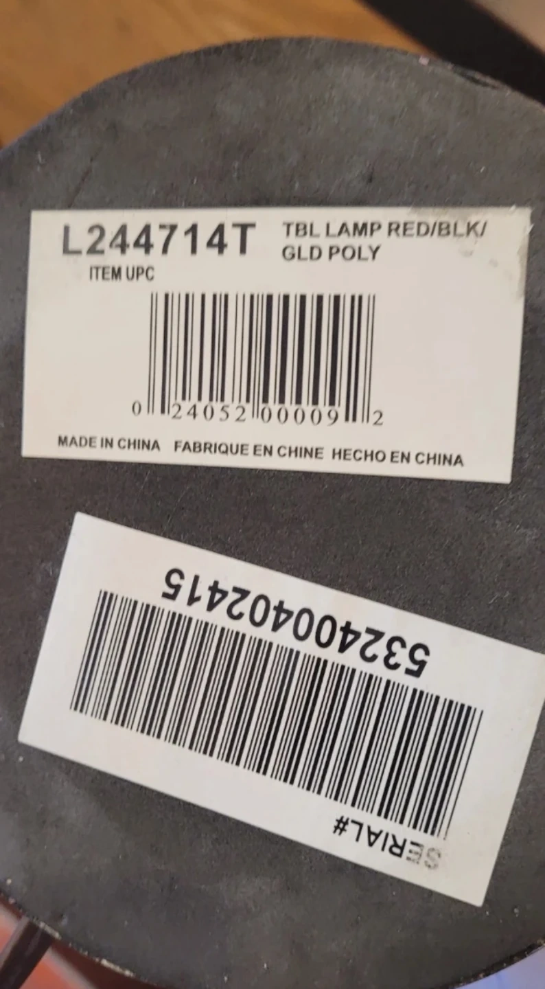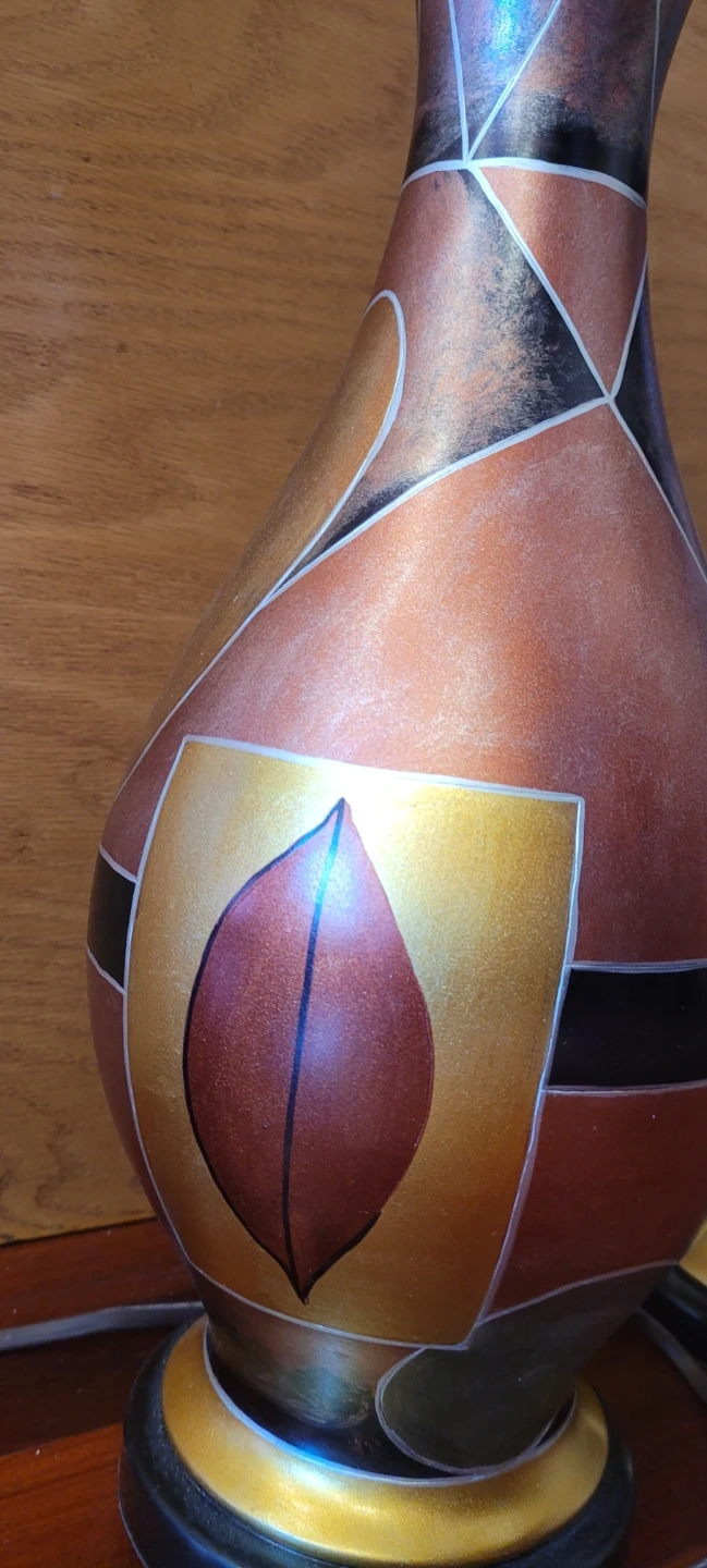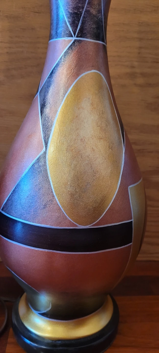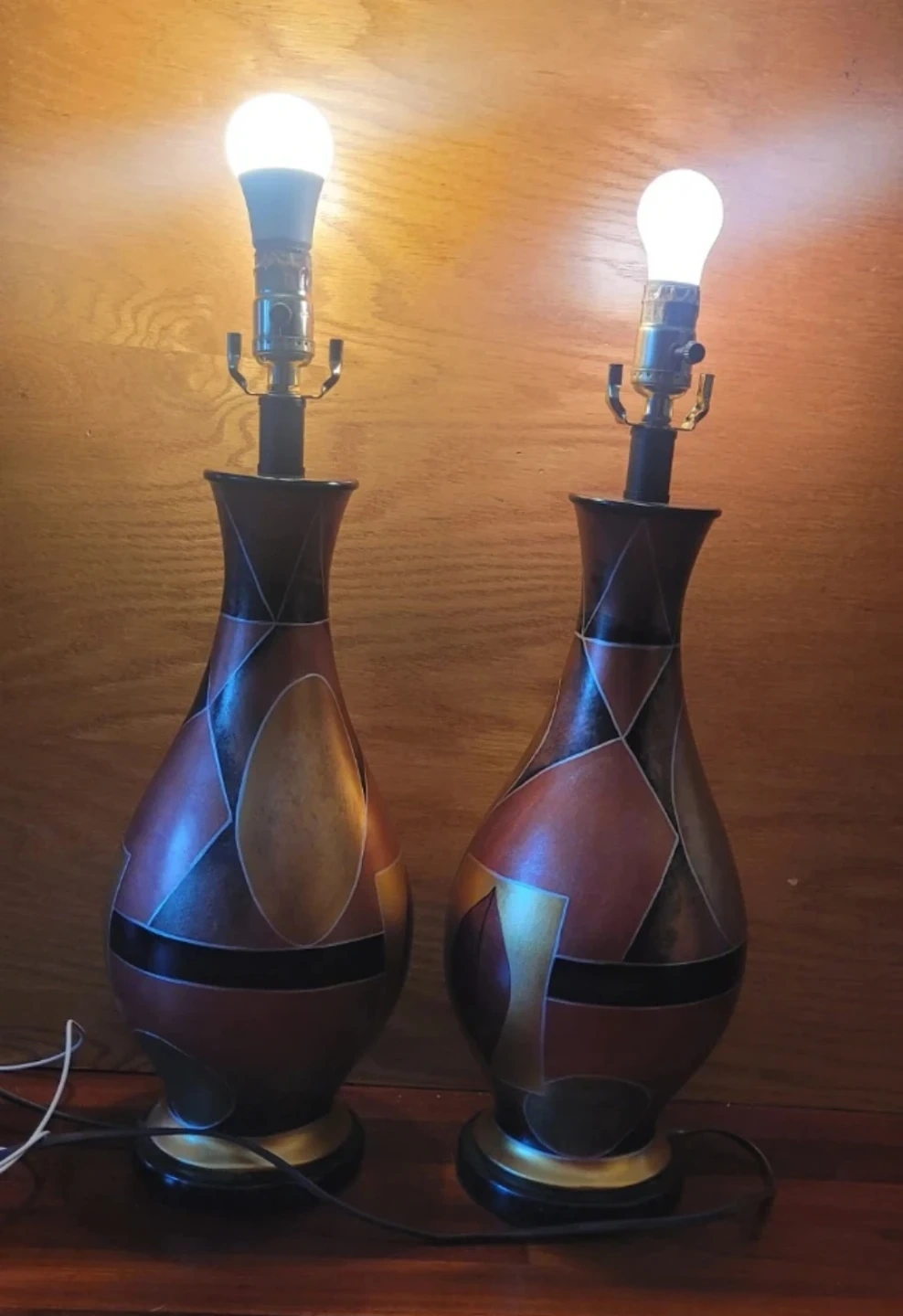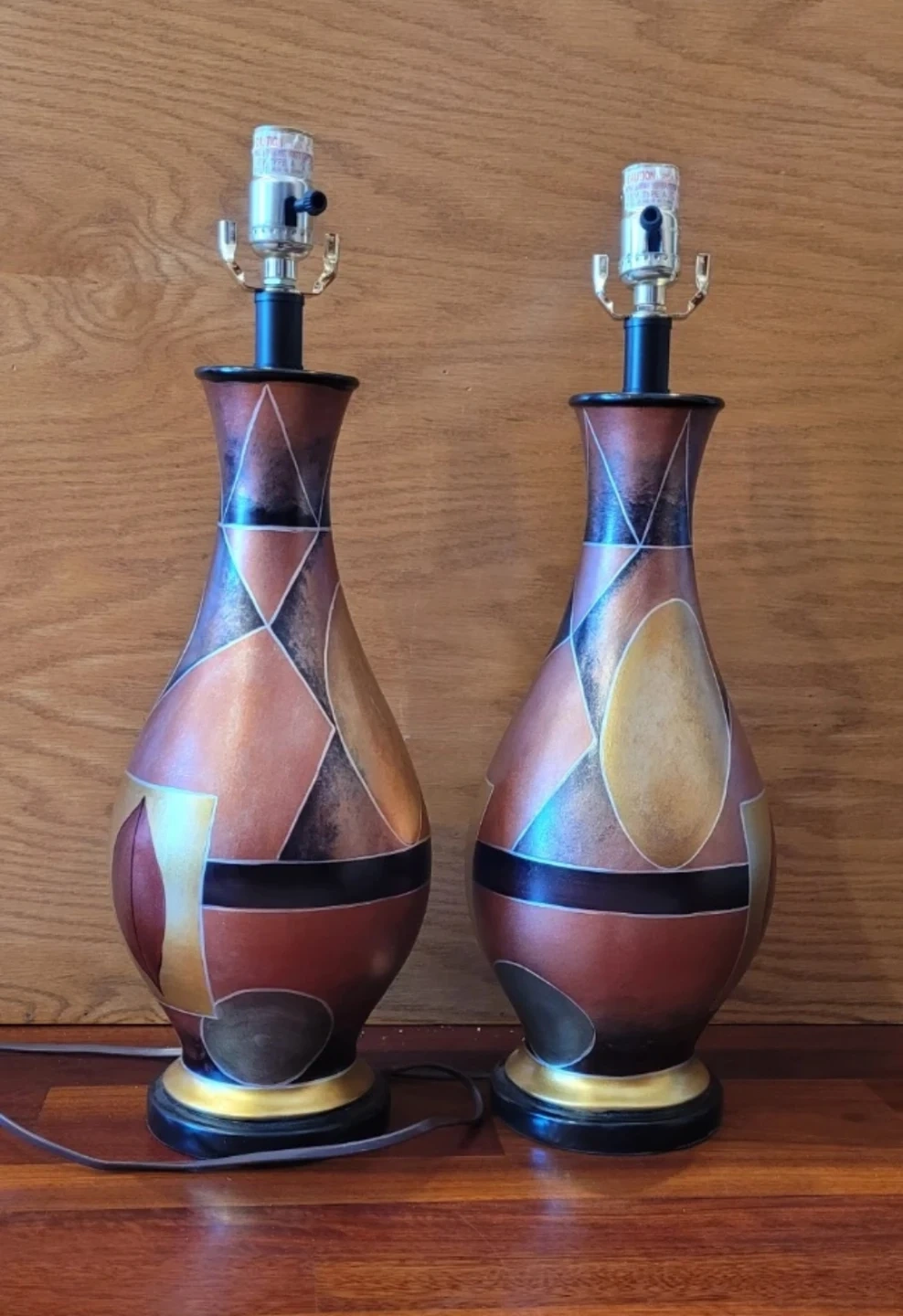 This set includes two decorative table lamps. They're made of poly resin with a red, black, and gold geometric design.