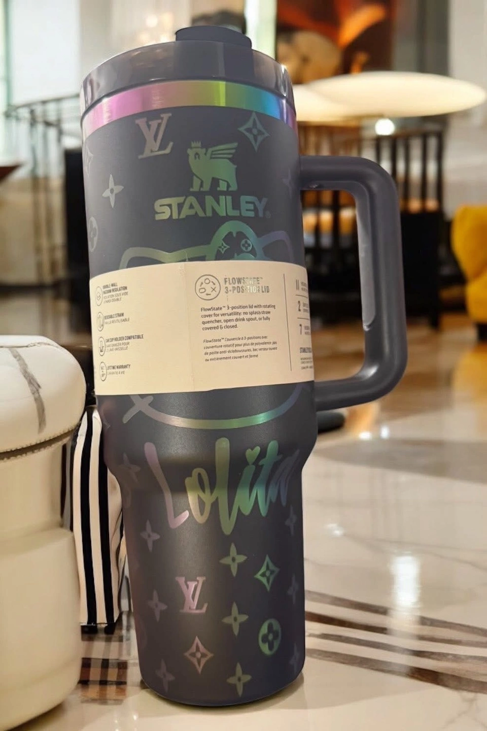 This is a Stanley tumbler with a Hello Kitty Lolita design. It features the FlowState 3-position lid with three positions: straw opening, wide mouth, and full cover to prevent spills